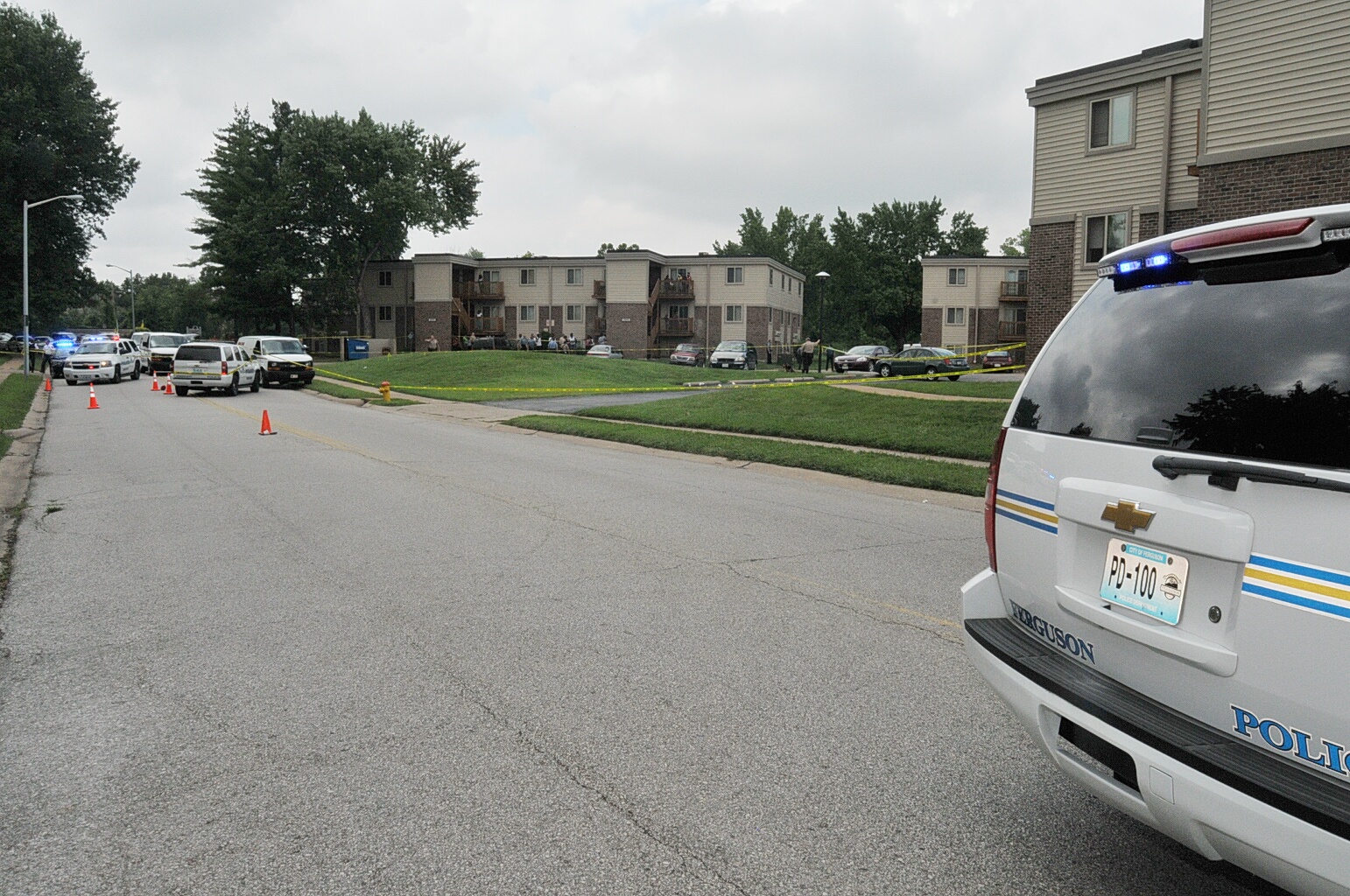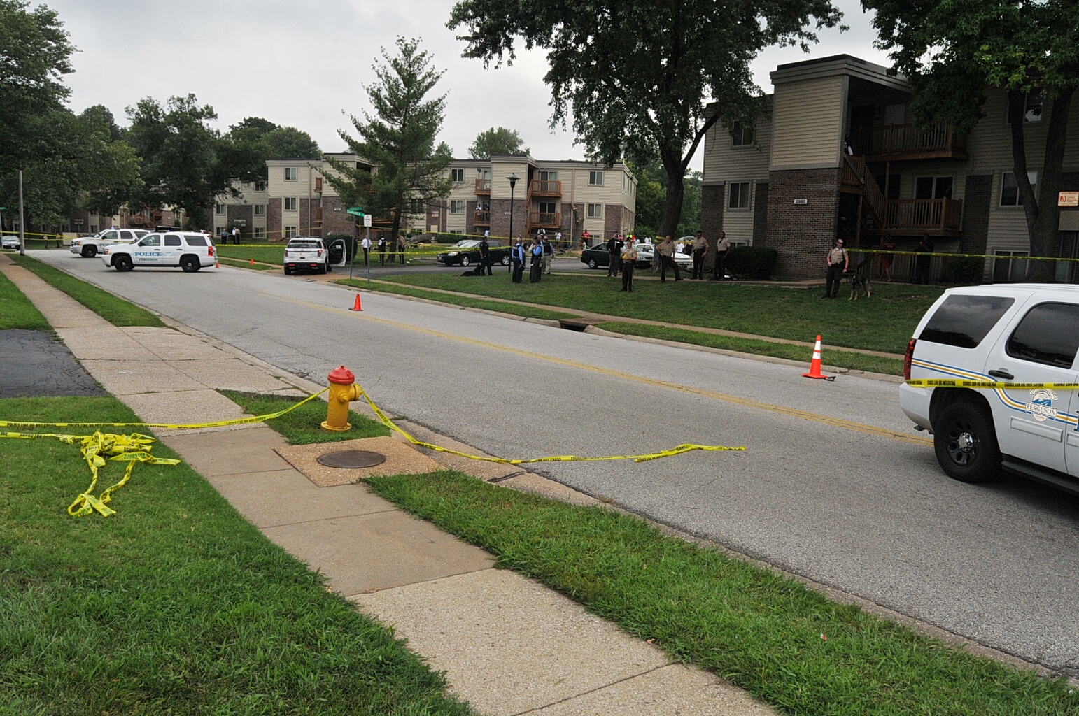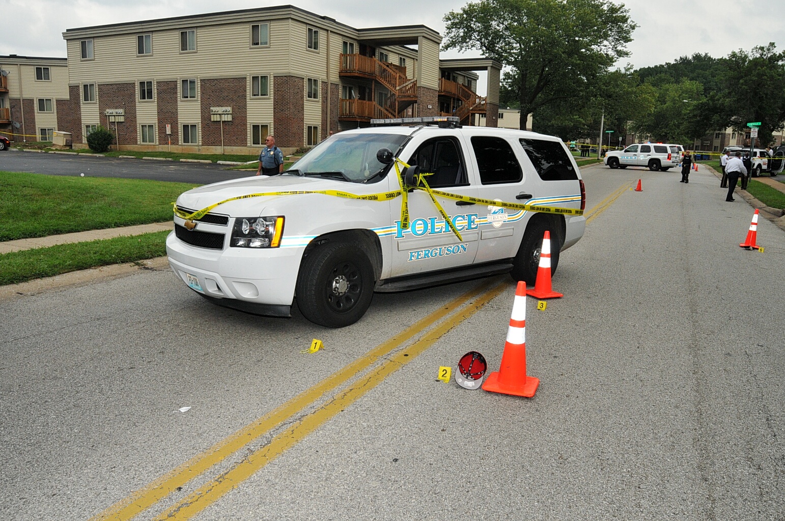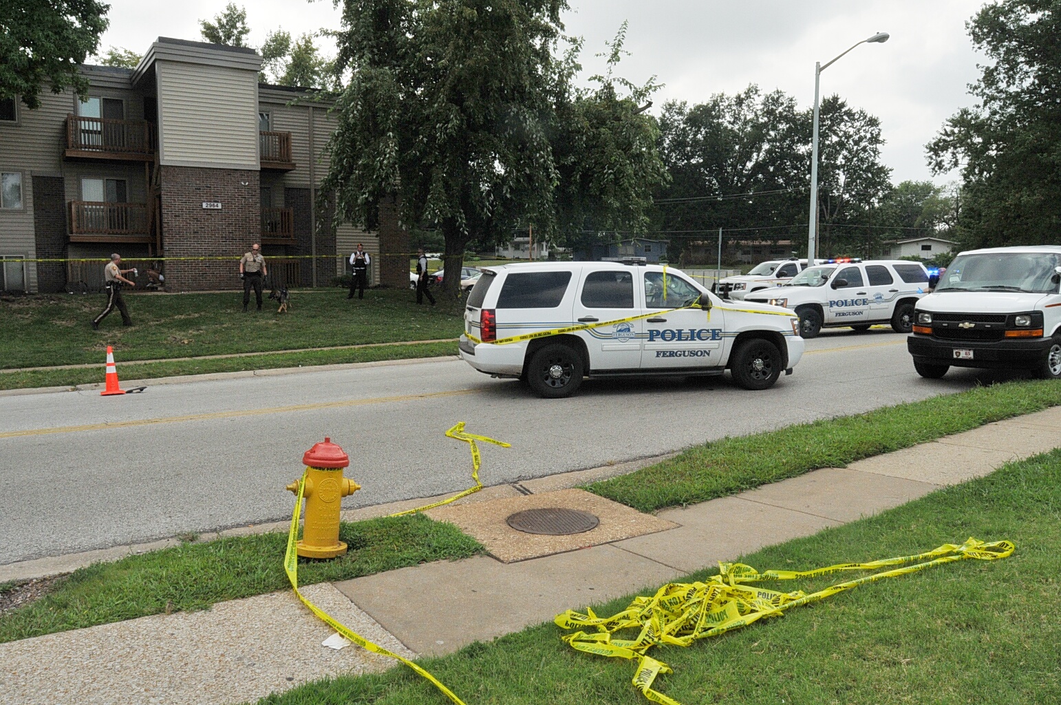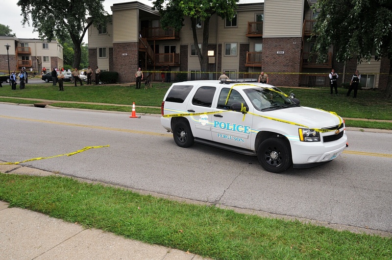 Case: State of Missouri v Darren Wilson. Photos : police cars and yellow tape blocking street