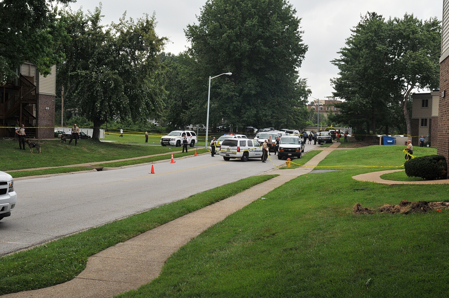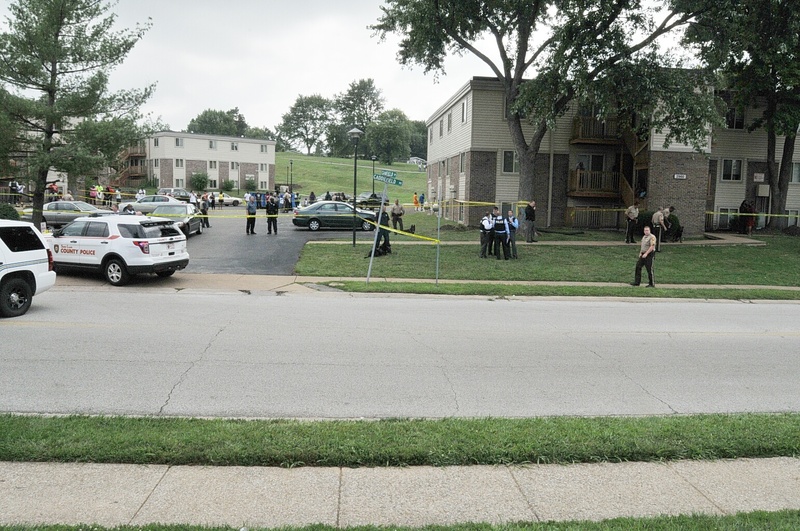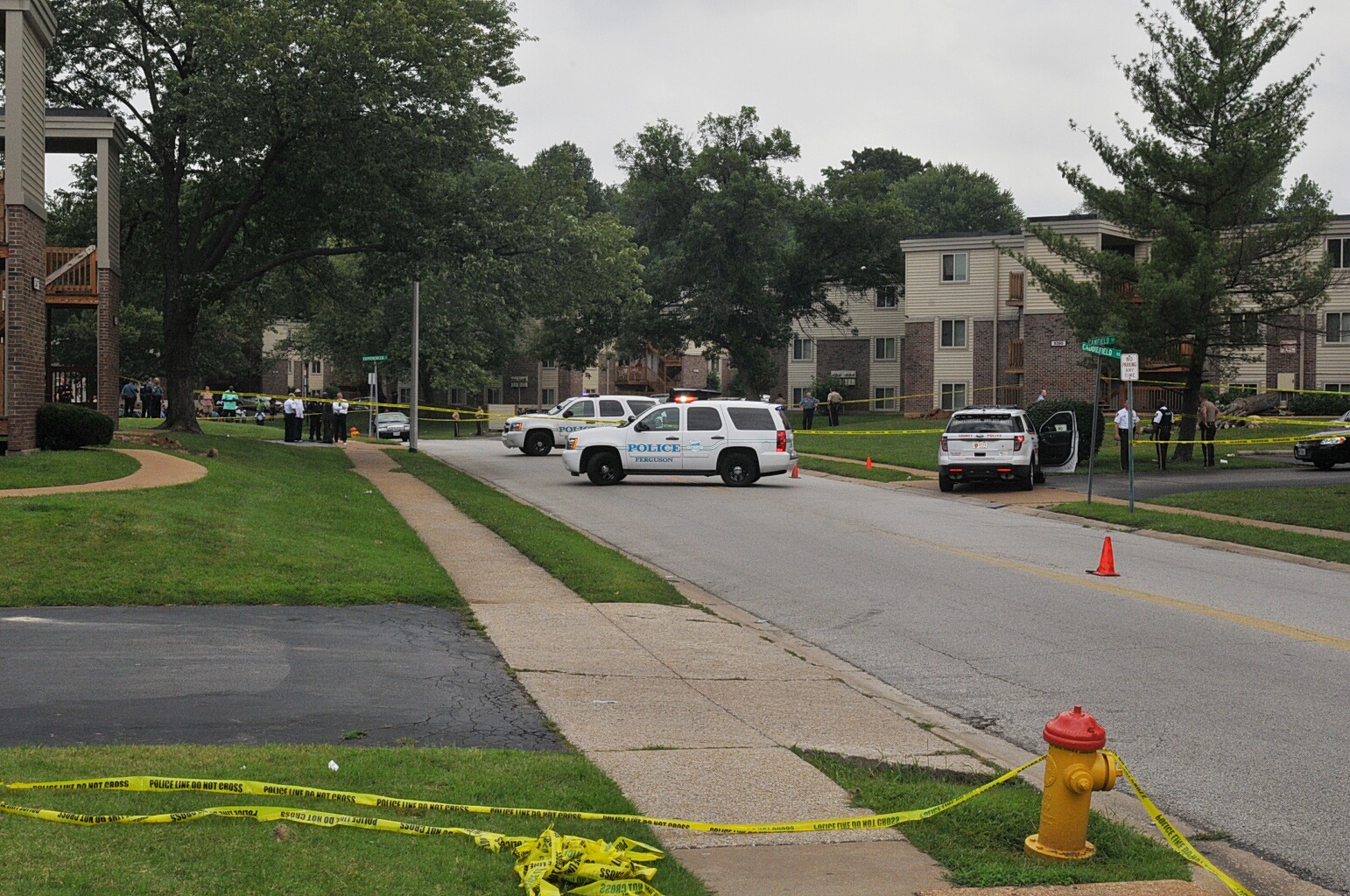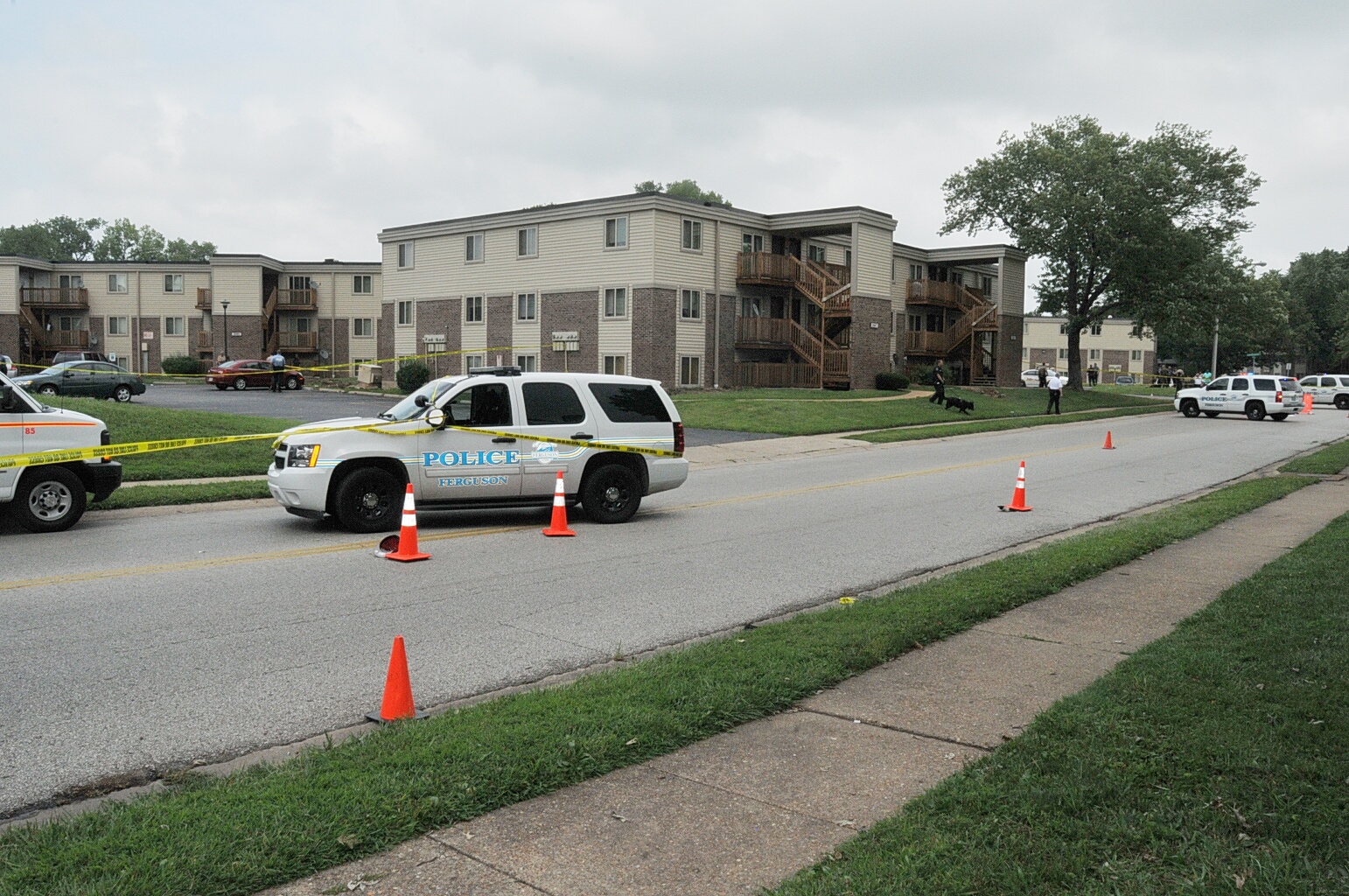 Case: State of Missouri v Darren Wilson. Photos : police cars and yellow tape blocking street