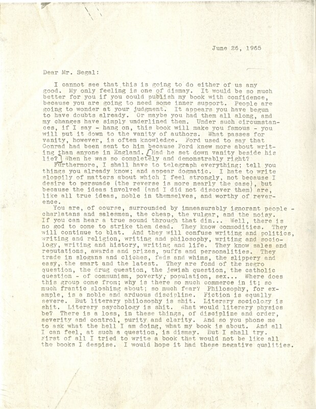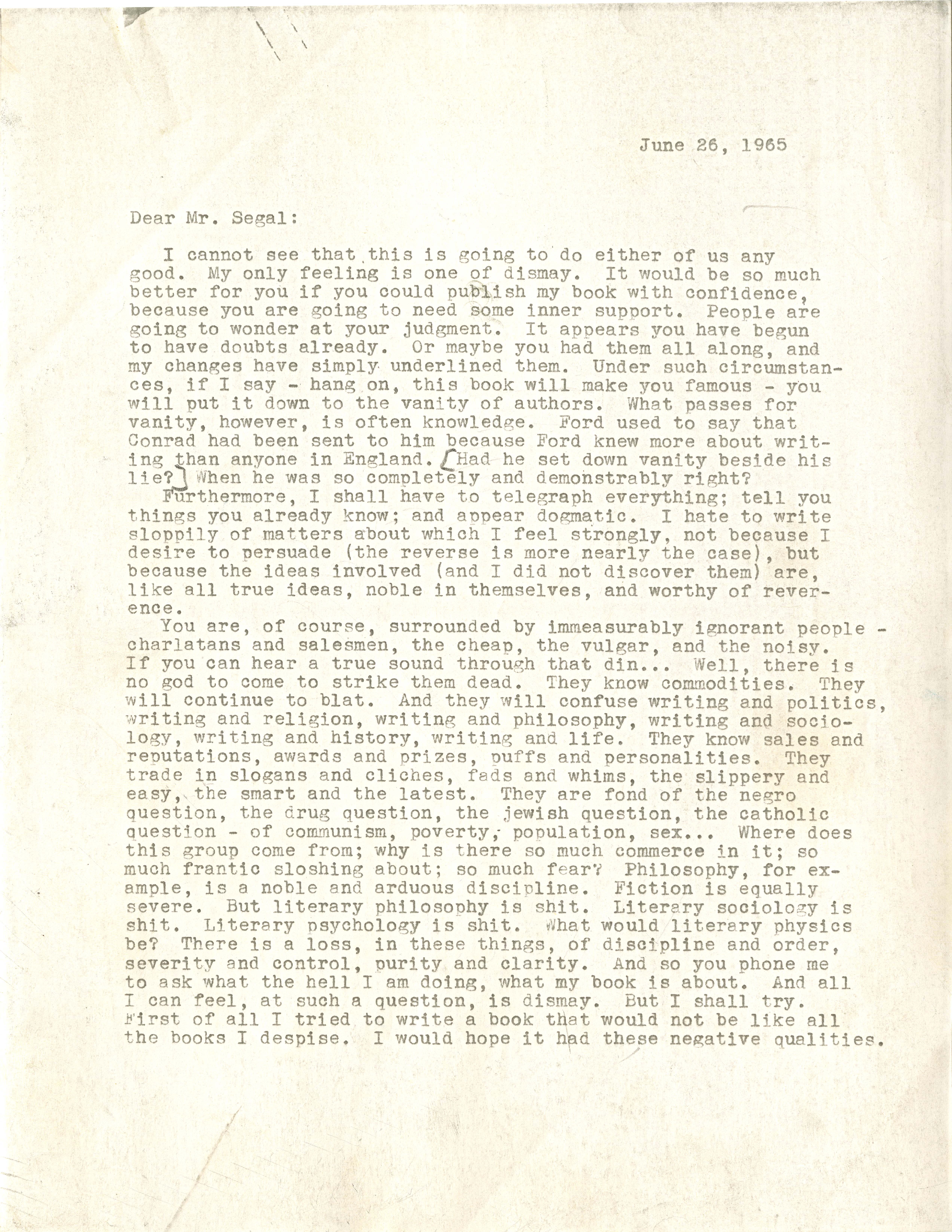 Gass, William H. 1965. “Correspondence With David Segal, June 26, 1965.”, William H. Gass: The Soul Inside the Sentence, accessed February 13, 2026, https://digitalexhibits.library.wustl.edu/s/gass/item/14420