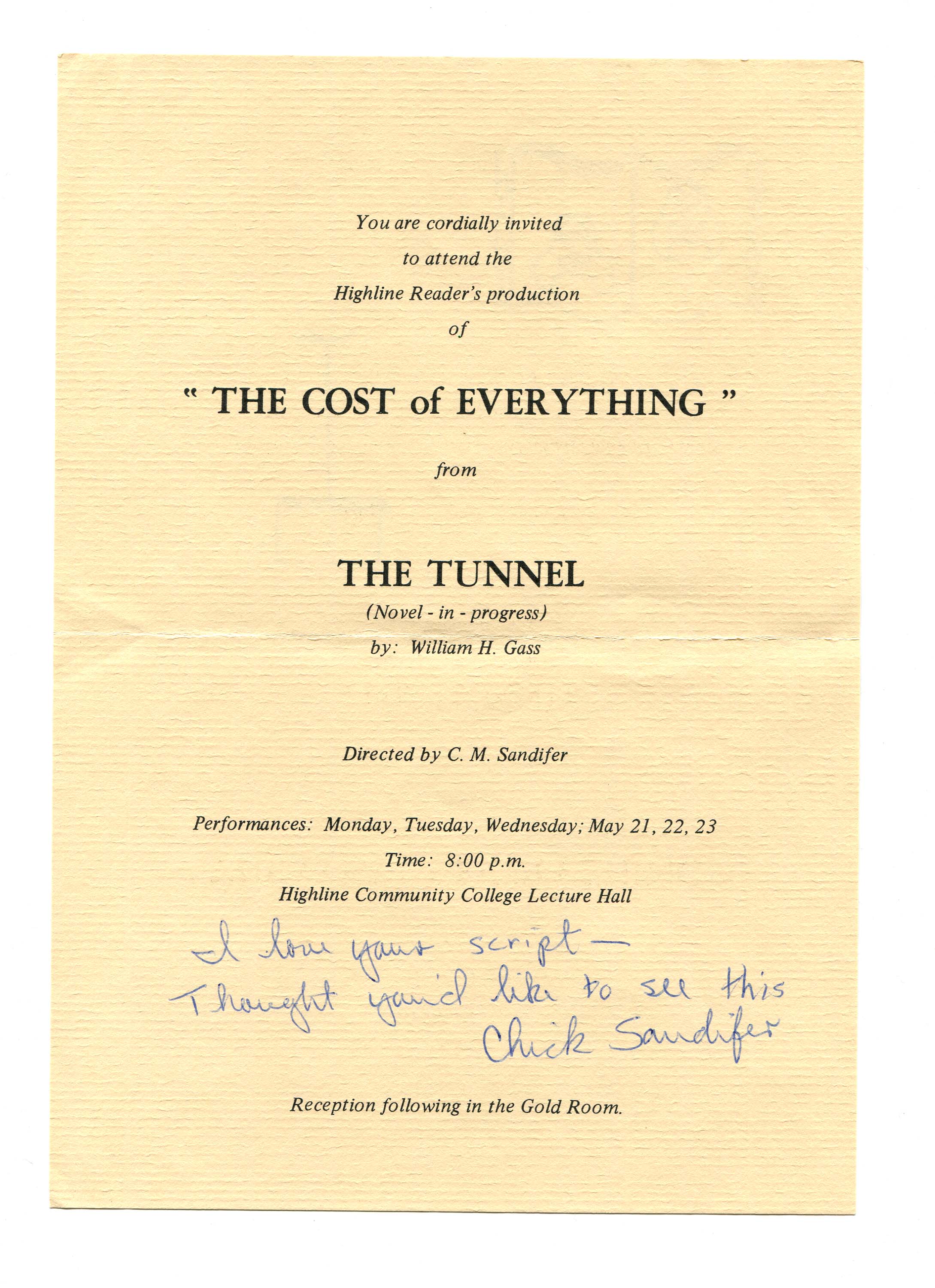 Gass, William H. “‘Cost of Everything’ by The Highline Readers”. Highline Community College, William H. Gass: The Soul Inside the Sentence, accessed February 12, 2026, https://digitalexhibits.library.wustl.edu/s/gass/item/14428