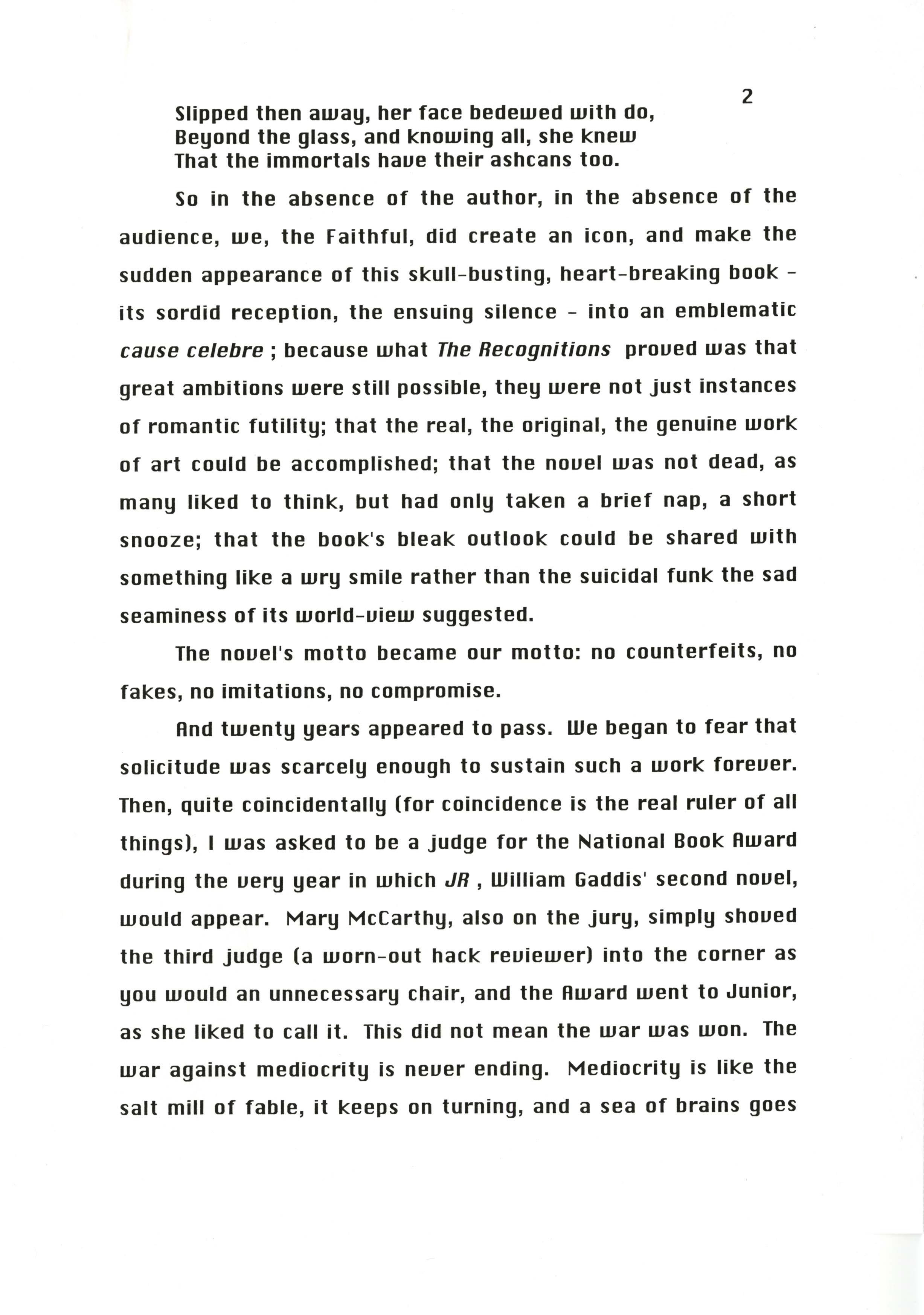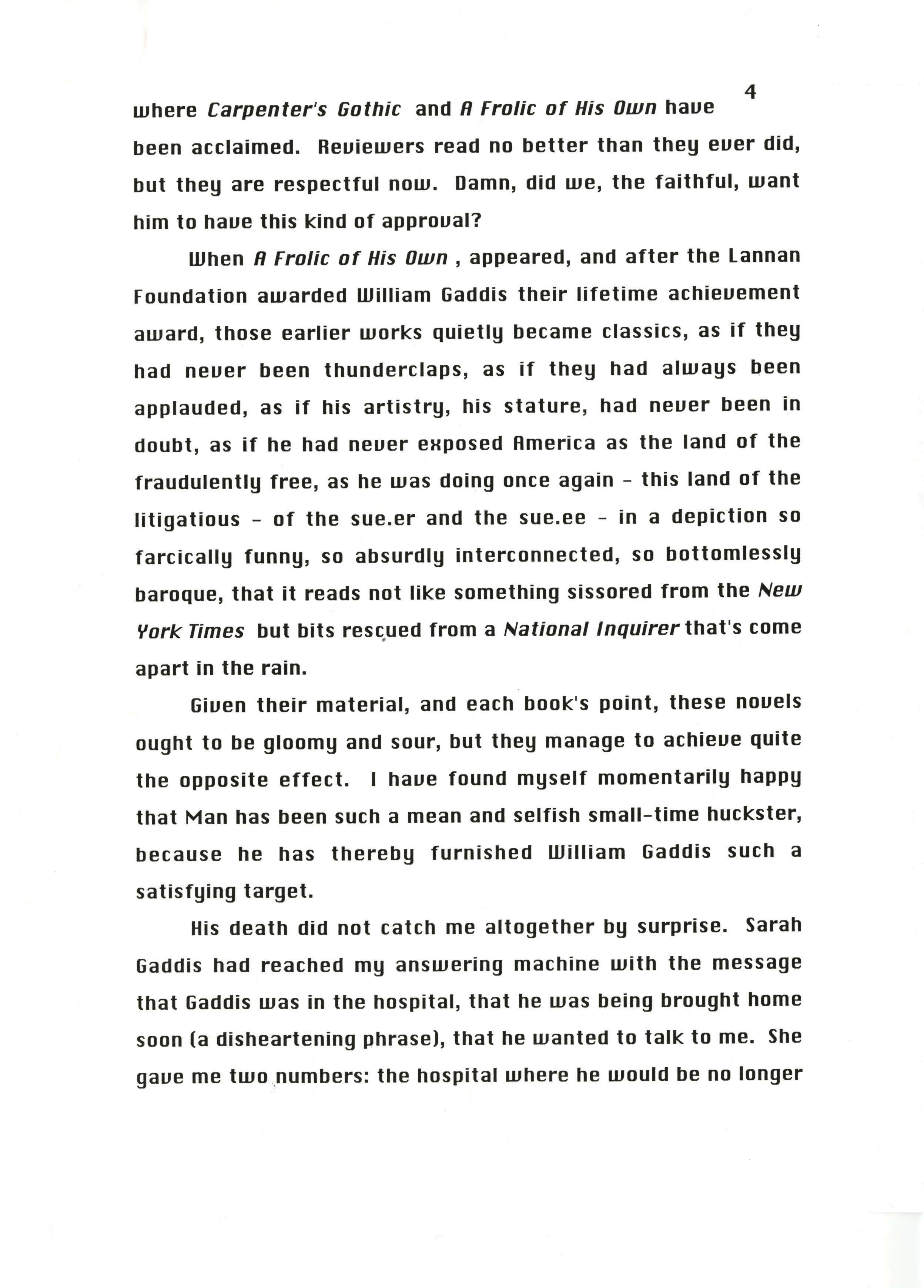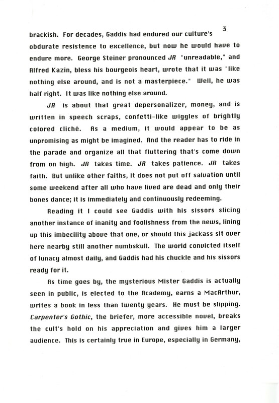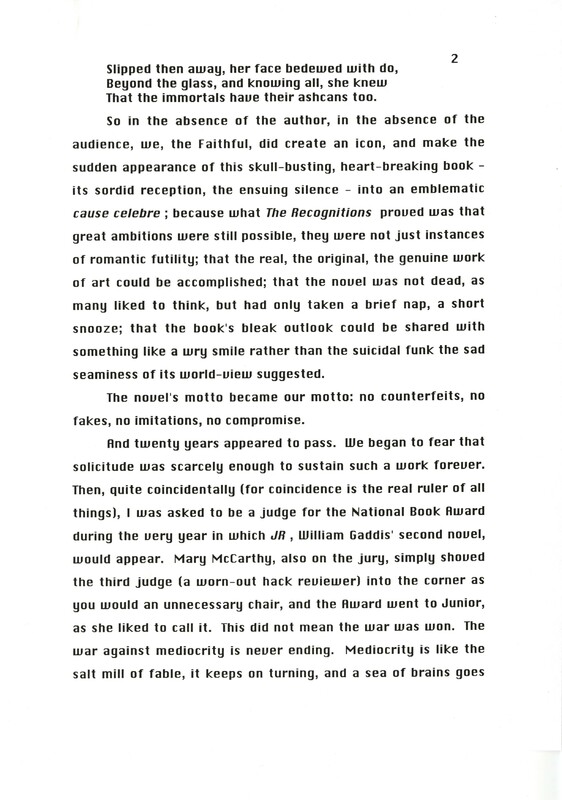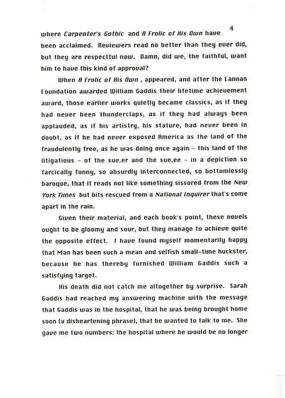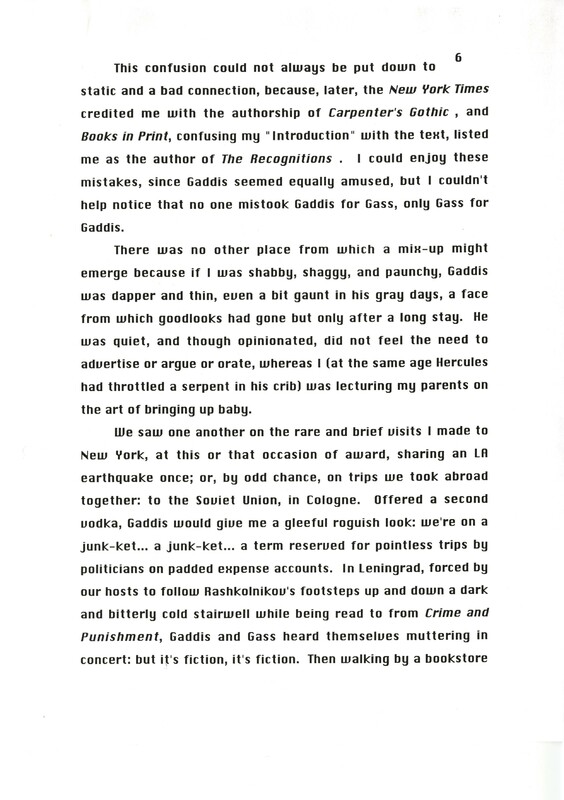 Gass, William H. 1999. “‘Memories of Master Gaddis’.”, William H. Gass: The Soul Inside the Sentence, accessed February 11, 2026, https://digitalexhibits.library.wustl.edu/s/gass/item/14430