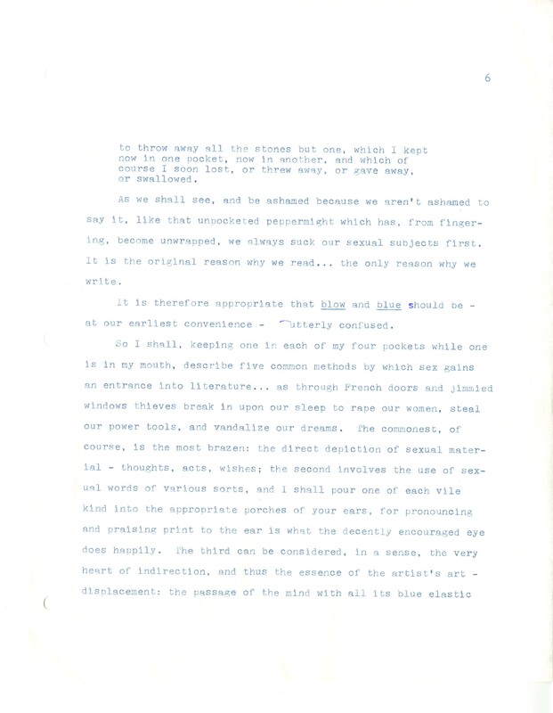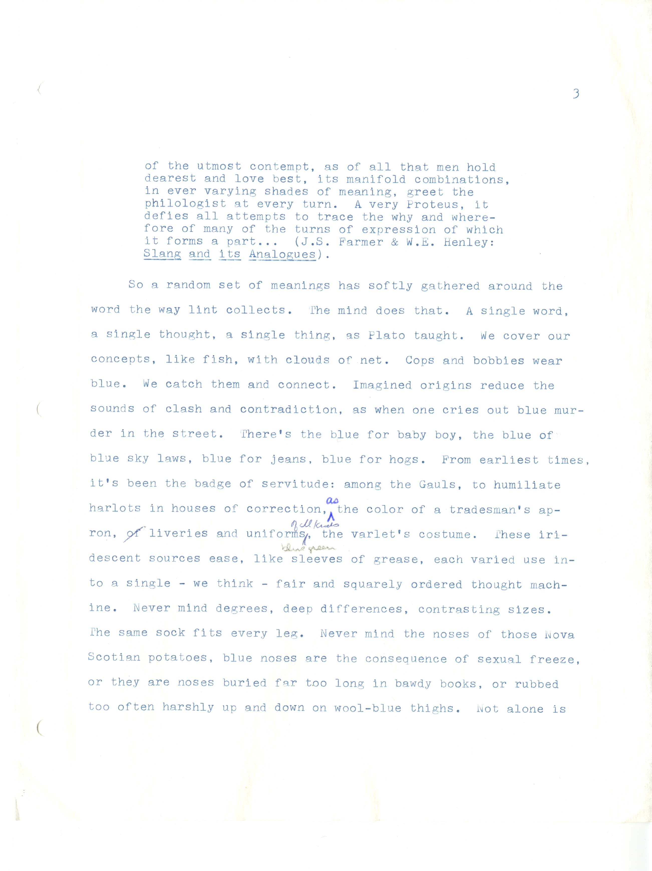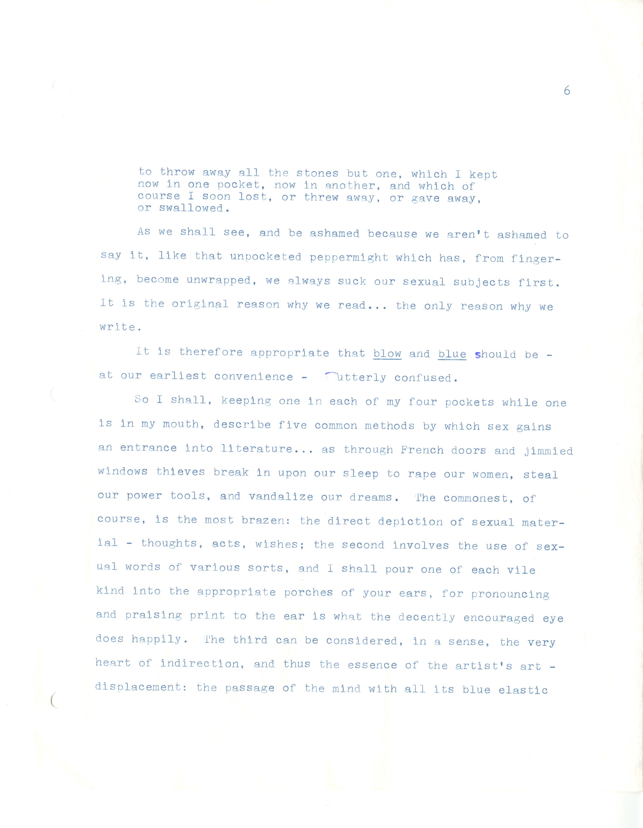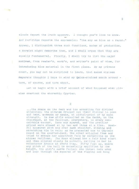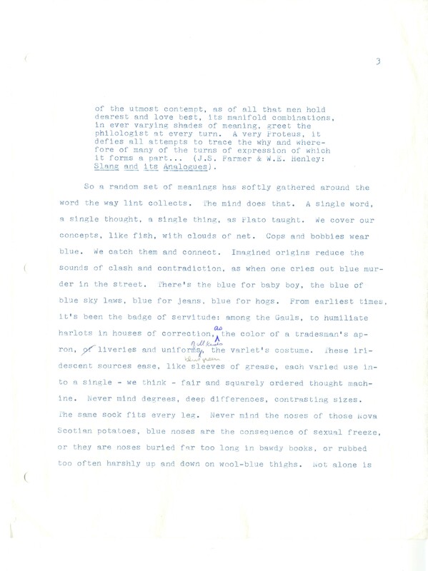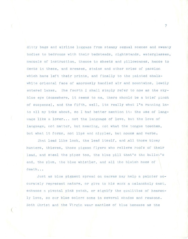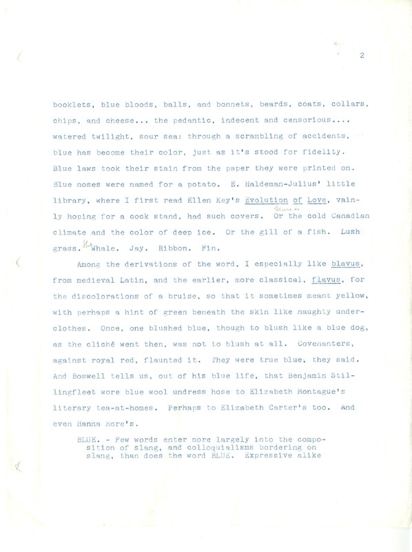 Gass, William H., “On Being Blue - Typescript Draft and Fragments”, Not dated, William H. Gass: The Soul Inside the Sentence, accessed February 11, 2026, https://digitalexhibits.library.wustl.edu/s/gass/item/14433