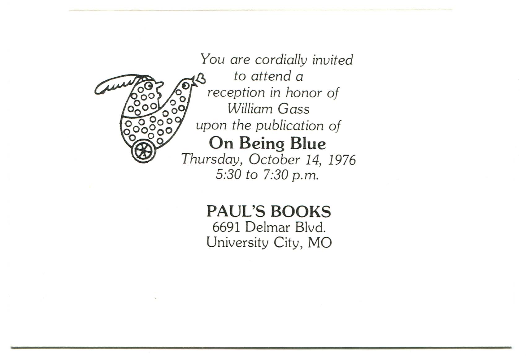 Gass, William H. 1976. “On Being Blue - Invitation, Paul’s Books.”, William H. Gass: The Soul Inside the Sentence, accessed February 11, 2026, https://digitalexhibits.library.wustl.edu/s/gass/item/14442