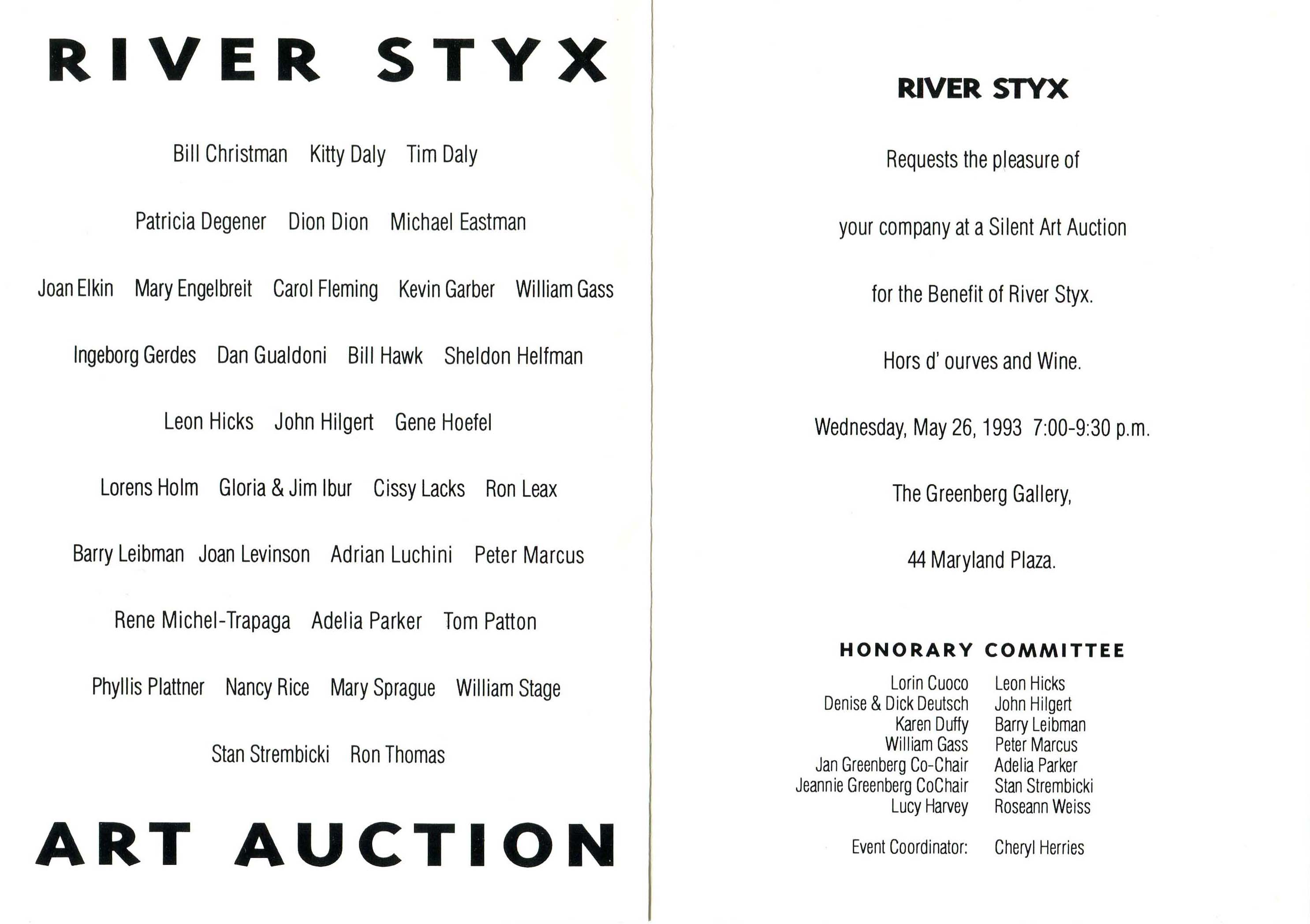 “River Styx Silent Art Auction Invitation”. 1993, William H. Gass: The Soul Inside the Sentence, accessed February 11, 2026, https://digitalexhibits.library.wustl.edu/s/gass/item/14445