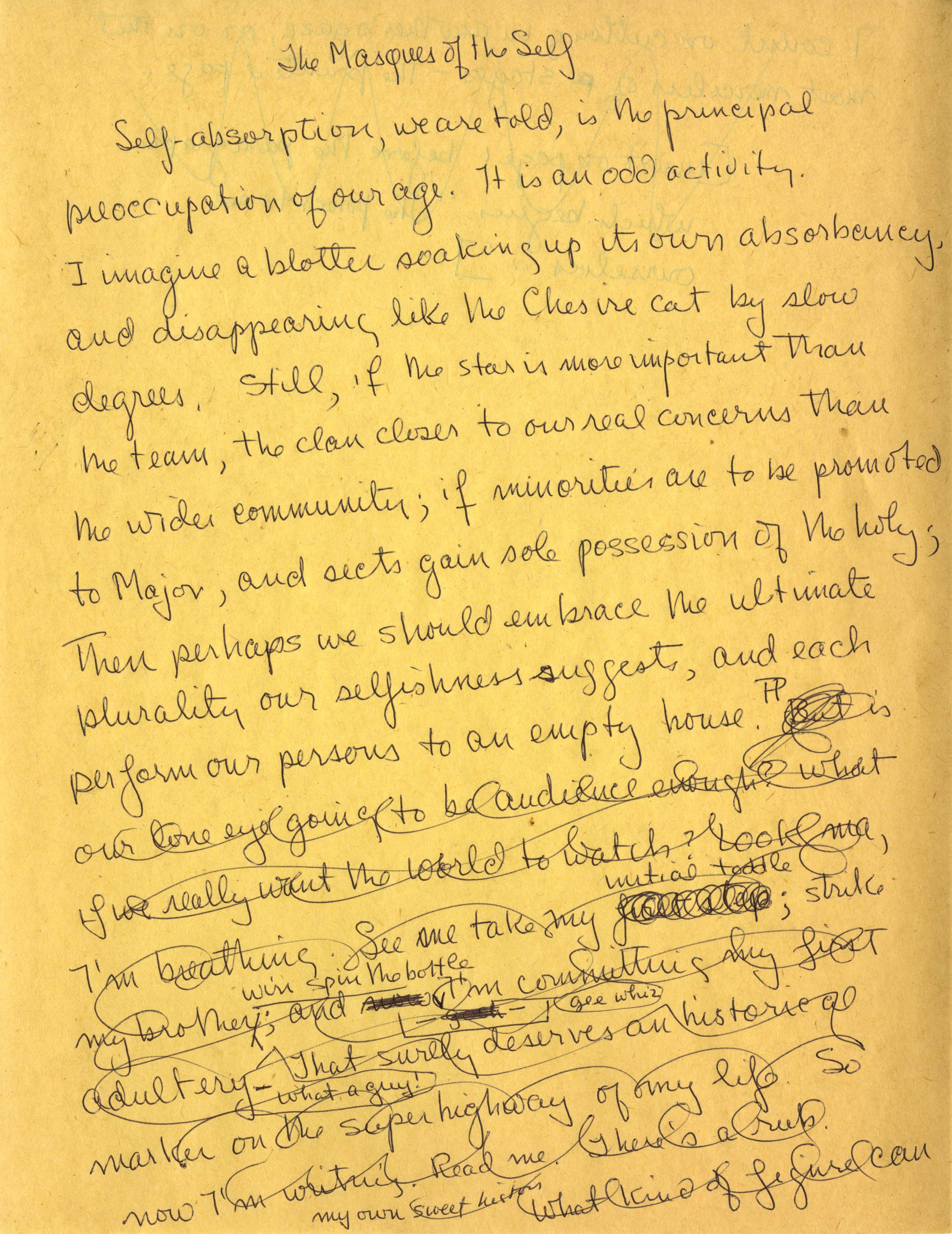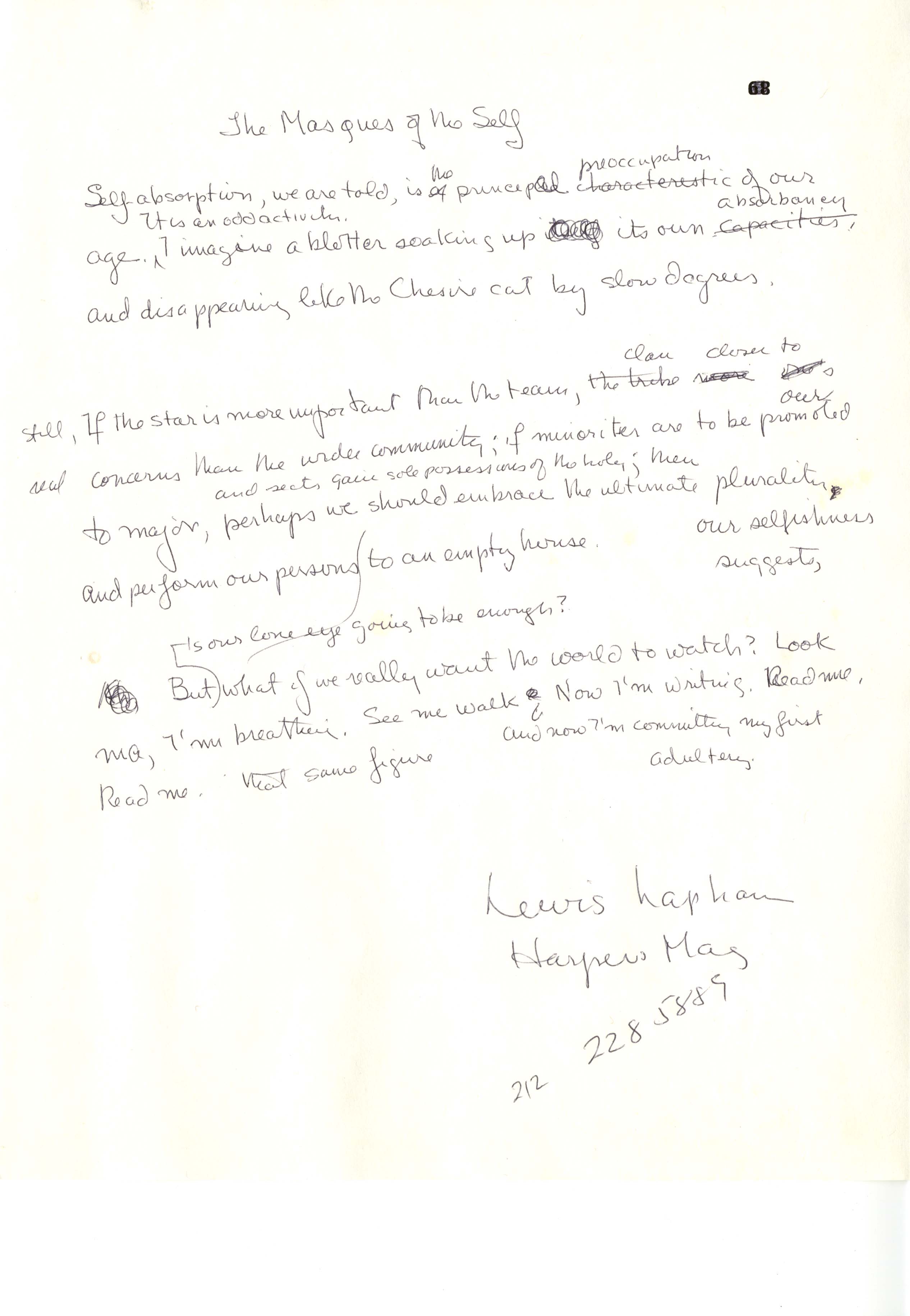 Gass, William H. “‘The Masques of the Self’ - Autograph Draft”. Harper’s Magazine, William H. Gass: The Soul Inside the Sentence, accessed February 11, 2026, https://digitalexhibits.library.wustl.edu/s/gass/item/14453