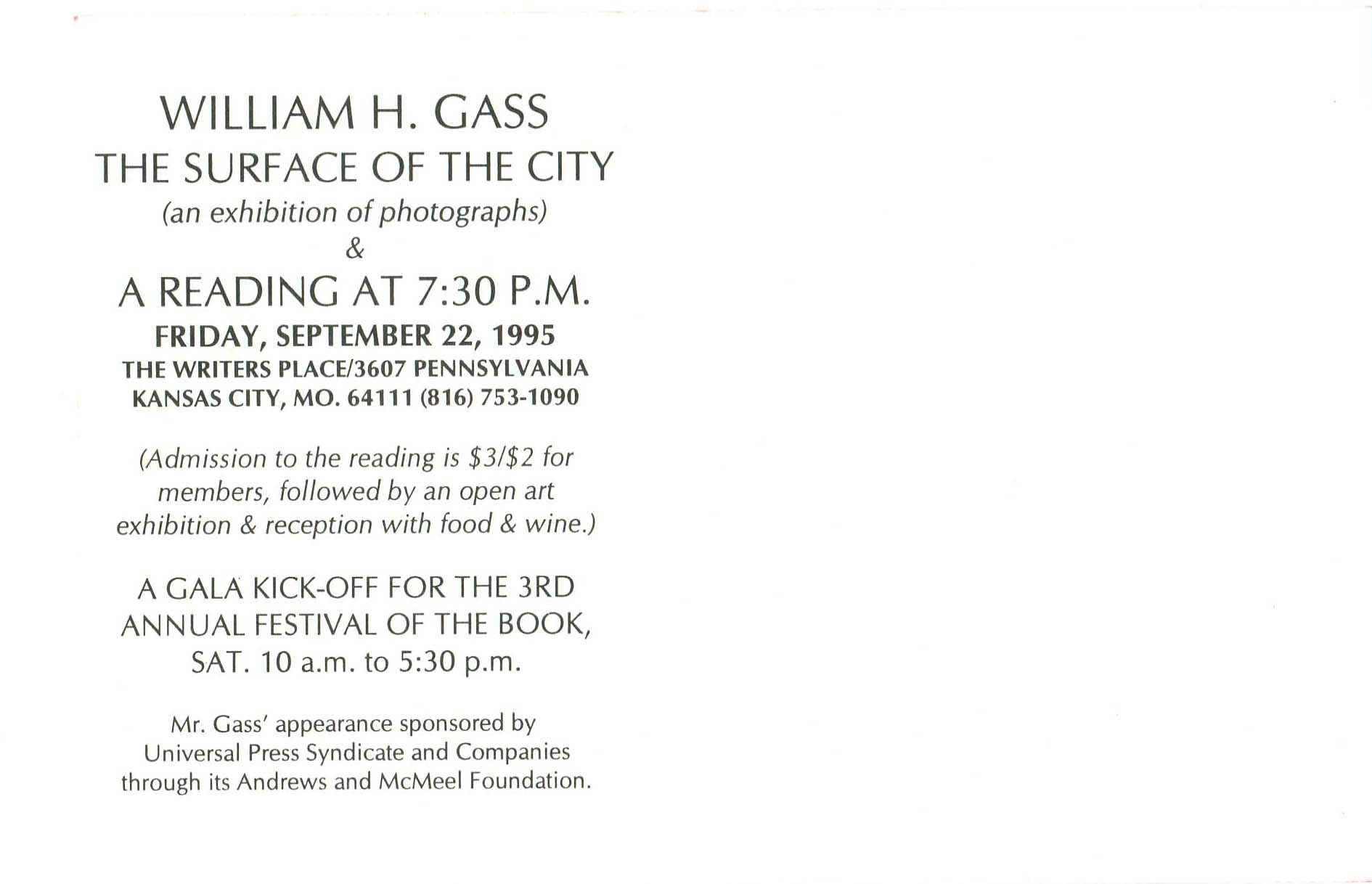 The Writers Place. 1995. “‘The Surface of the City’ - Photograph Exhibition and Reading Invitation”. The Writers Place, William H. Gass: The Soul Inside the Sentence, accessed February 10, 2026, https://digitalexhibits.library.wustl.edu/s/gass/item/14454