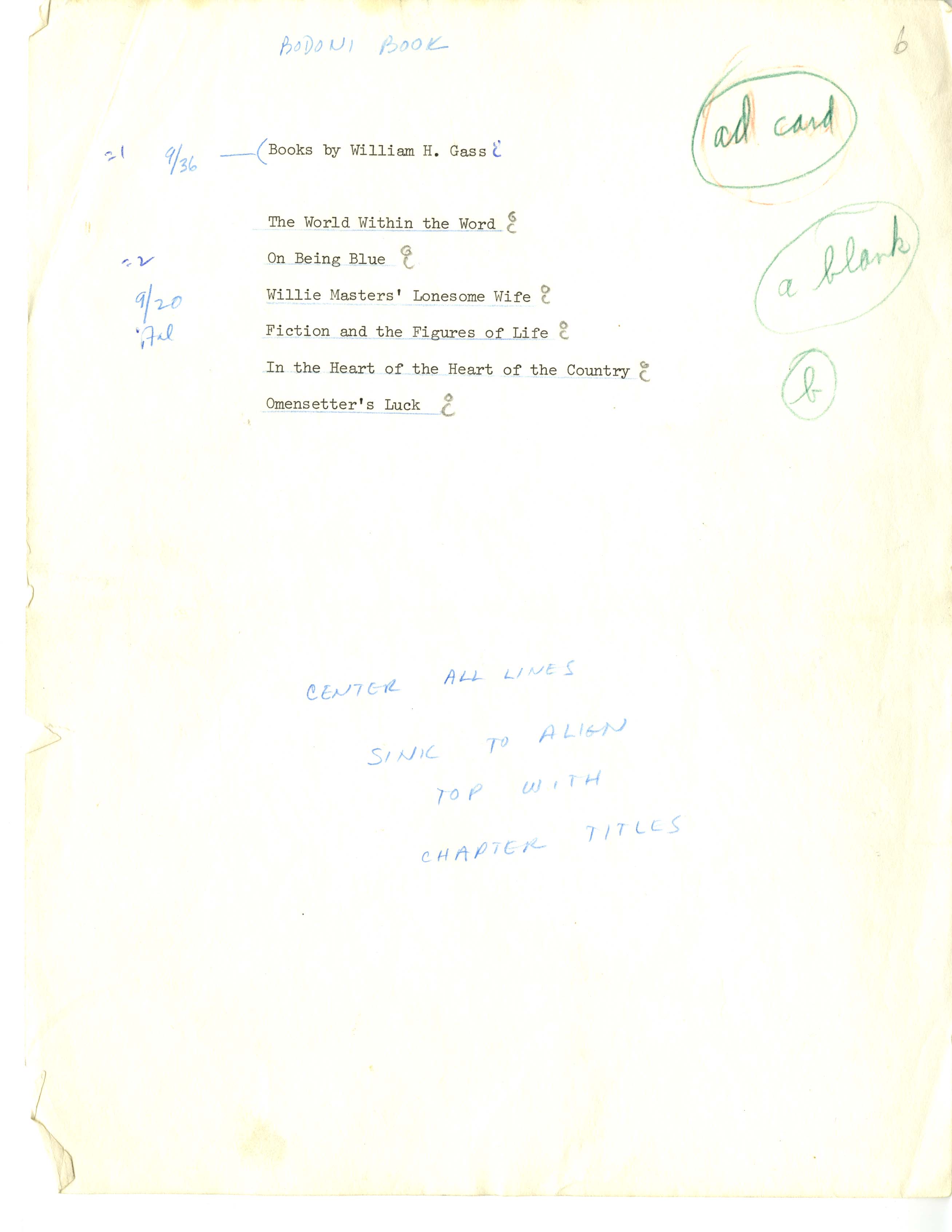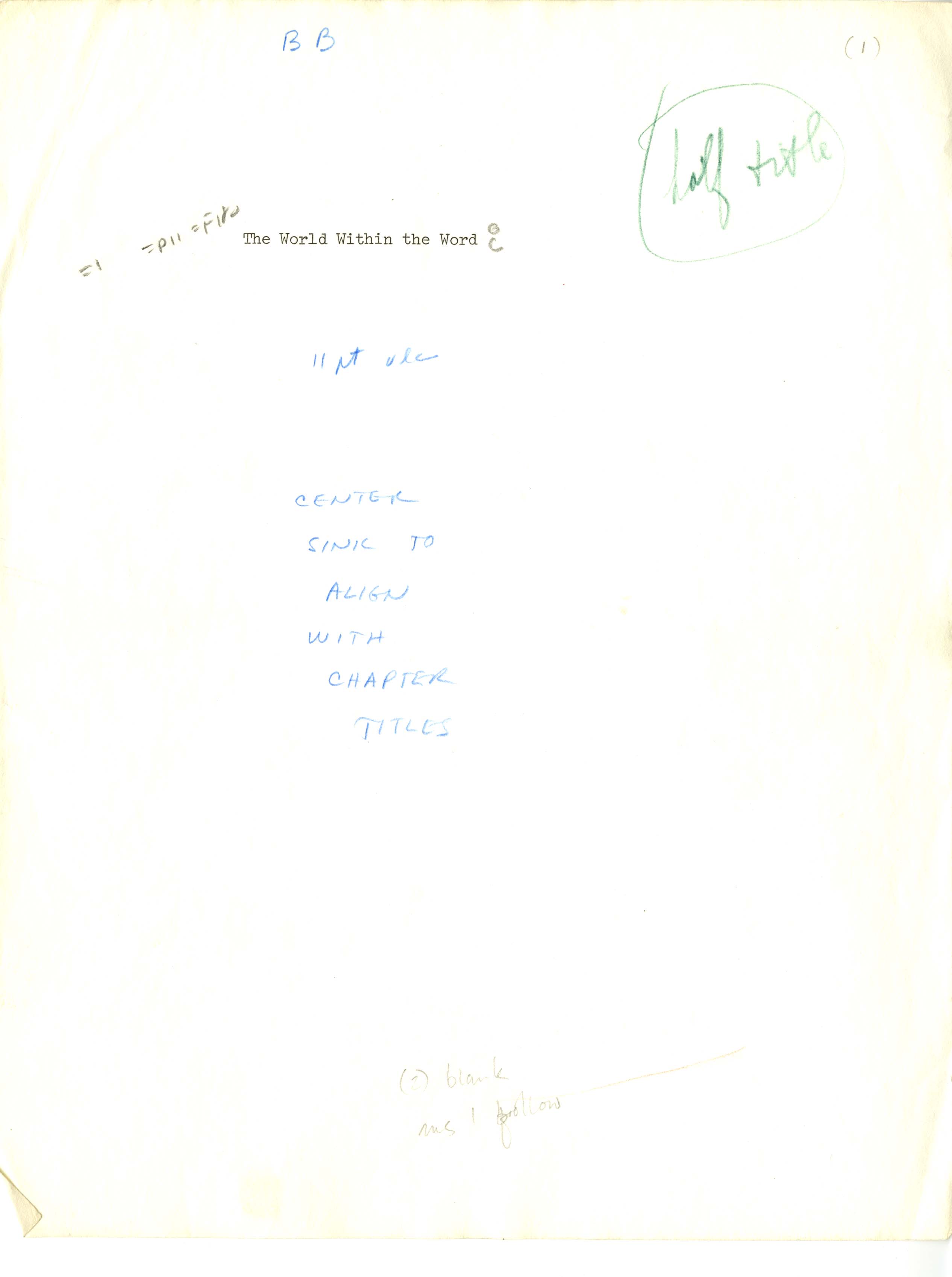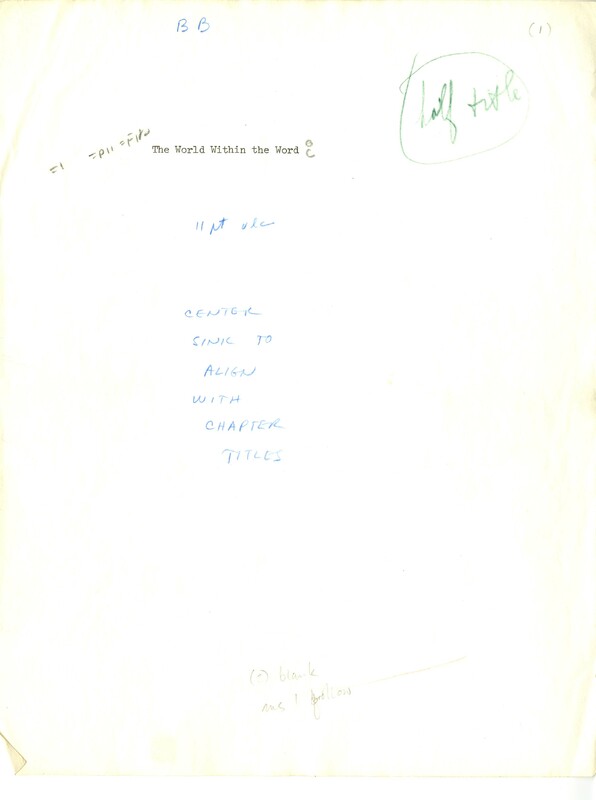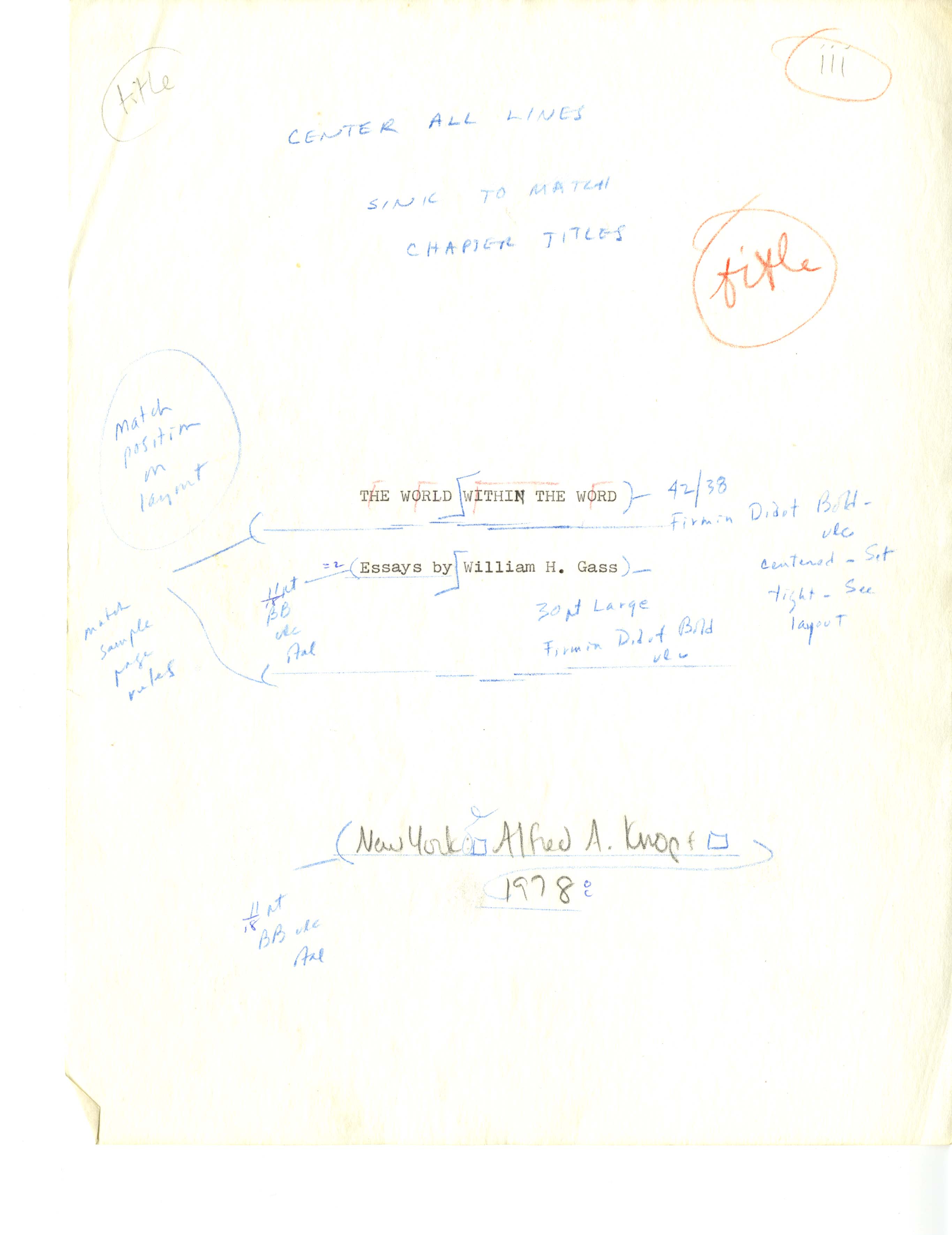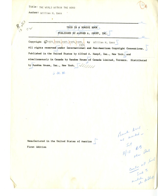 Gass, William H. 1977. “The World Within the Word&Nbsp;- Setting Copy”. Alfred A. Knopf. Alfred A. Knopf, William H. Gass: The Soul Inside the Sentence, accessed February 10, 2026, https://digitalexhibits.library.wustl.edu/s/gass/item/14455