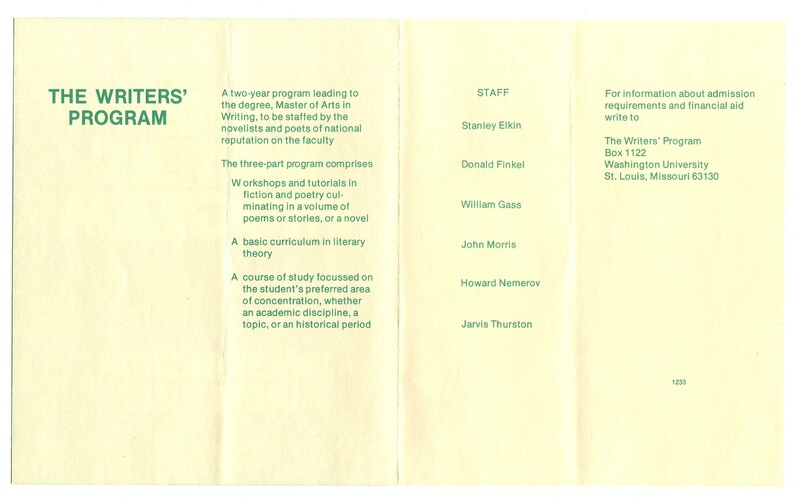 Washington University in St. Louis. “The Writers’ Program at Washington University Brochure”. Washington University in St. Louis. Washington University in St. Louis, William H. Gass: The Soul Inside the Sentence, accessed February 13, 2026, https://digitalexhibits.library.wustl.edu/s/gass/item/14456