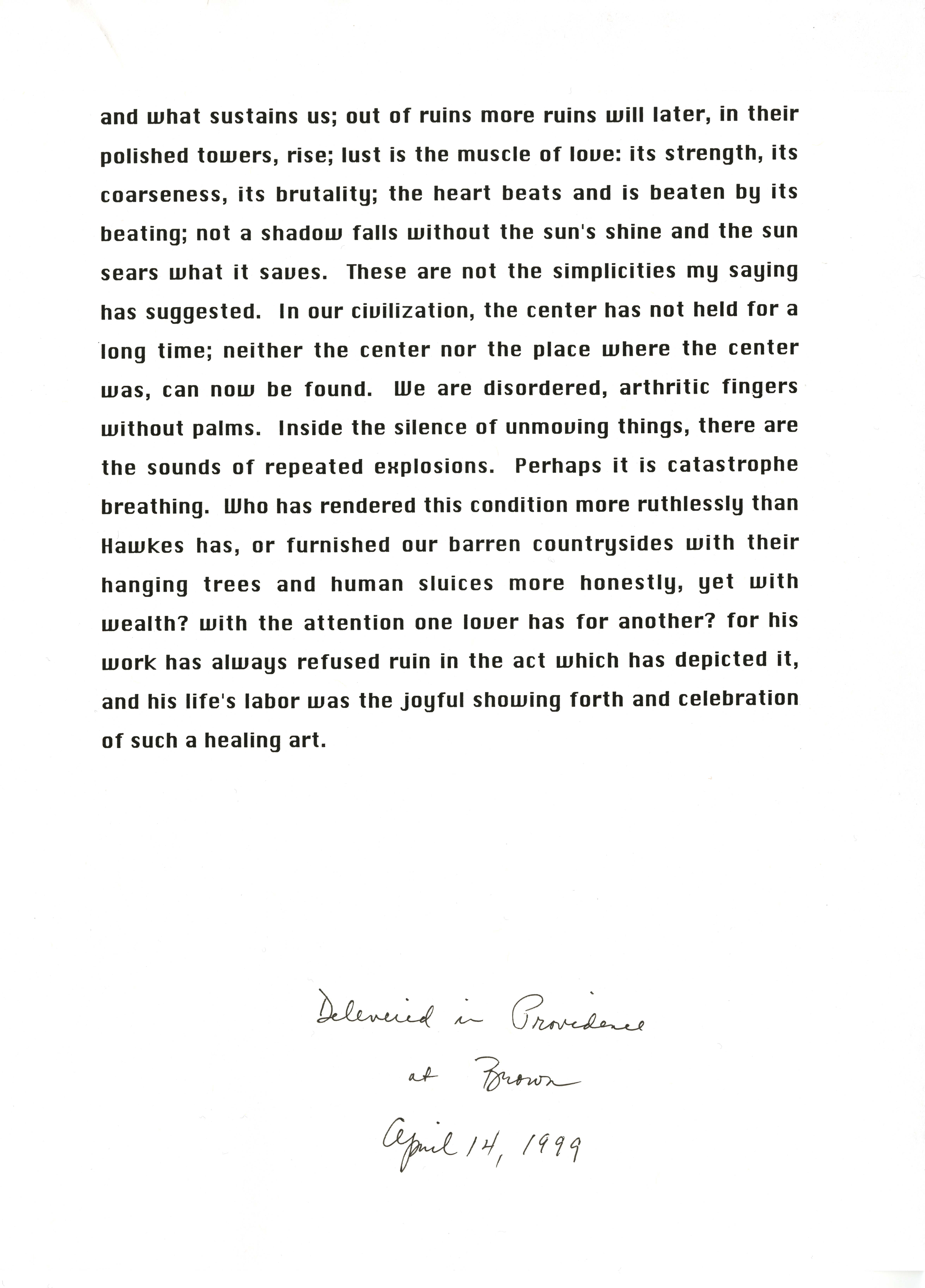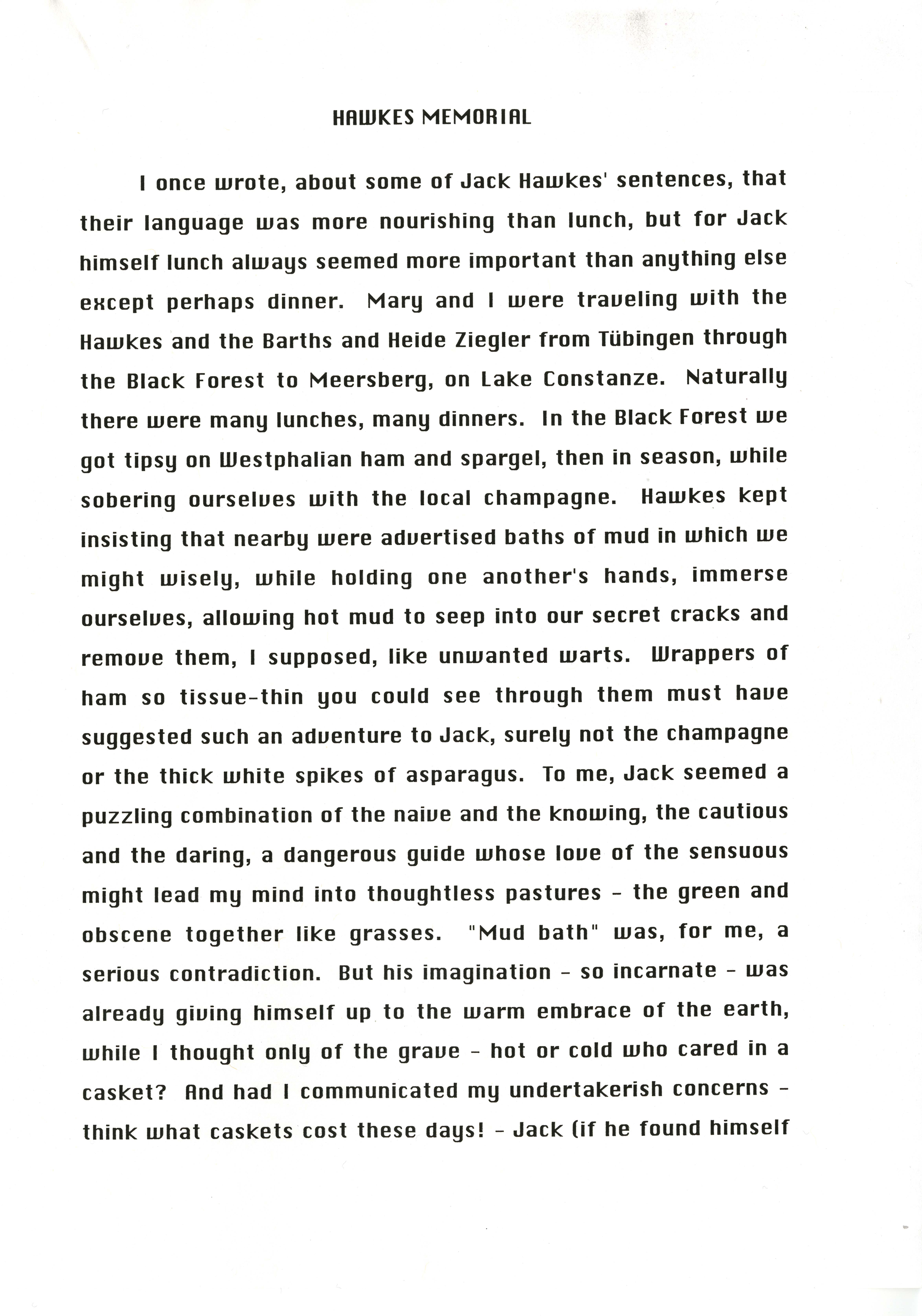 Gass, William H. 1999. “John Hawkes Memorial Speech.”, William H. Gass: The Soul Inside the Sentence, accessed February 11, 2026, https://digitalexhibits.library.wustl.edu/s/gass/item/14460