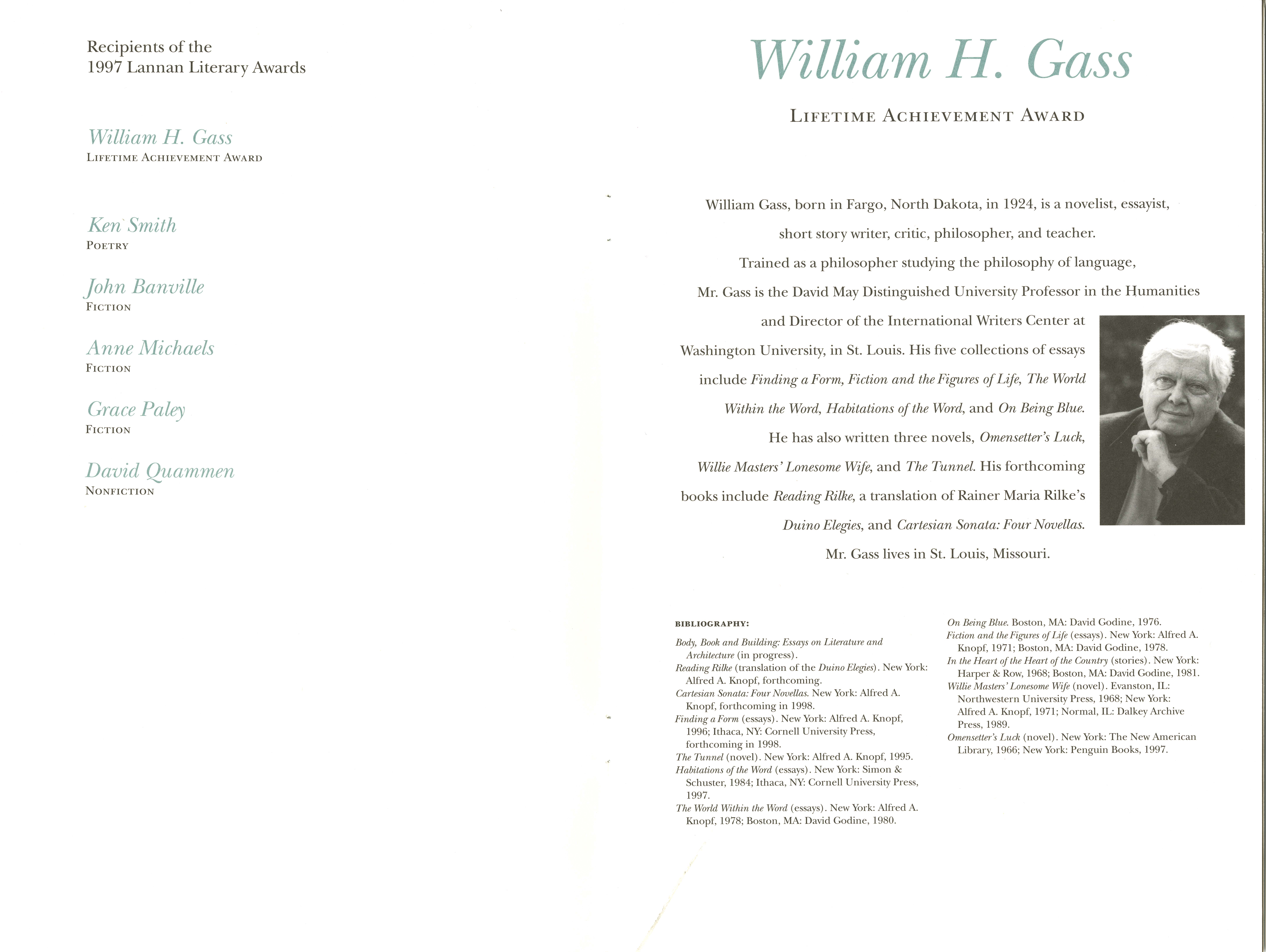 Lannan Foundation. 1996. “1997 Lannan Literary Awards - Lifetime Achievement Award”. Lannan Foundation. Lannan Foundation, William H. Gass: The Soul Inside the Sentence, accessed February 11, 2026, https://digitalexhibits.library.wustl.edu/s/gass/item/15046