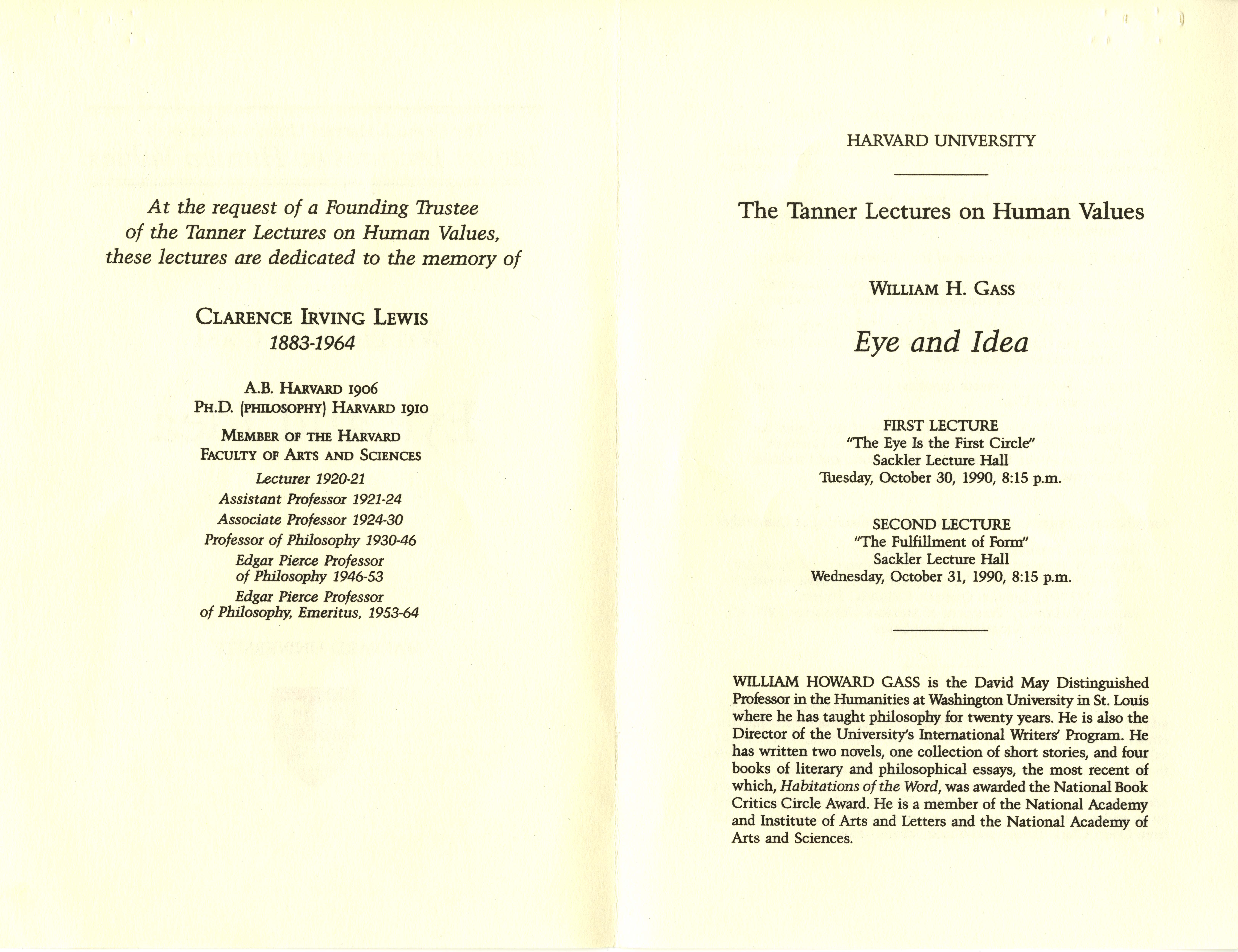 Harvard University. 1990. “‘Eye and Idea’ - Harvard University Tanner Lecture on Human Values”. Harvard University. Harvard University, William H. Gass: The Soul Inside the Sentence, accessed February 10, 2026, https://digitalexhibits.library.wustl.edu/s/gass/item/15050