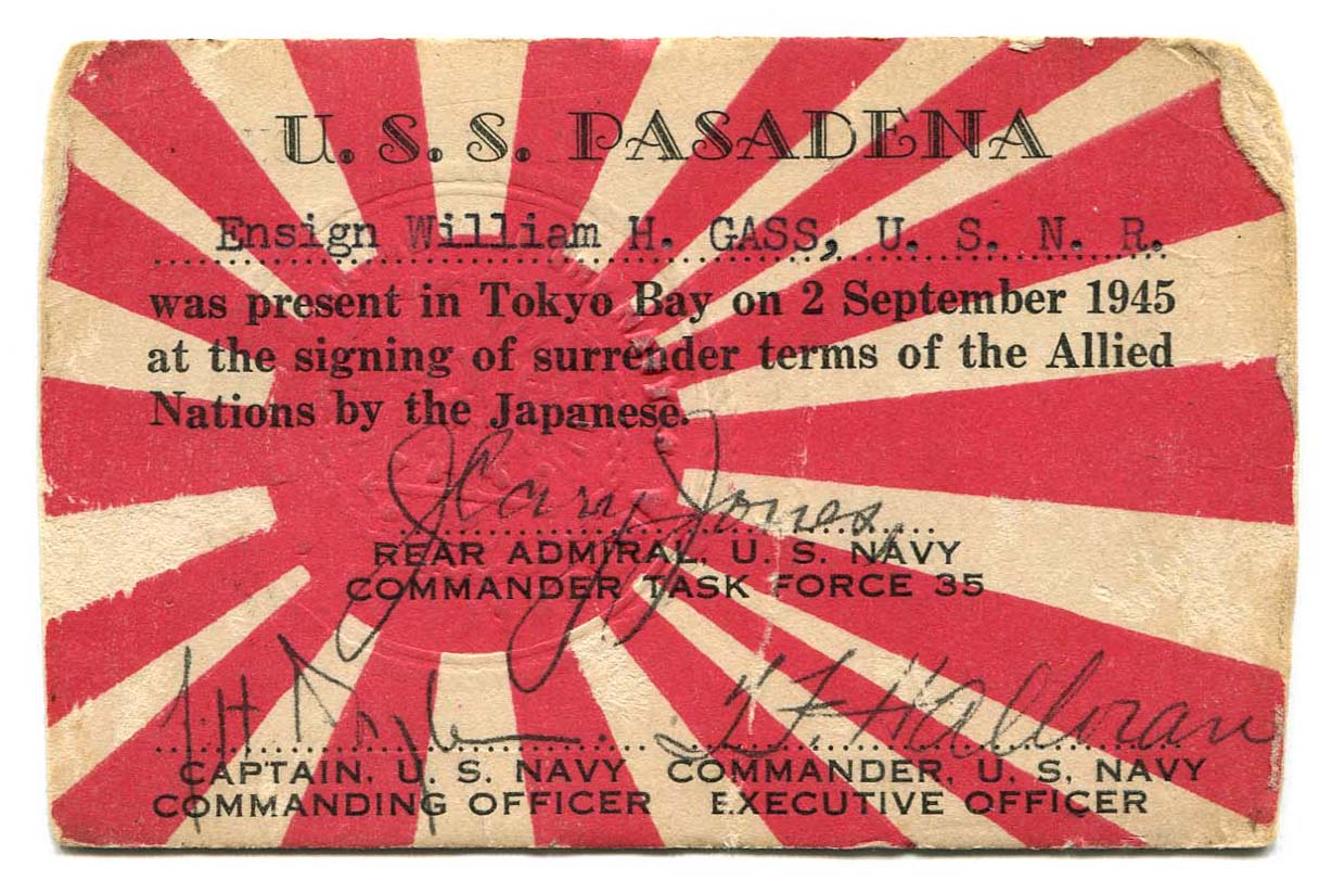 U.S. Navy. 1945. “U.S.S. Pasadena Wallet Card Souvenir”. U.S. Navy, William H. Gass: The Soul Inside the Sentence, accessed February 11, 2026, https://digitalexhibits.library.wustl.edu/s/gass/item/15052