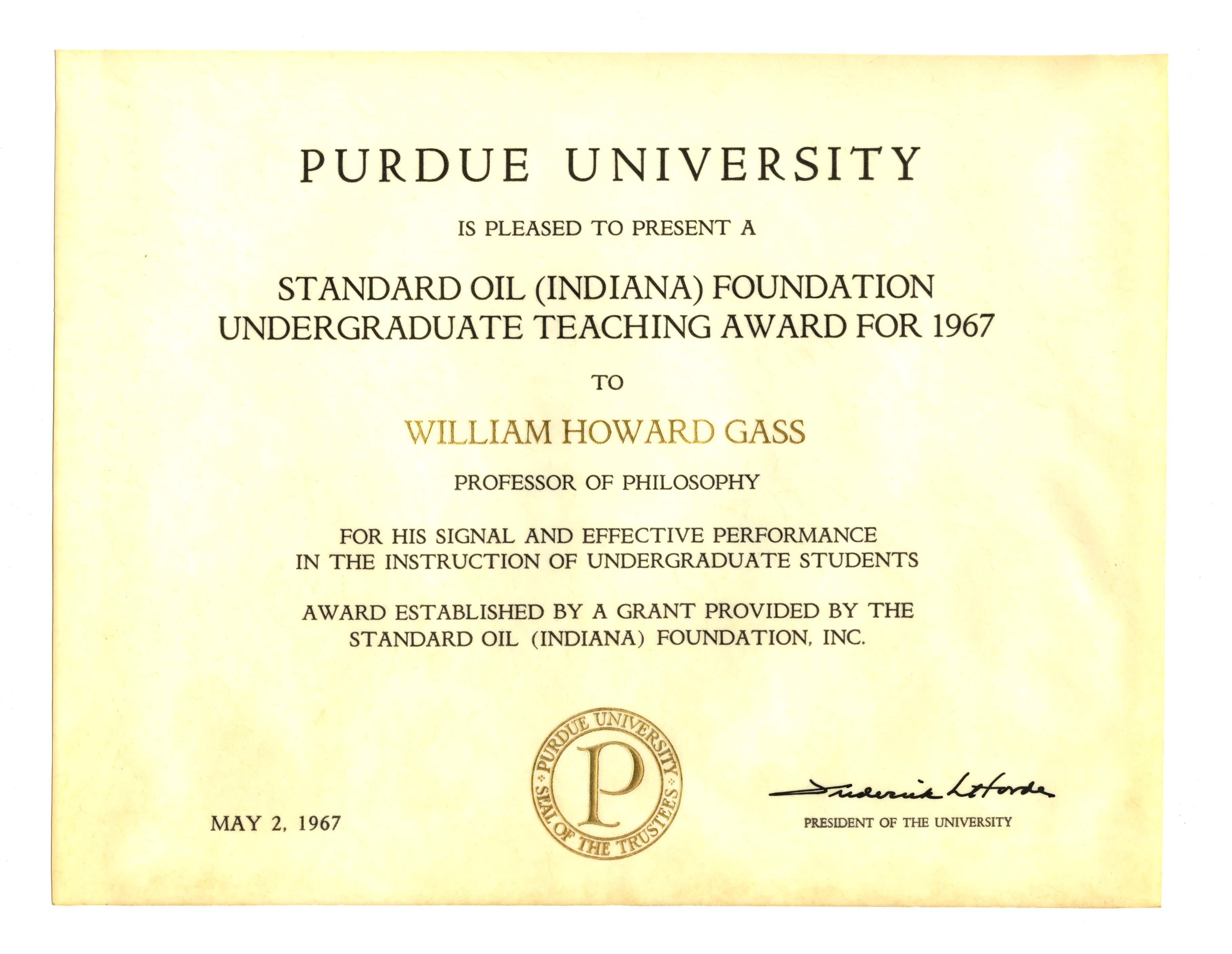 Purdue University. 1967. “Standard Oil (Indiana) Foundation Undergraduate Teaching Award”. Purdue University, William H. Gass: The Soul Inside the Sentence, accessed February 13, 2026, https://digitalexhibits.library.wustl.edu/s/gass/item/15053