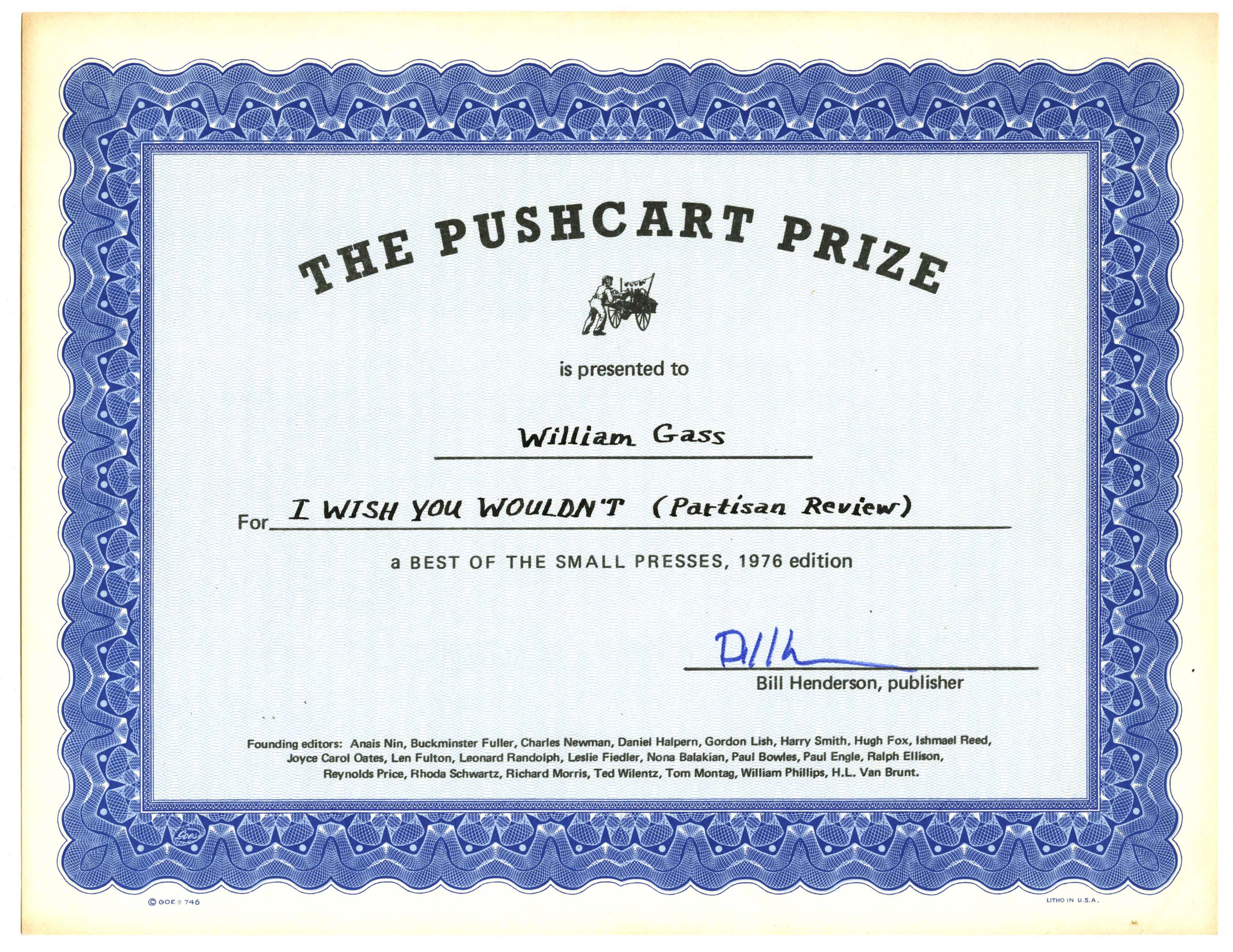 Pushcart Prize. 1975. “The Pushcart Prize - ‘I Wish You Wouldn’t’.”, William H. Gass: The Soul Inside the Sentence, accessed February 11, 2026, https://digitalexhibits.library.wustl.edu/s/gass/item/15055