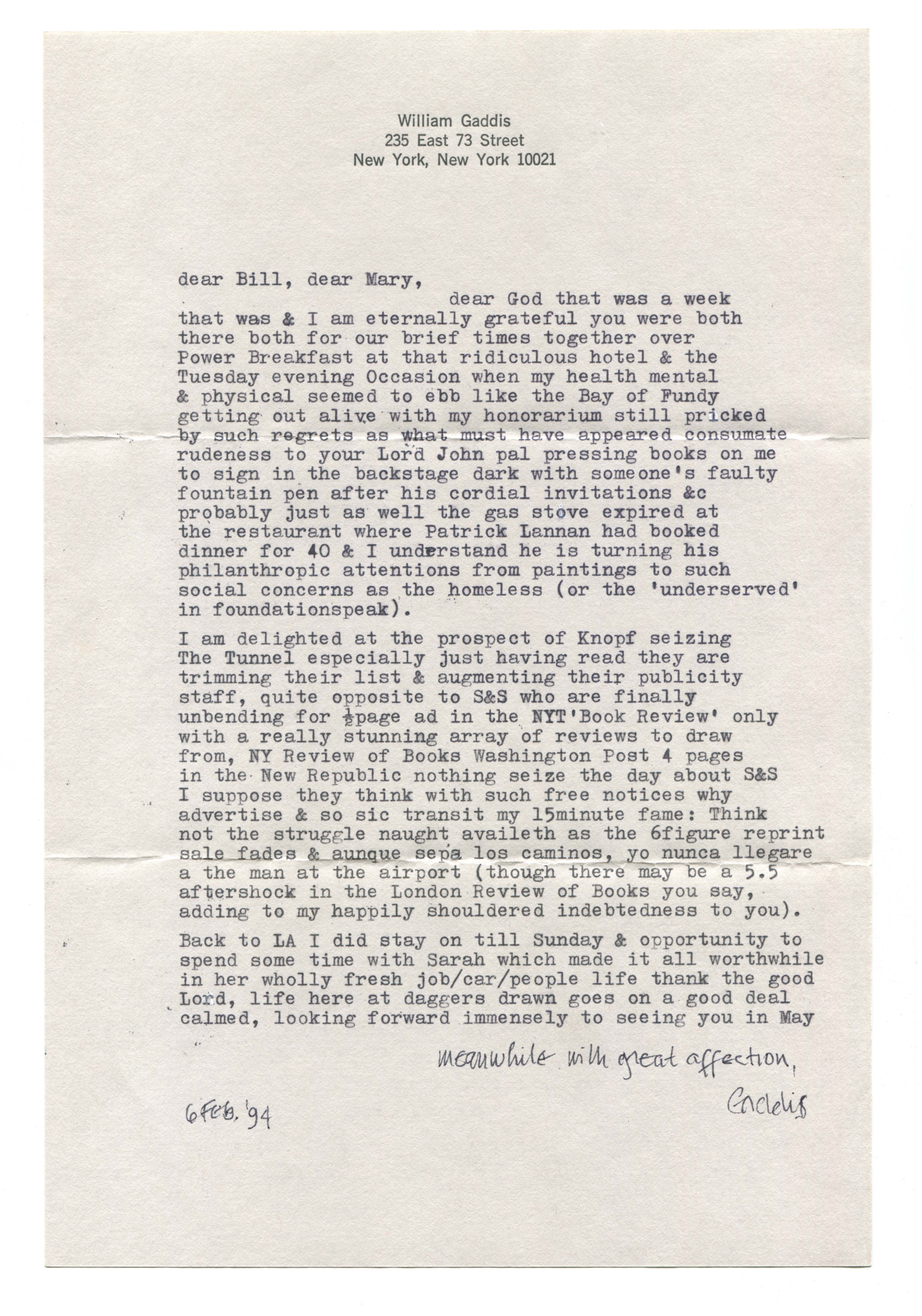 Gaddis, William. 1994. “Typed Letter Signed from William Gaddis to William H. Gass, February 6, 1994.”, William H. Gass: The Soul Inside the Sentence, accessed February 11, 2026, https://digitalexhibits.library.wustl.edu/s/gass/item/15073