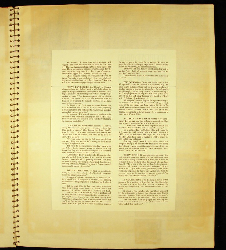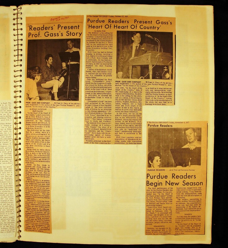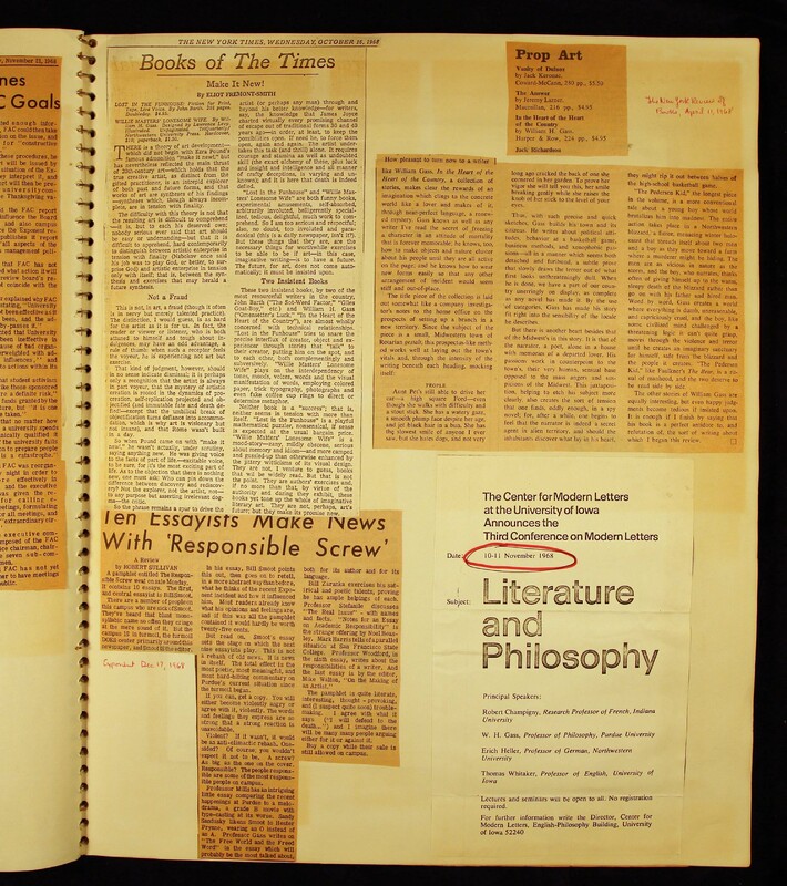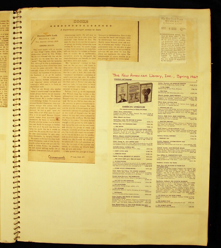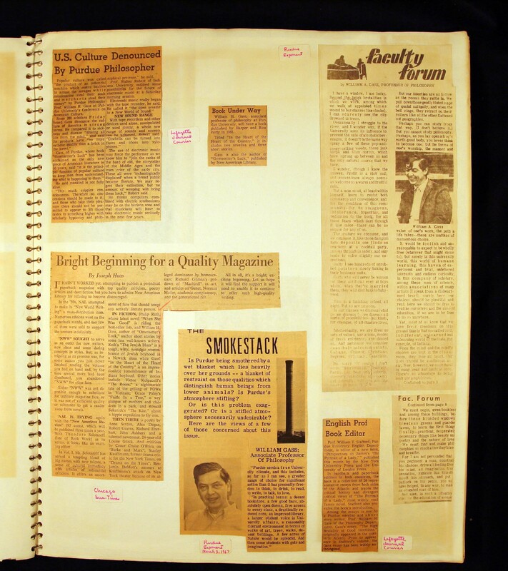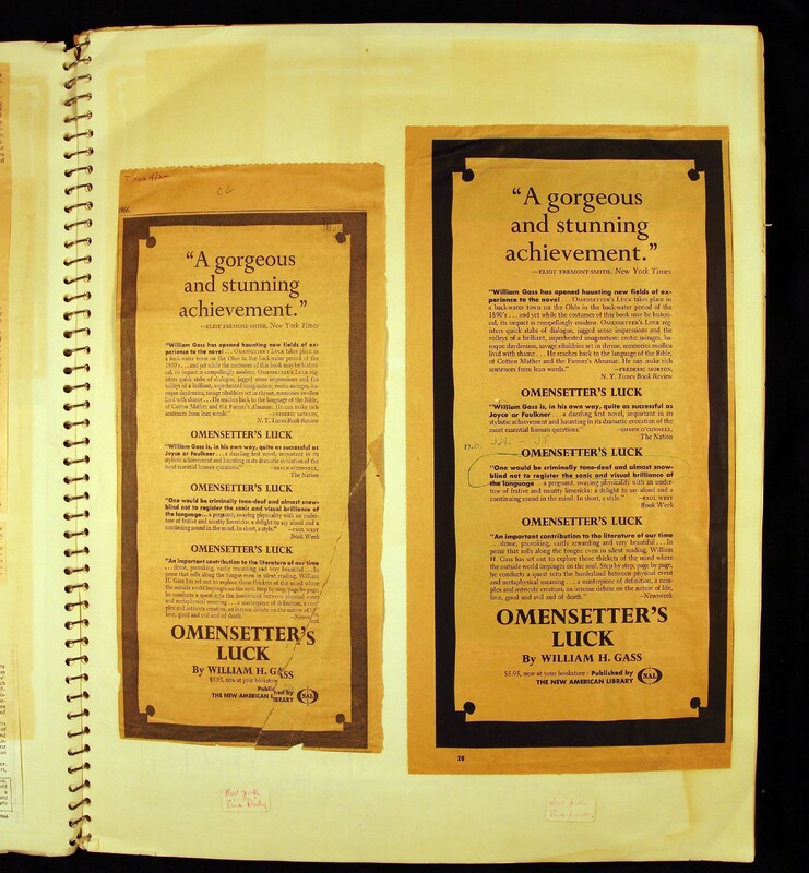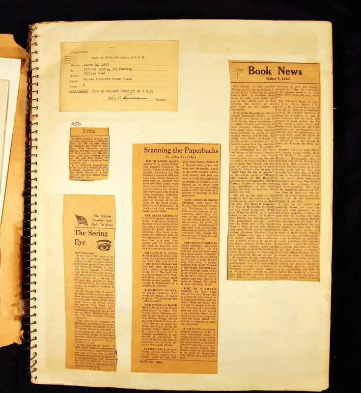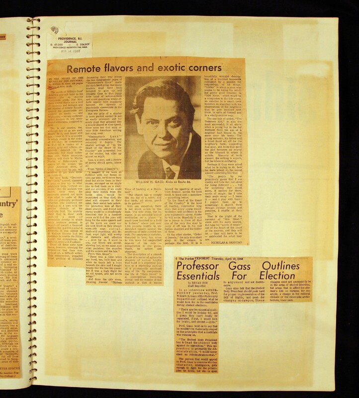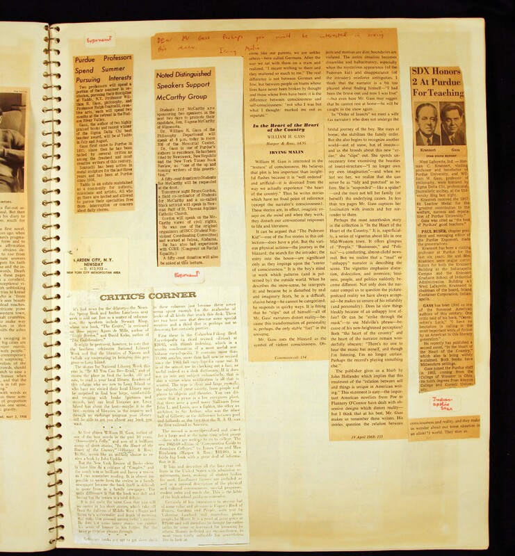 - Scrapbook created by William H. Gass containing clippings of articles, reviews and advertisements, as well as some photographs, spanning the 1950s and 1960s.