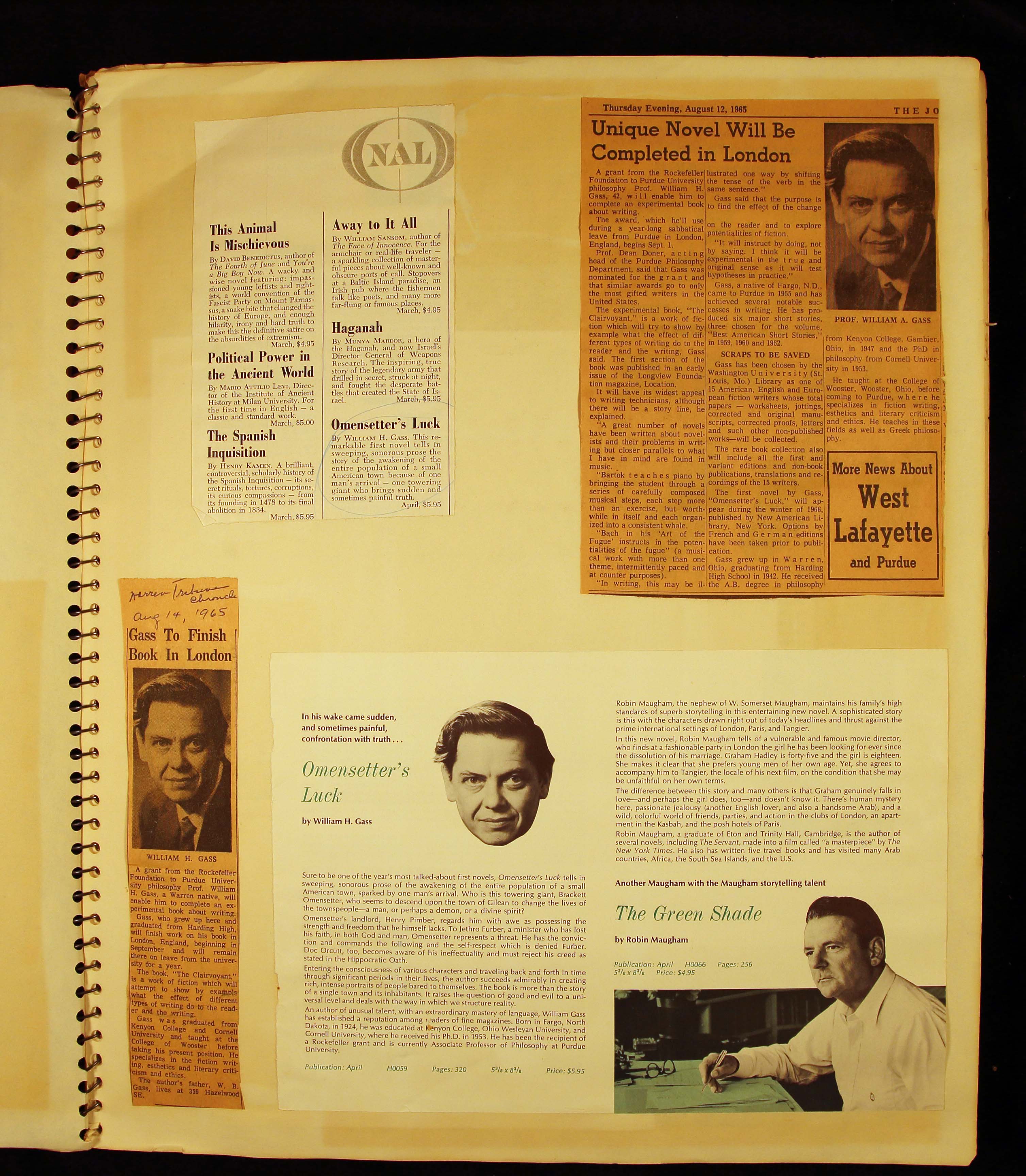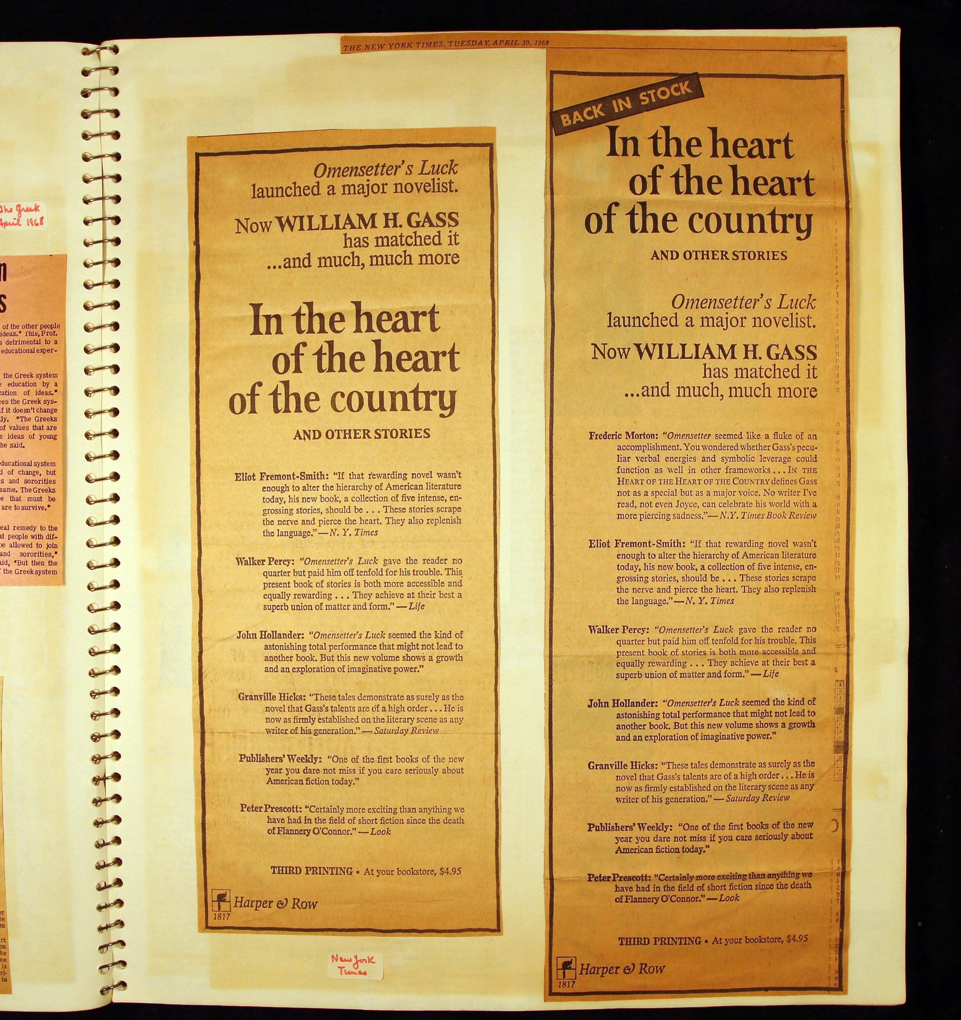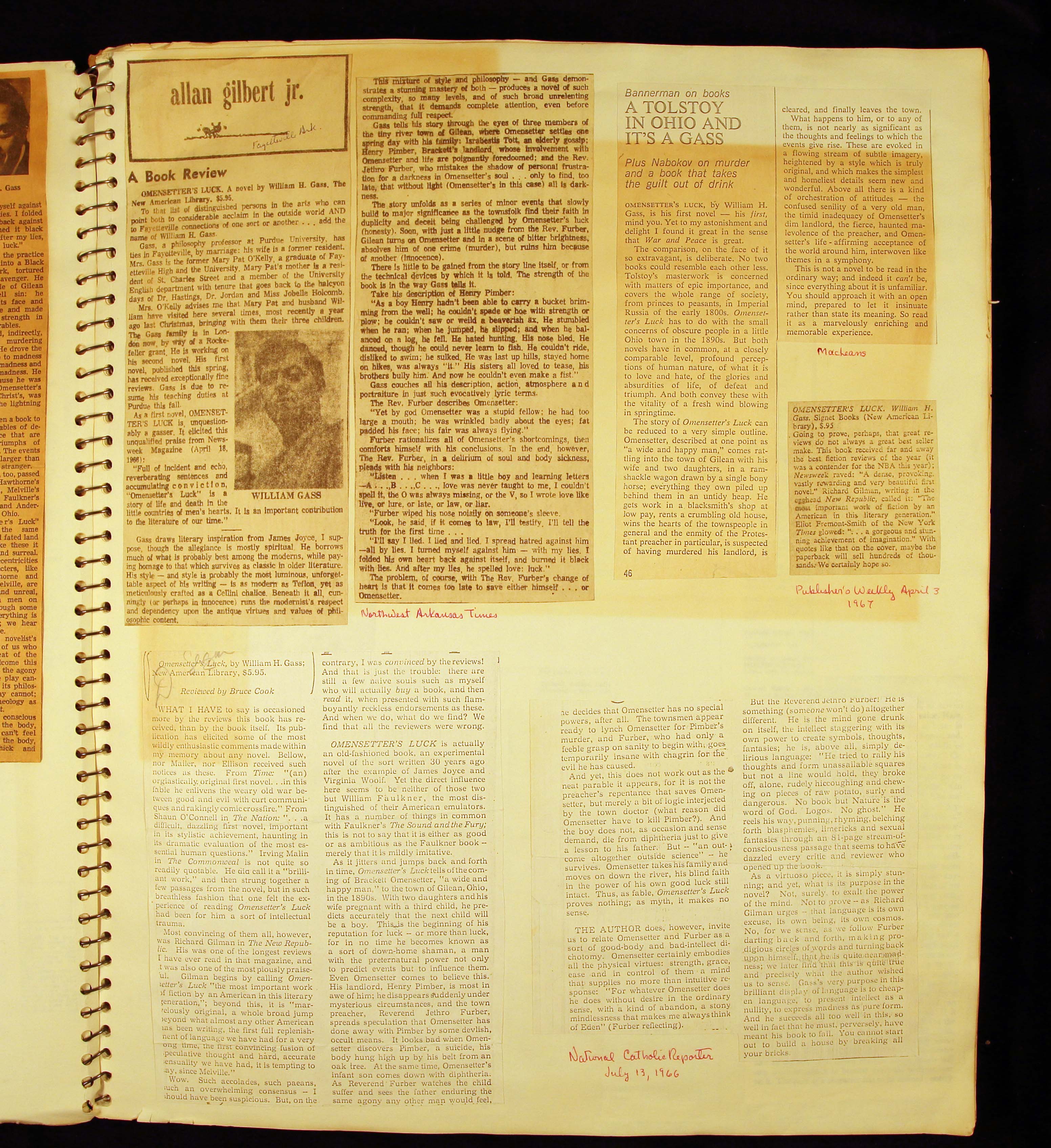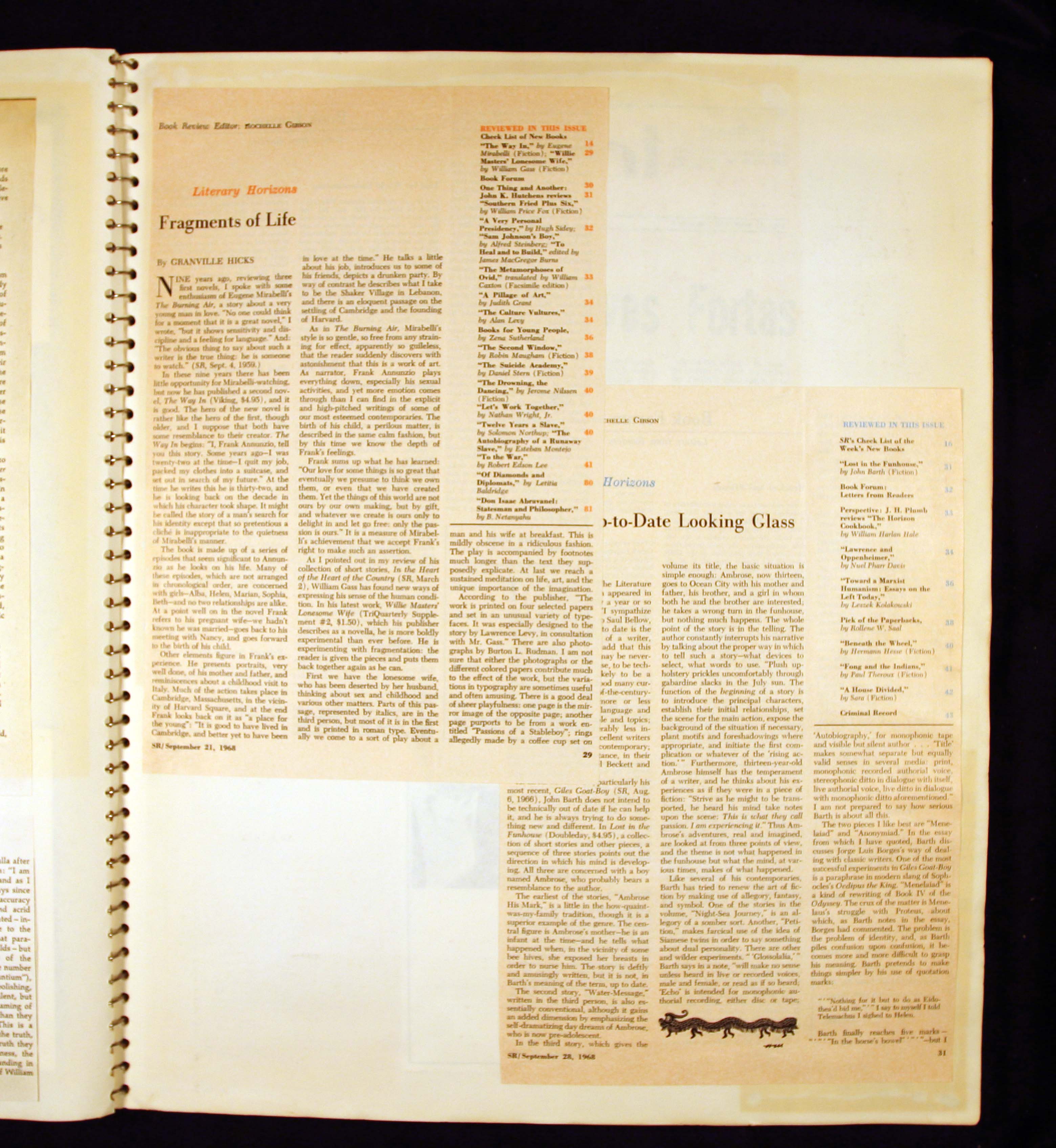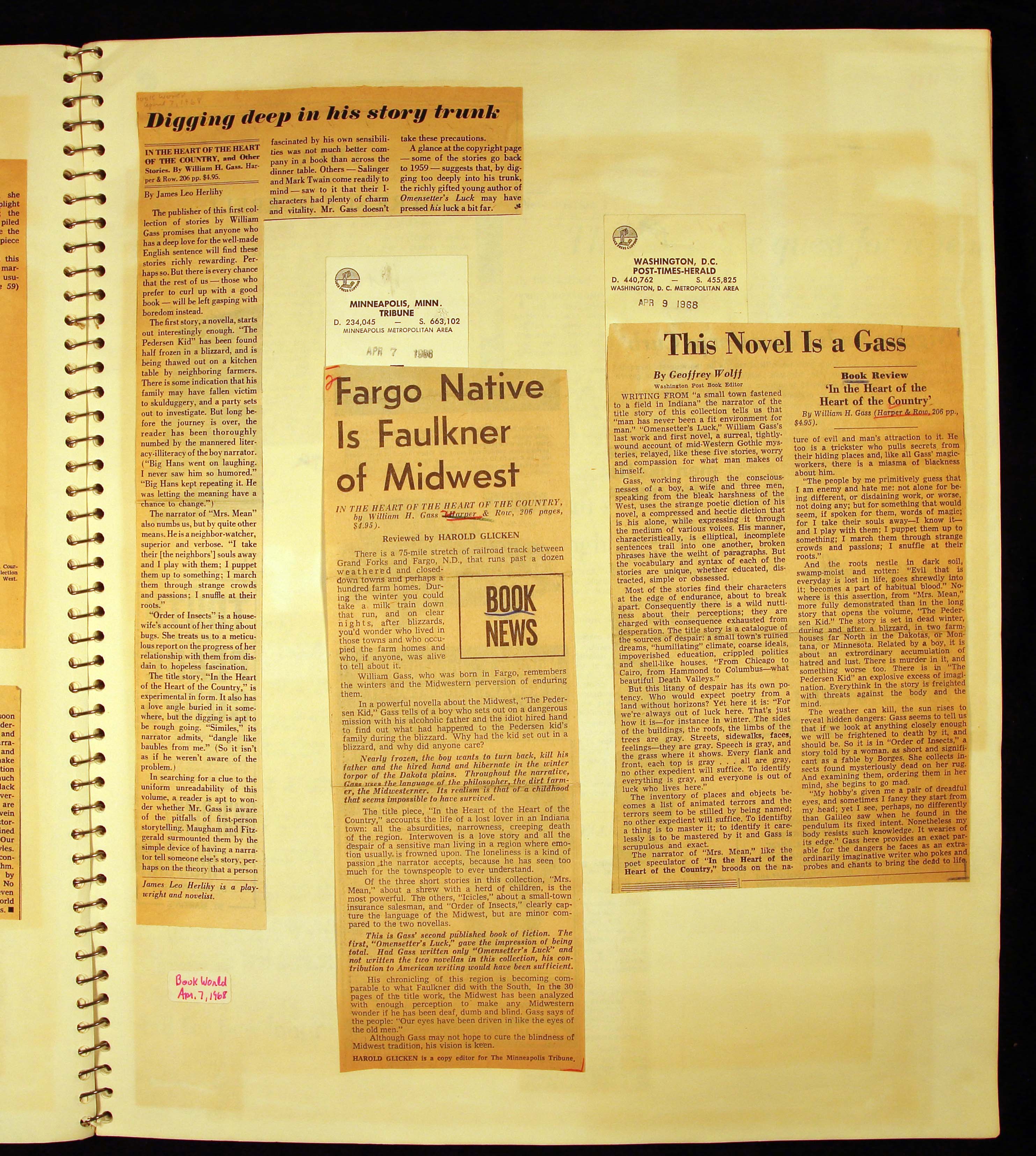 - Scrapbook created by William H. Gass containing clippings of articles, reviews and advertisements, as well as some photographs, spanning the 1950s and 1960s.