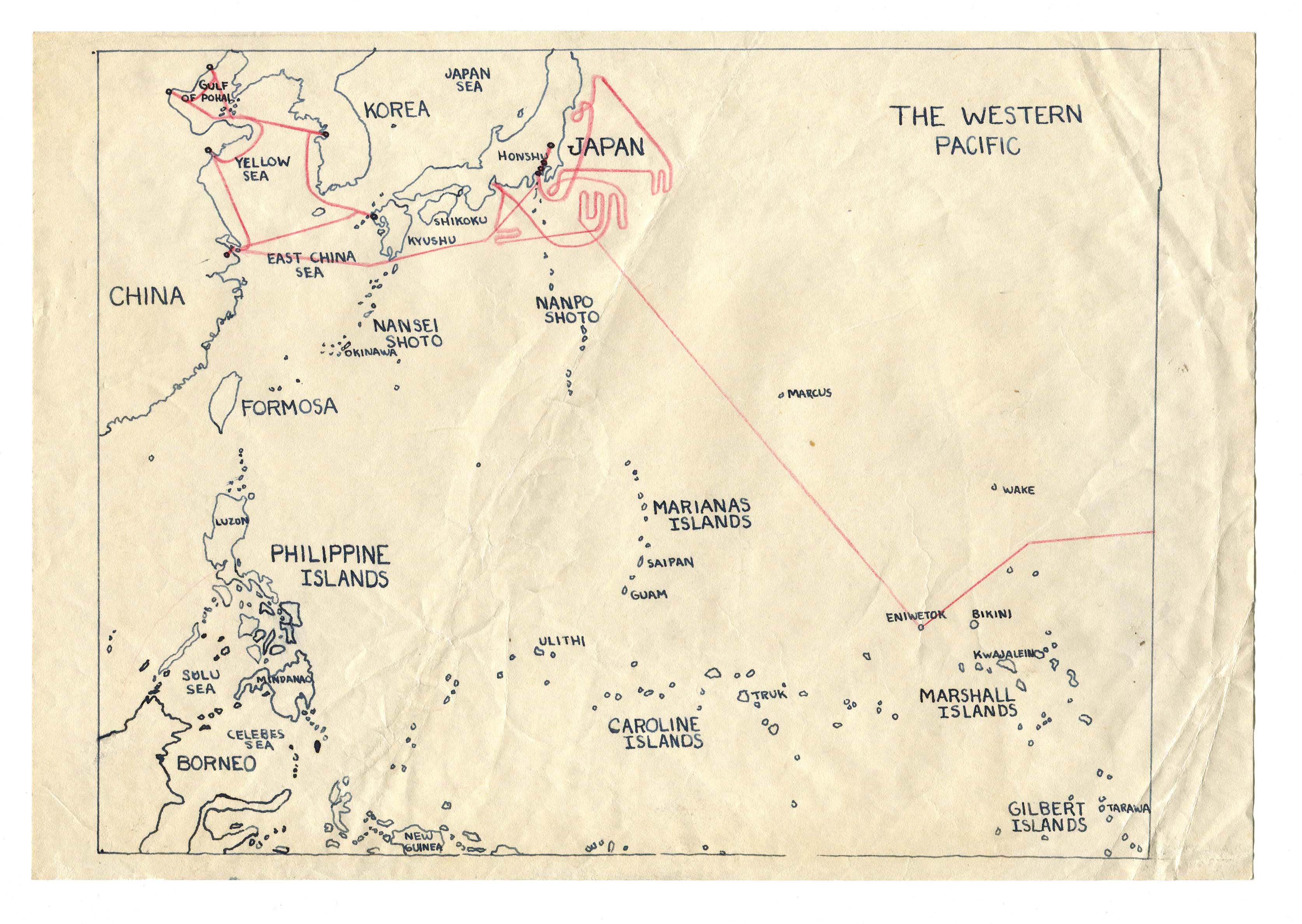 Map drawn by Gass depicting places traveled with U.S. Navy during World War II