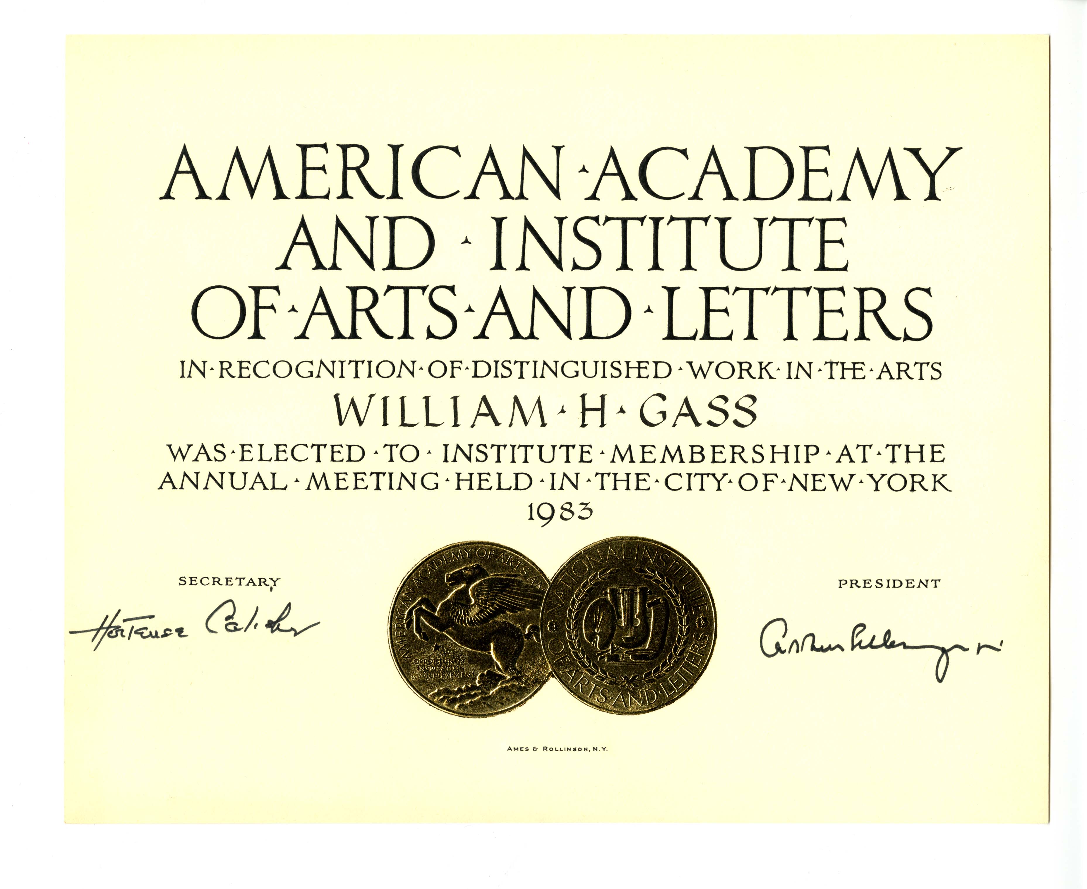 American Academy and Institute of Arts and Letters. 1983. “American Academy and Institute of Arts and Letters Induction Certificate, May 18, 1983.”, William H. Gass: The Soul Inside the Sentence, accessed February 11, 2026, https://digitalexhibits.library.wustl.edu/s/gass/item/15090