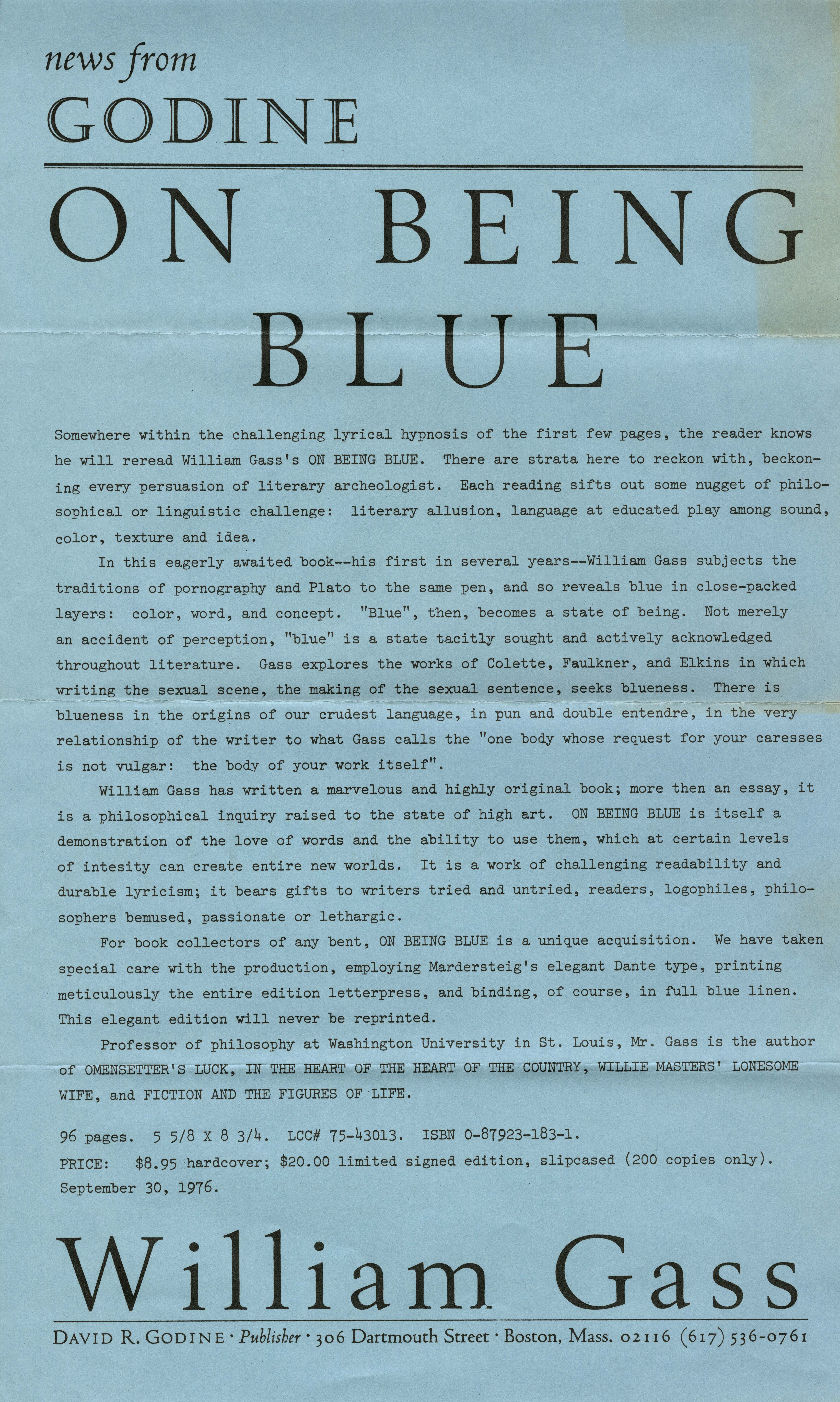 Godine. 1976. “News from Godine: On Being Blue Press Release”. Godine, William H. Gass: The Soul Inside the Sentence, accessed February 11, 2026, https://digitalexhibits.library.wustl.edu/s/gass/item/15379