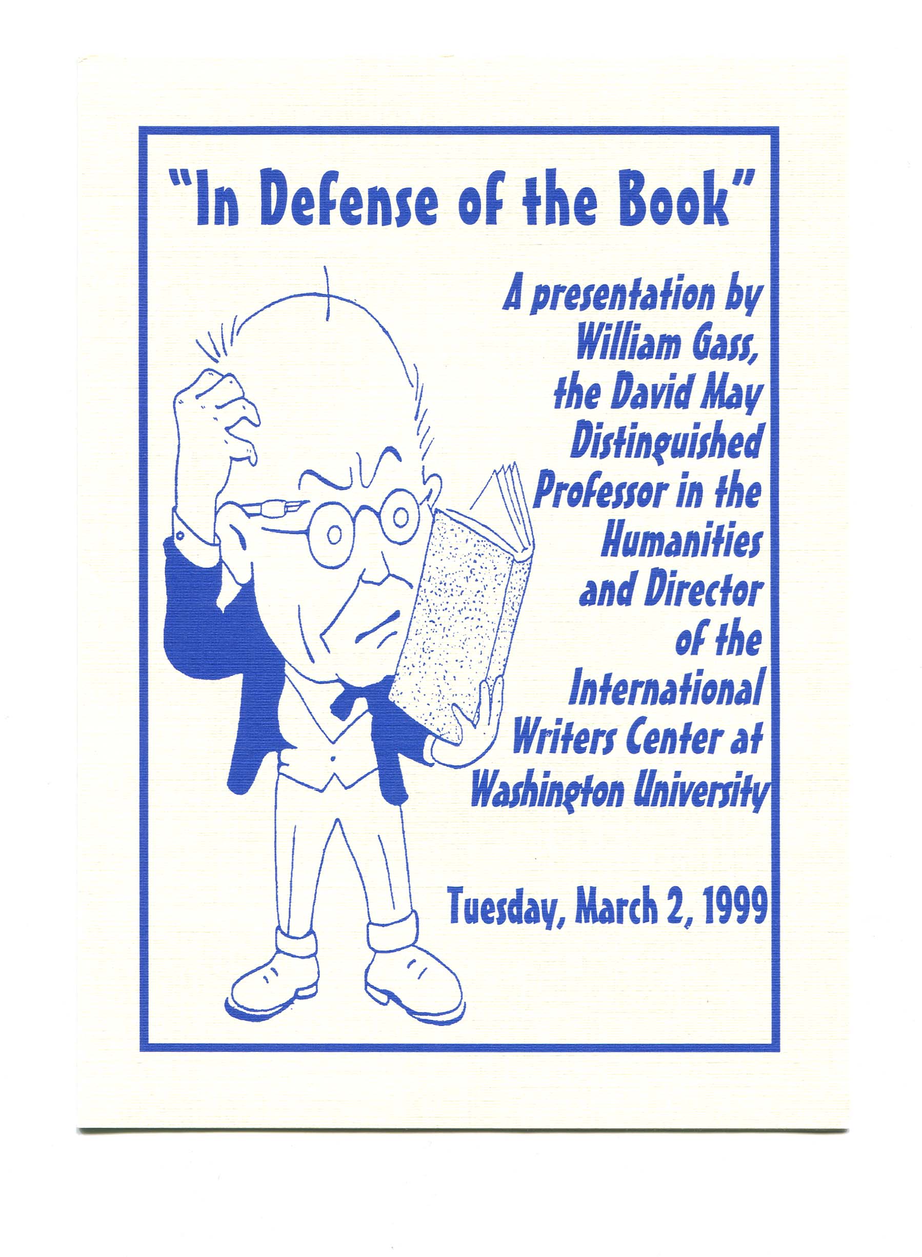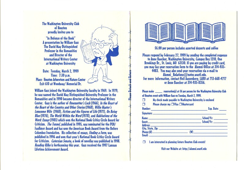 Washington University Club of Houston. 1999. “‘In Defense of the Book’ Invitation.”, William H. Gass: The Soul Inside the Sentence, accessed February 11, 2026, https://digitalexhibits.library.wustl.edu/s/gass/item/15381