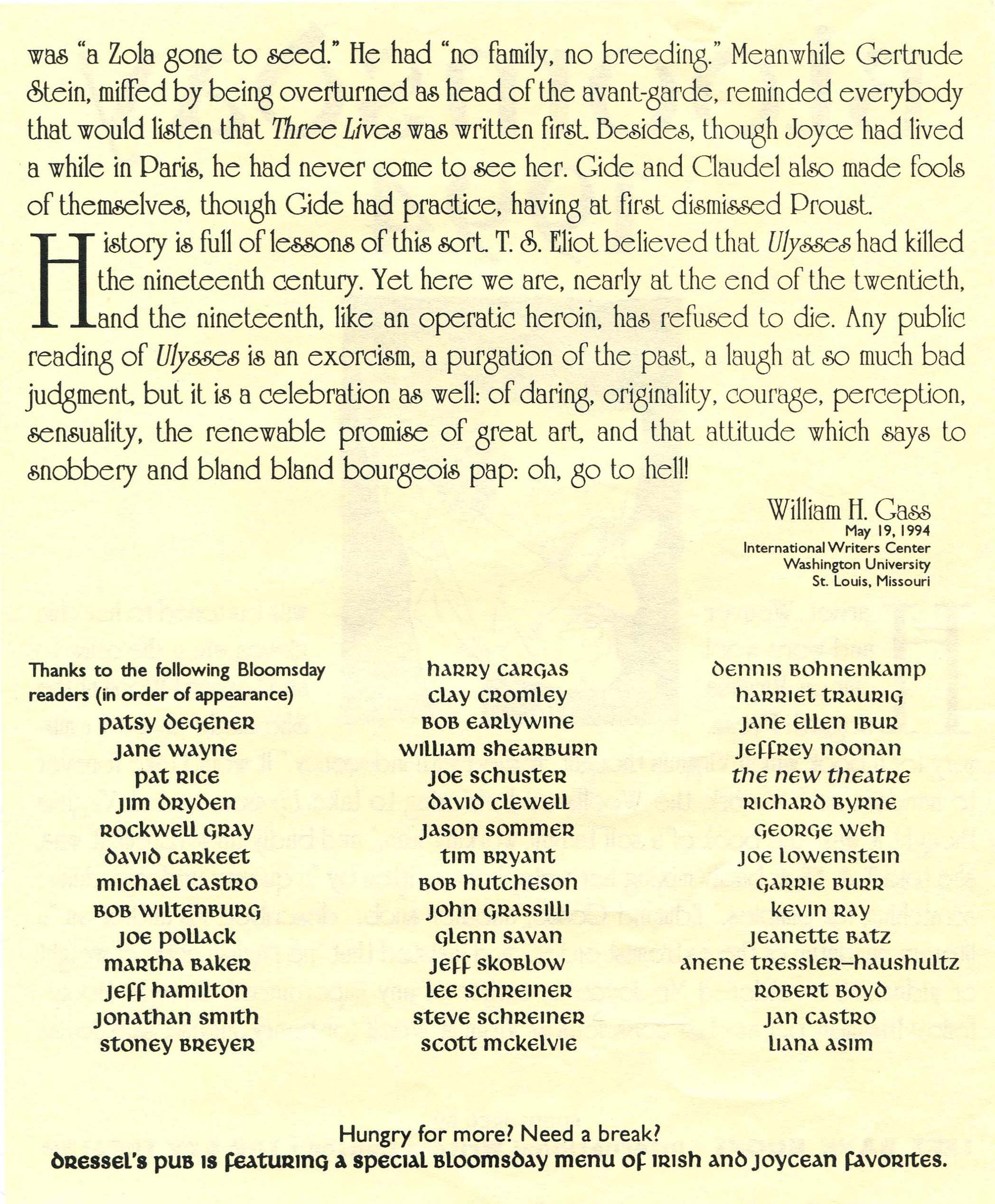 “Celebration of Bloomsday by the International Writers Center, June 16,1994”. 1994, William H. Gass: The Soul Inside the Sentence, accessed February 12, 2026, https://digitalexhibits.library.wustl.edu/s/gass/item/15383