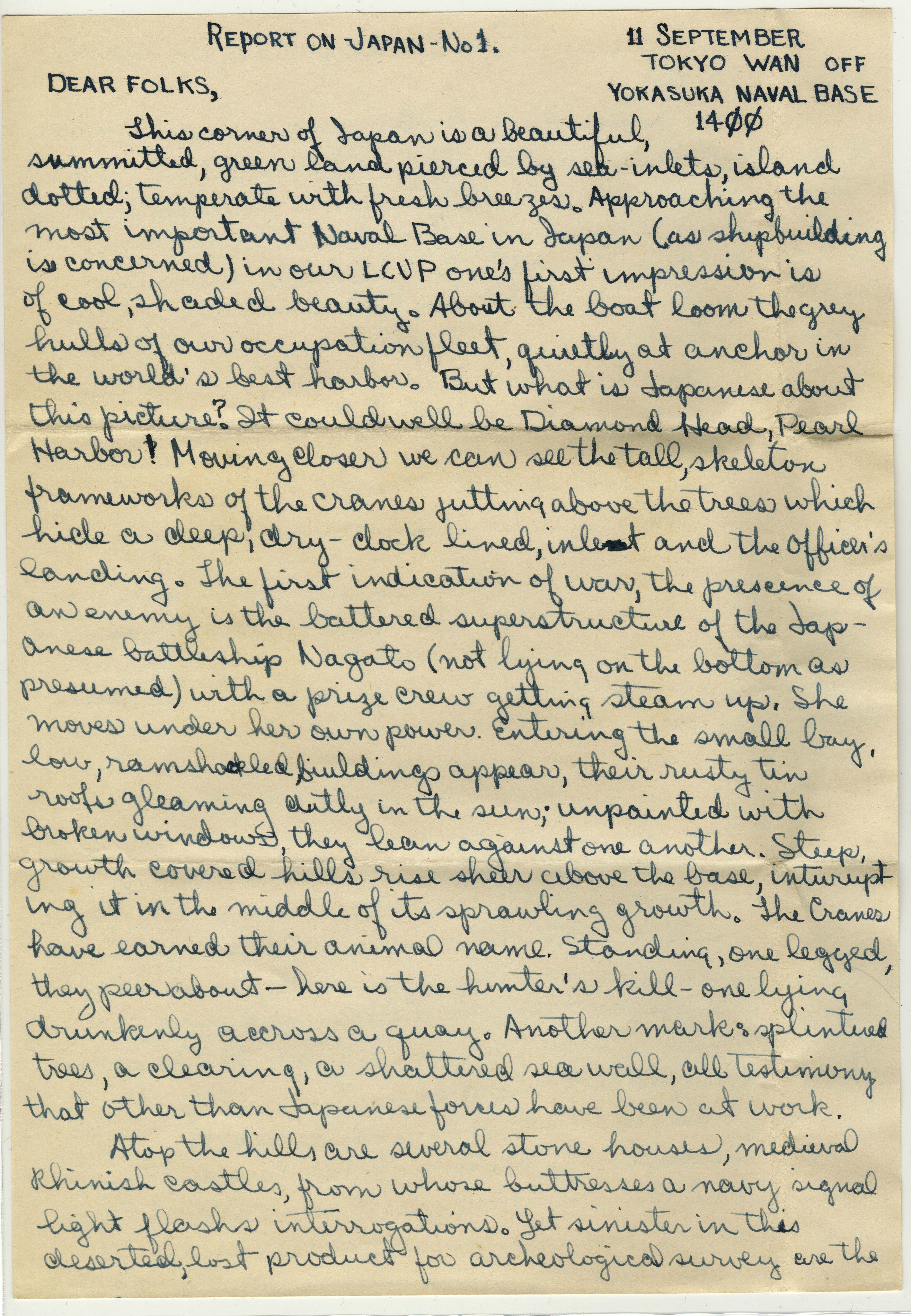 Autograph letter signed from William H. Gass to his parents, Mr. and Mrs. Gass September 11, 1945