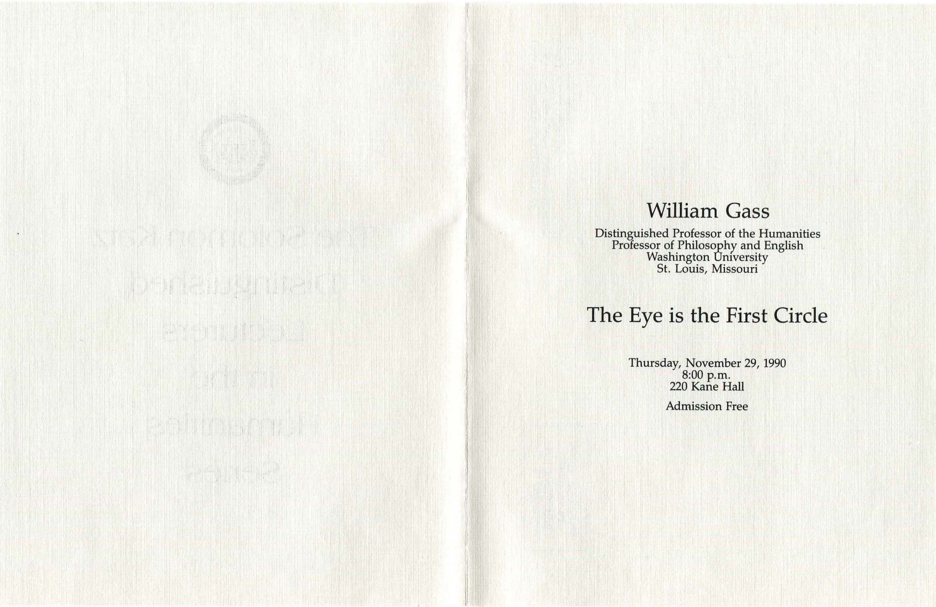 University of Washington, College of Arts and Sciences. 1990. “The Solomon Katz Distinguished Lecturers in the Humanities Series Announcement, ‘The Eye Is the First Circle’”. University of Washington, College of Arts and Sciences. University of Washington, College of Arts and Sciences, William H. Gass: The Soul Inside the Sentence, accessed February 10, 2026, https://digitalexhibits.library.wustl.edu/s/gass/item/15403