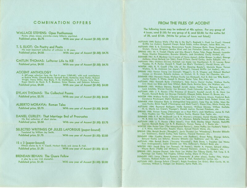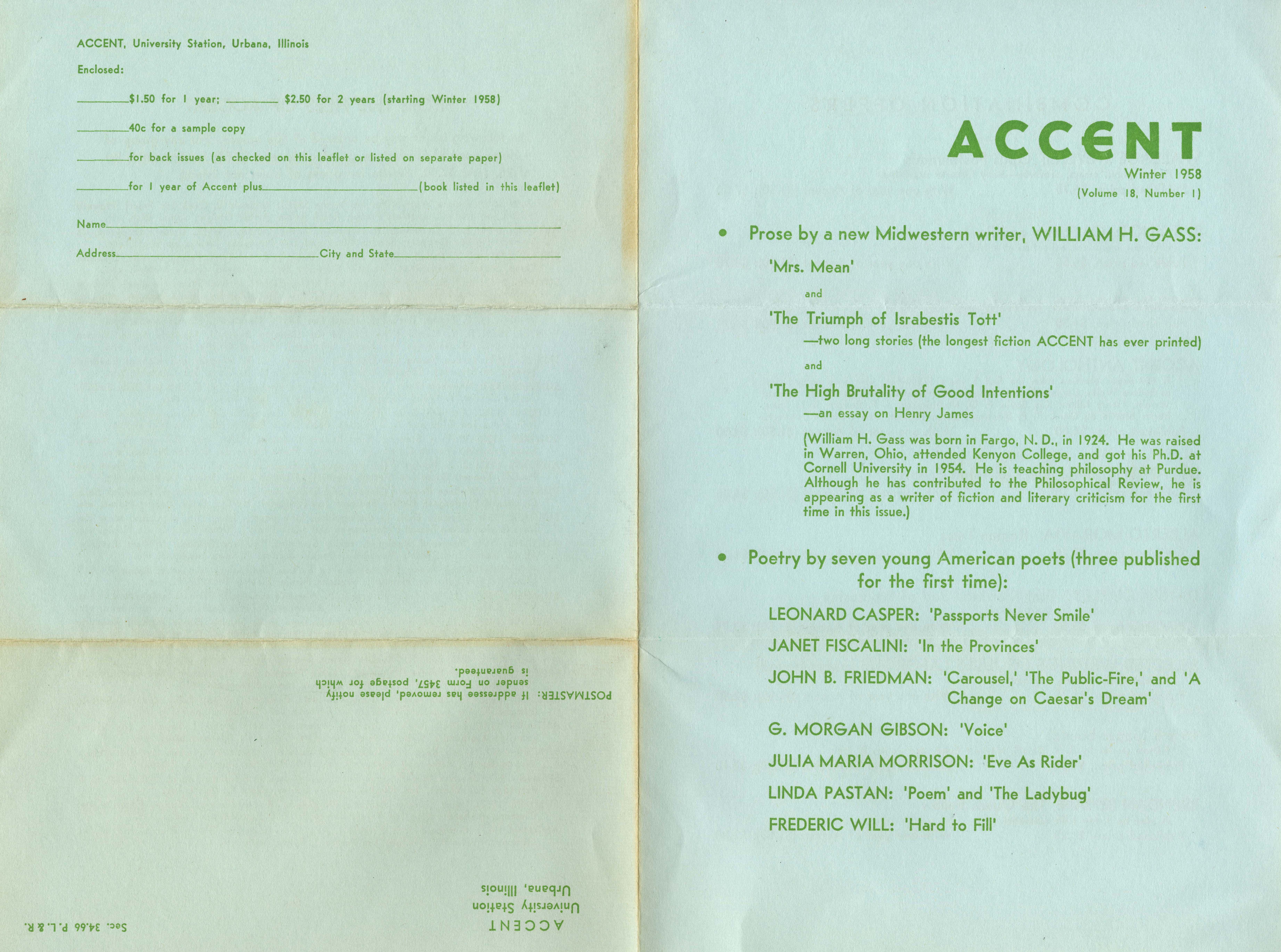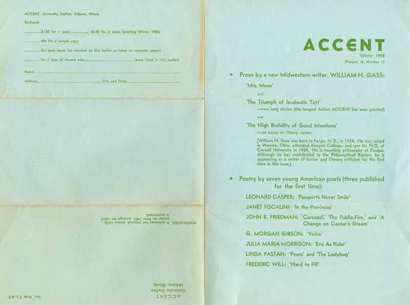 Accent. 1957. “Accent, Volume 18, Number 1 (Winter 1958) Prospectus”. Accent, William H. Gass: The Soul Inside the Sentence, accessed February 13, 2026, https://digitalexhibits.library.wustl.edu/s/gass/item/15408