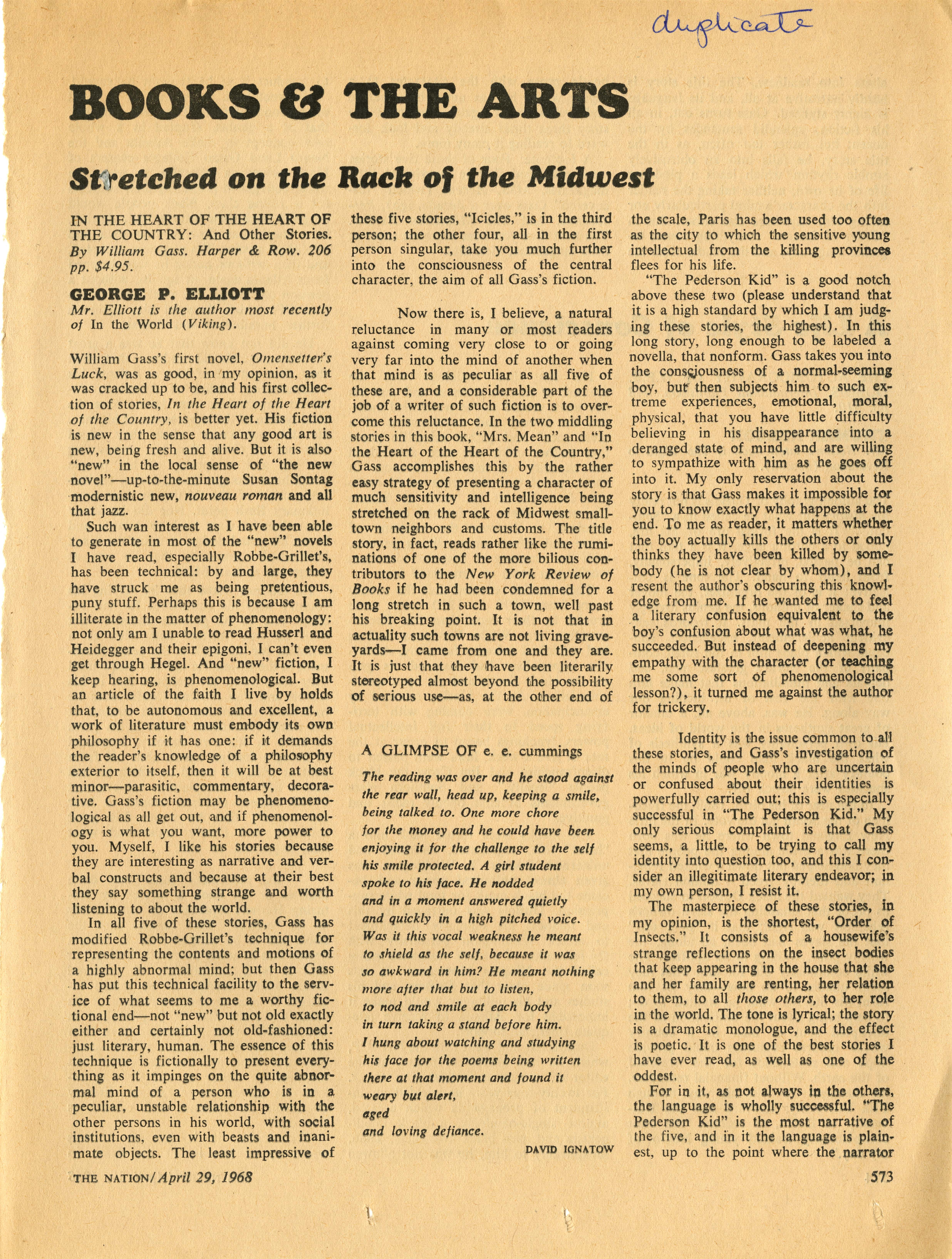Elliott, George P. 1968. “‘Stretched on the Rack of the Midwest’ Review by George P. Elliott of In the Heart of the Heart of the Country”. The Nation, William H. Gass: The Soul Inside the Sentence, accessed February 11, 2026, https://digitalexhibits.library.wustl.edu/s/gass/item/15410