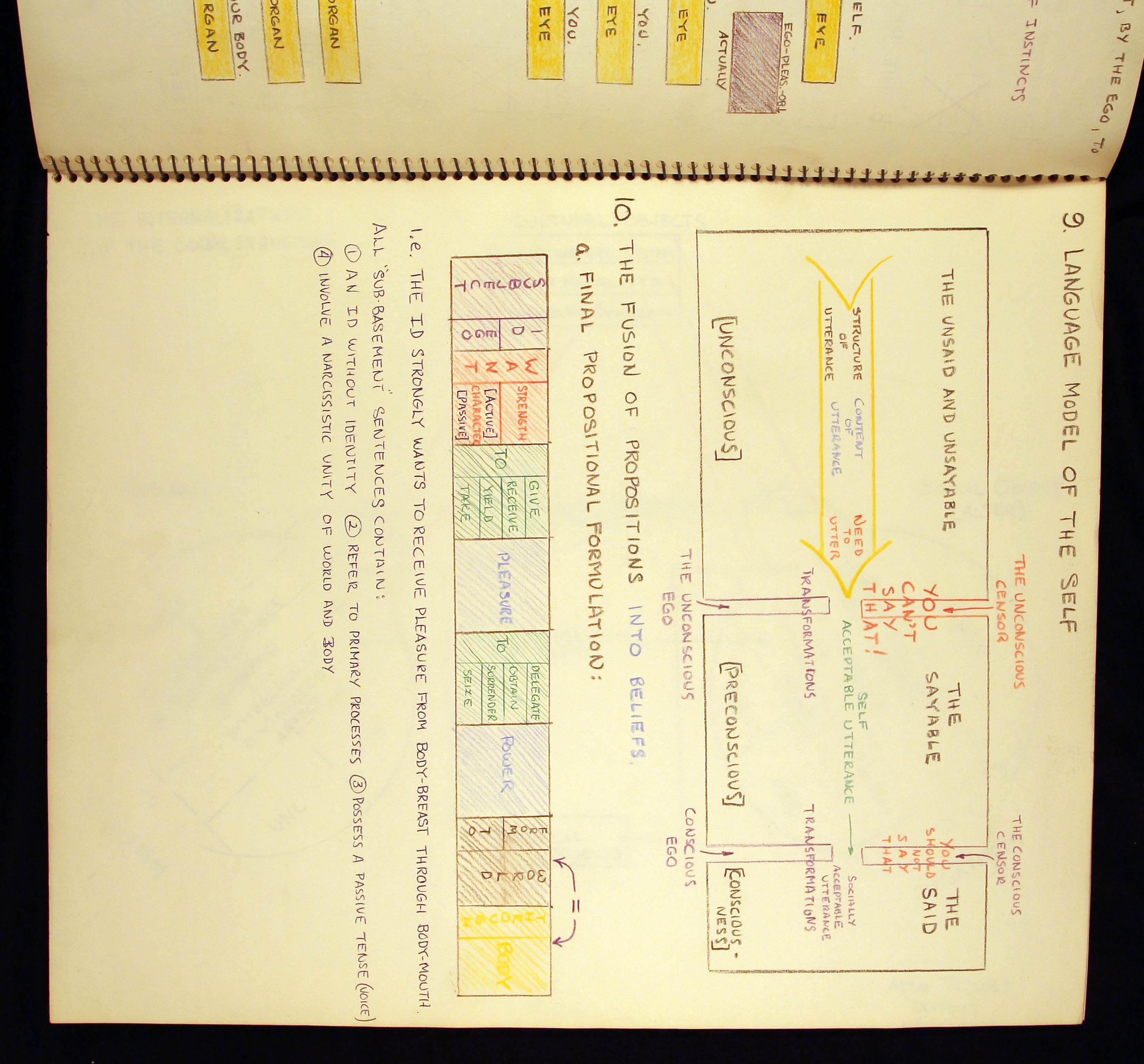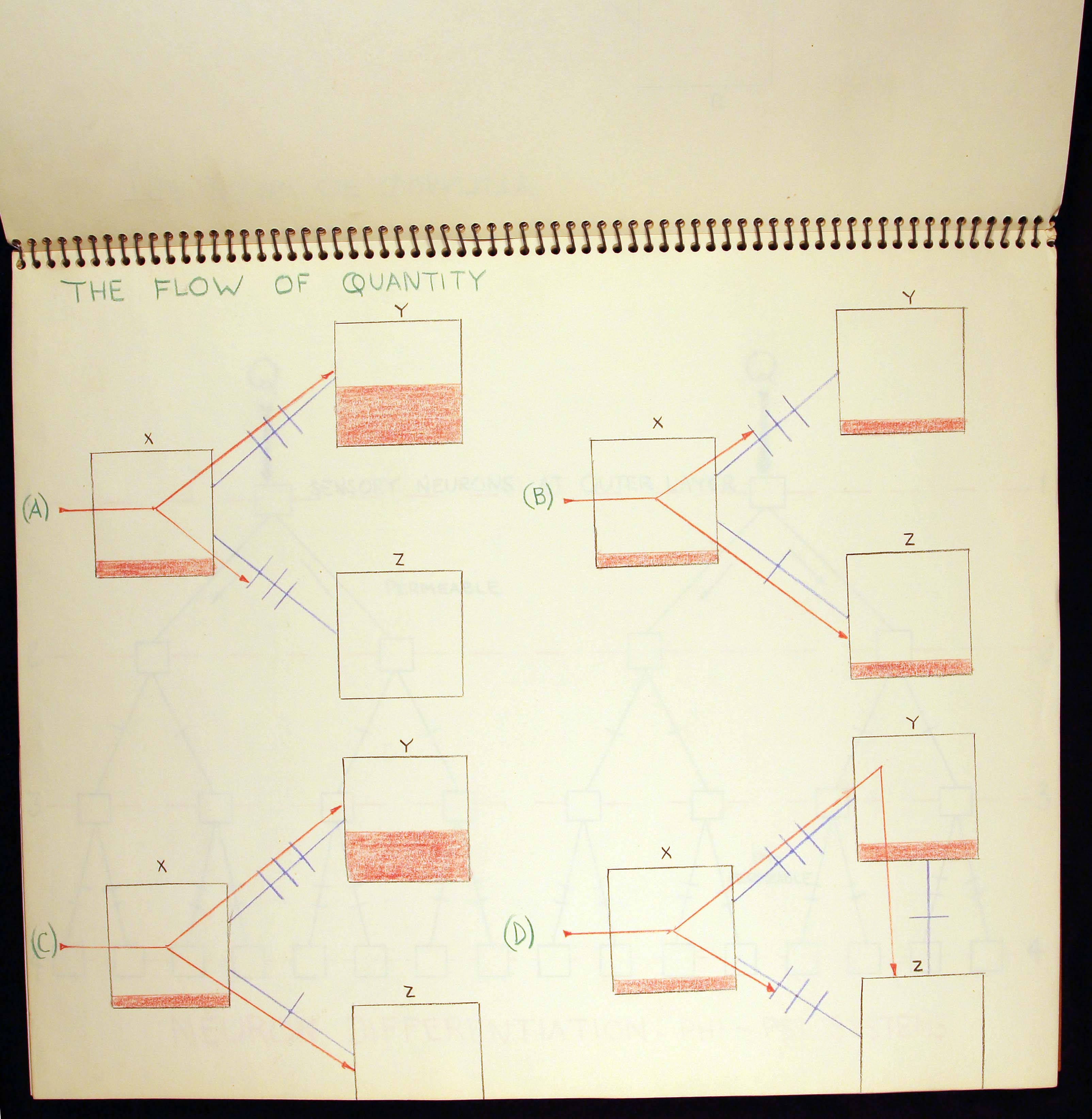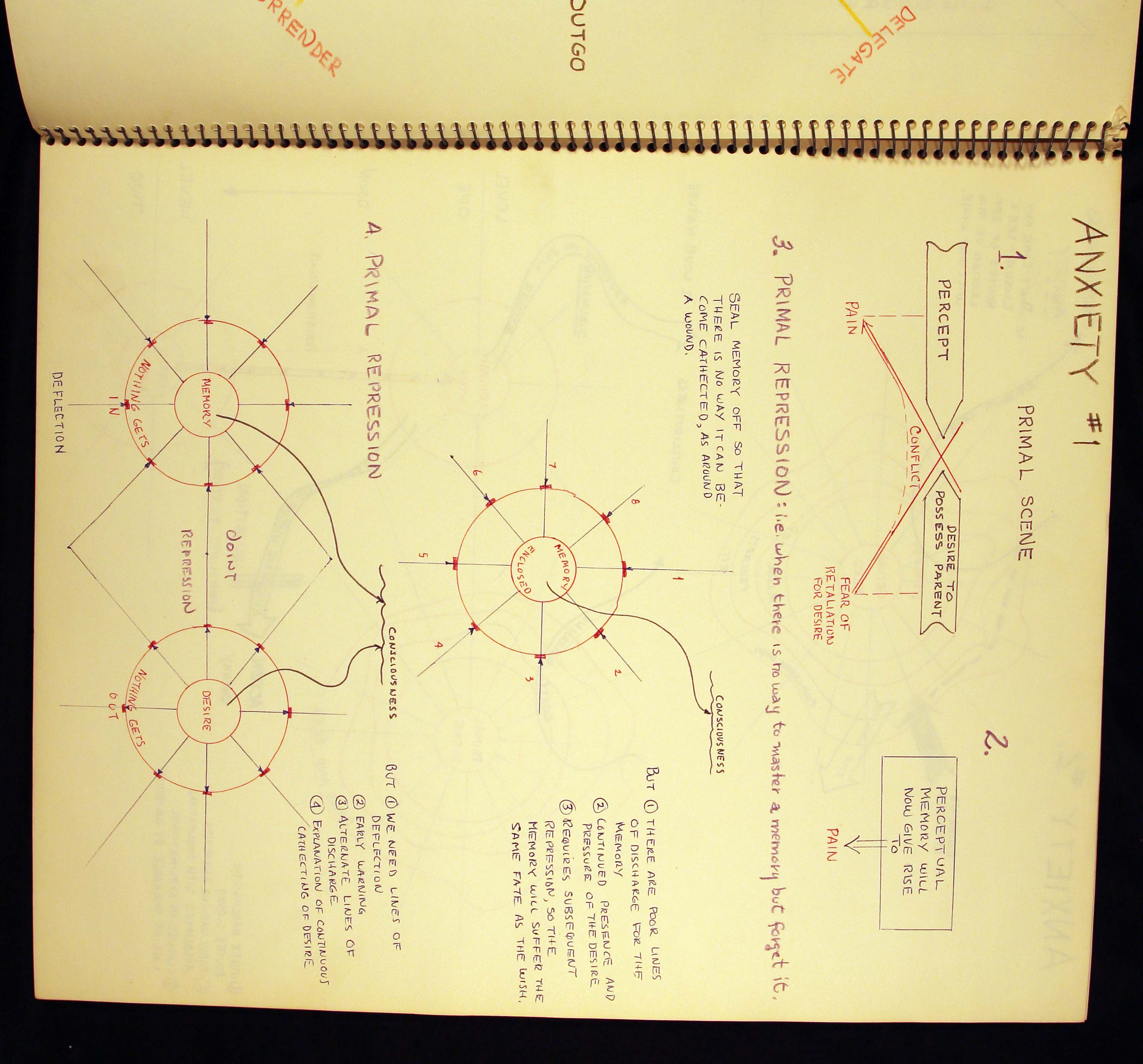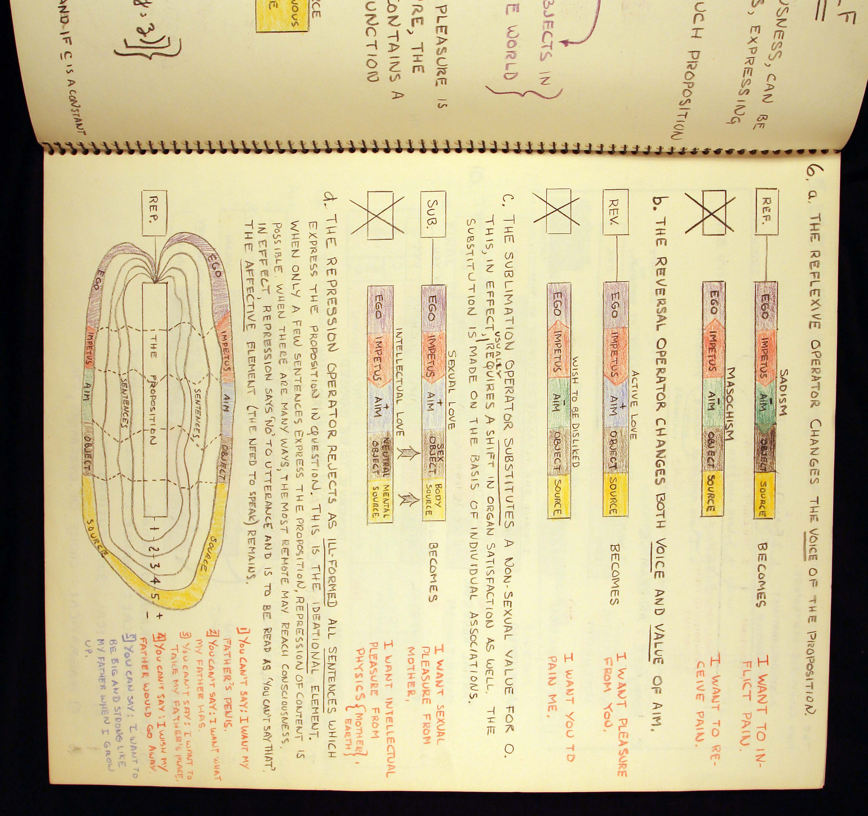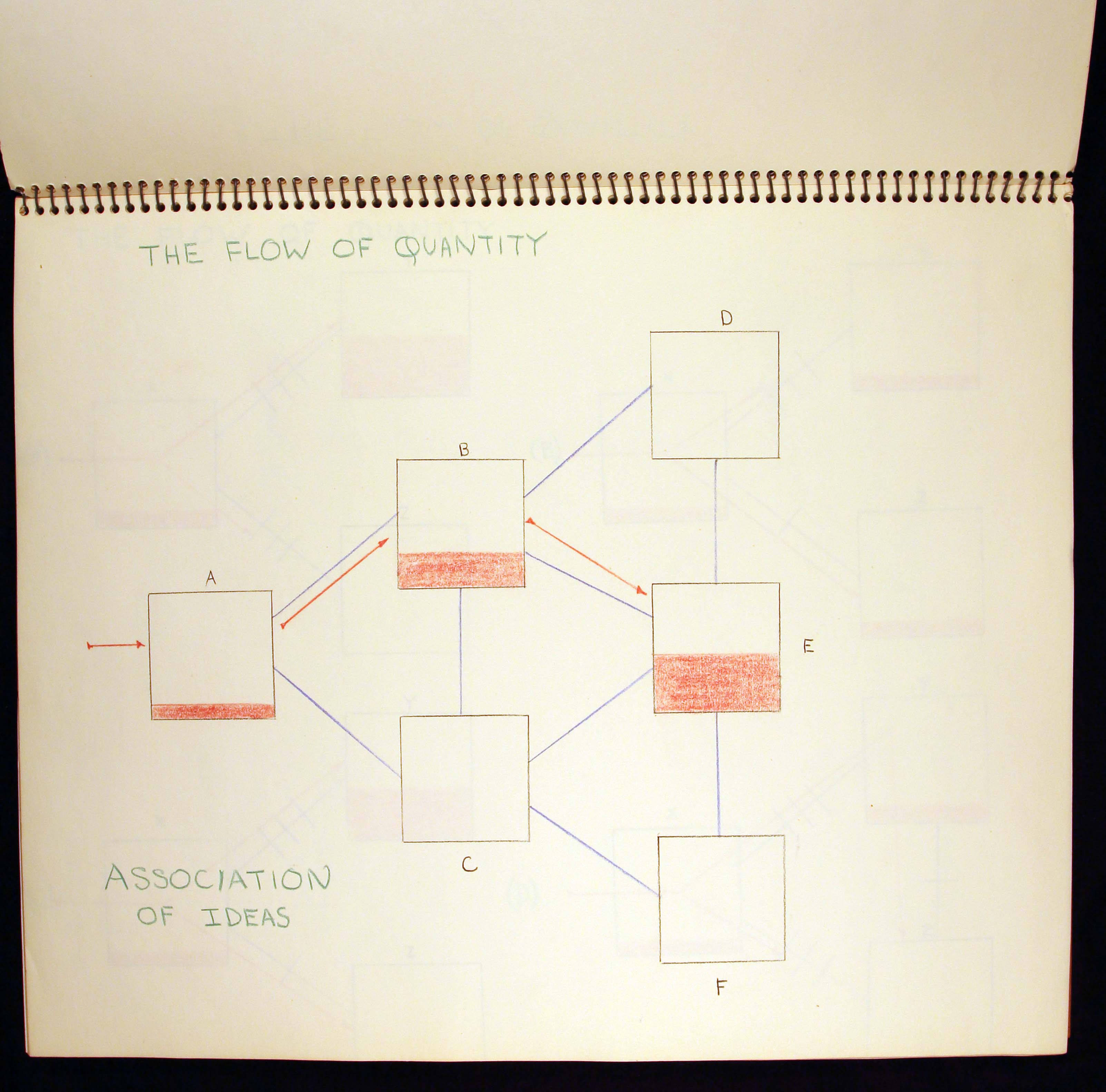 - A sketchbook full of diagrams and drawings by Gass used to illustrate concepts of consciousness related through language. This was used for seminar classes that met in Gass's home, in lieu of a chalkboard.