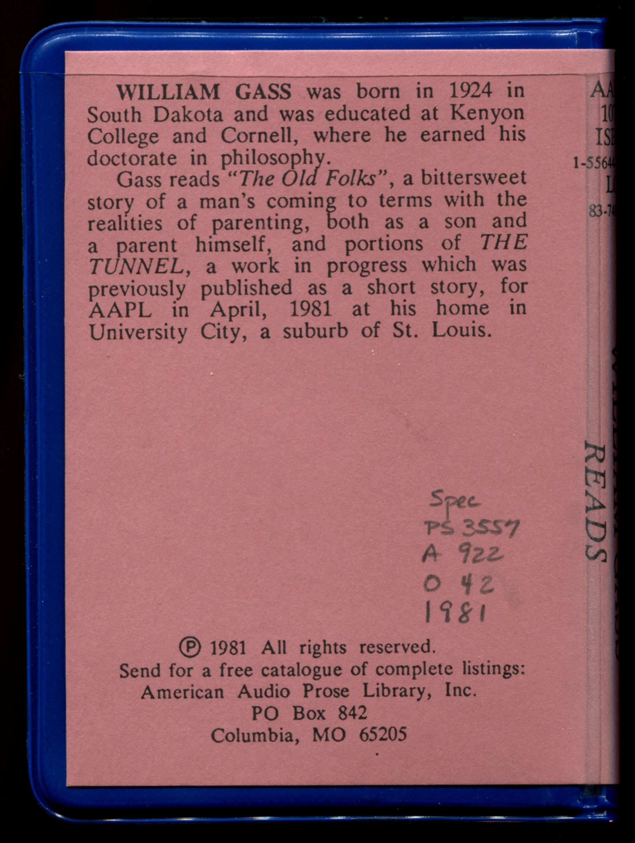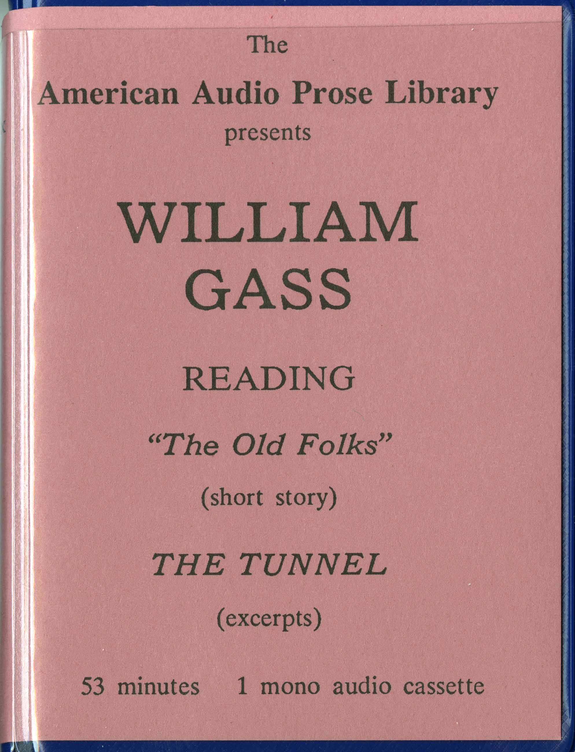 The American Audio Prose Library. 1980. “Cassette Tape Cover for William Gass Reading ‘The Old Folks’”. The American Audio Prose Library, William H. Gass: The Soul Inside the Sentence, accessed February 11, 2026, https://digitalexhibits.library.wustl.edu/s/gass/item/15606