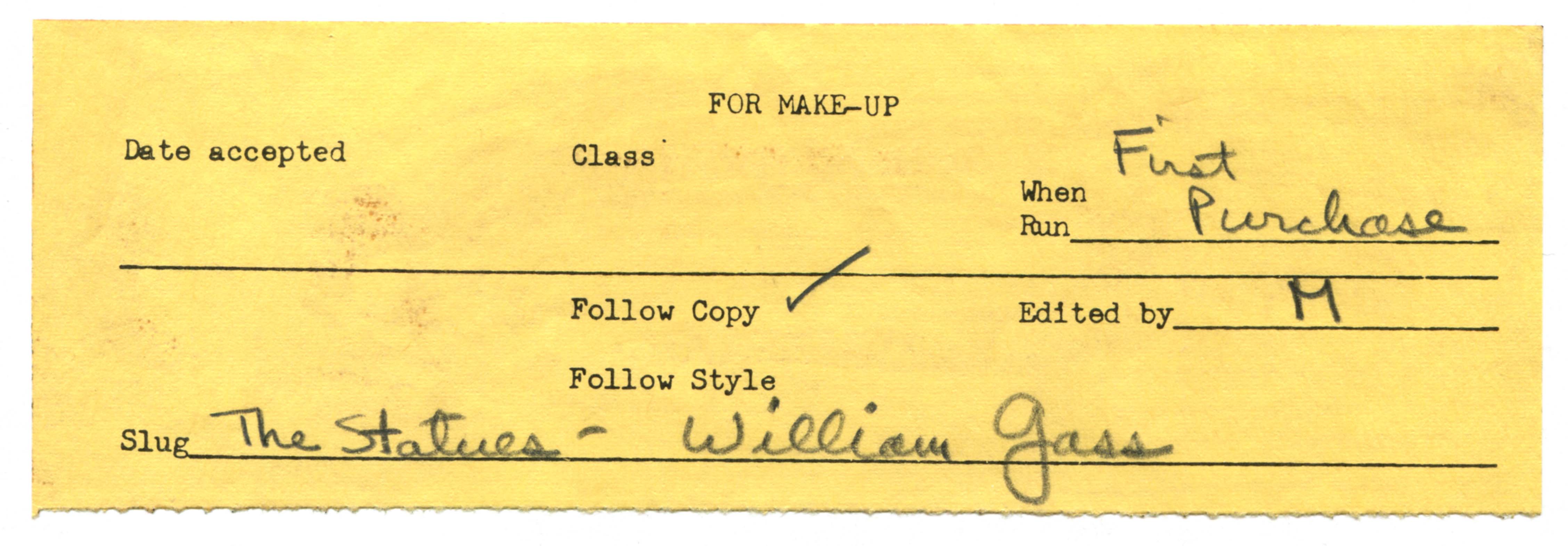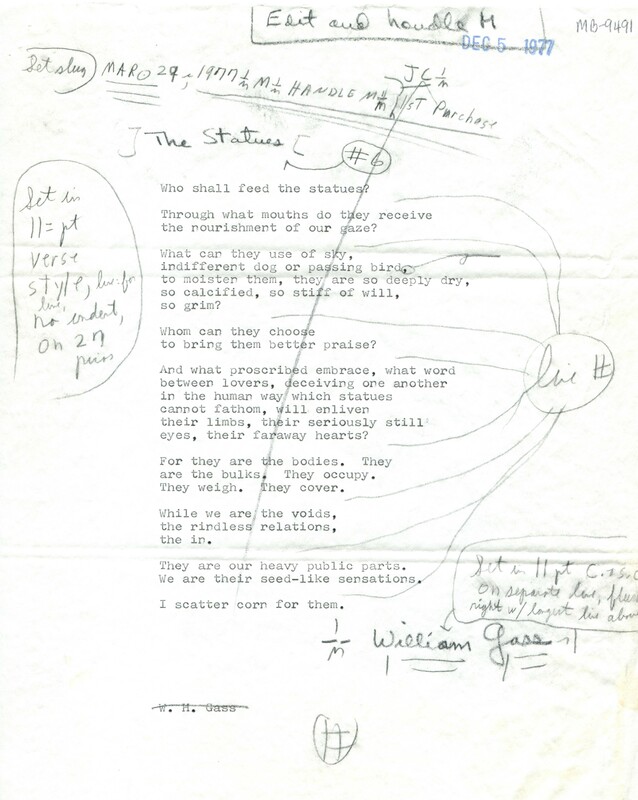 Gass, William H. 1977. “‘The Statues’”. The New Yorker, William H. Gass: The Soul Inside the Sentence, accessed February 13, 2026, https://digitalexhibits.library.wustl.edu/s/gass/item/15617