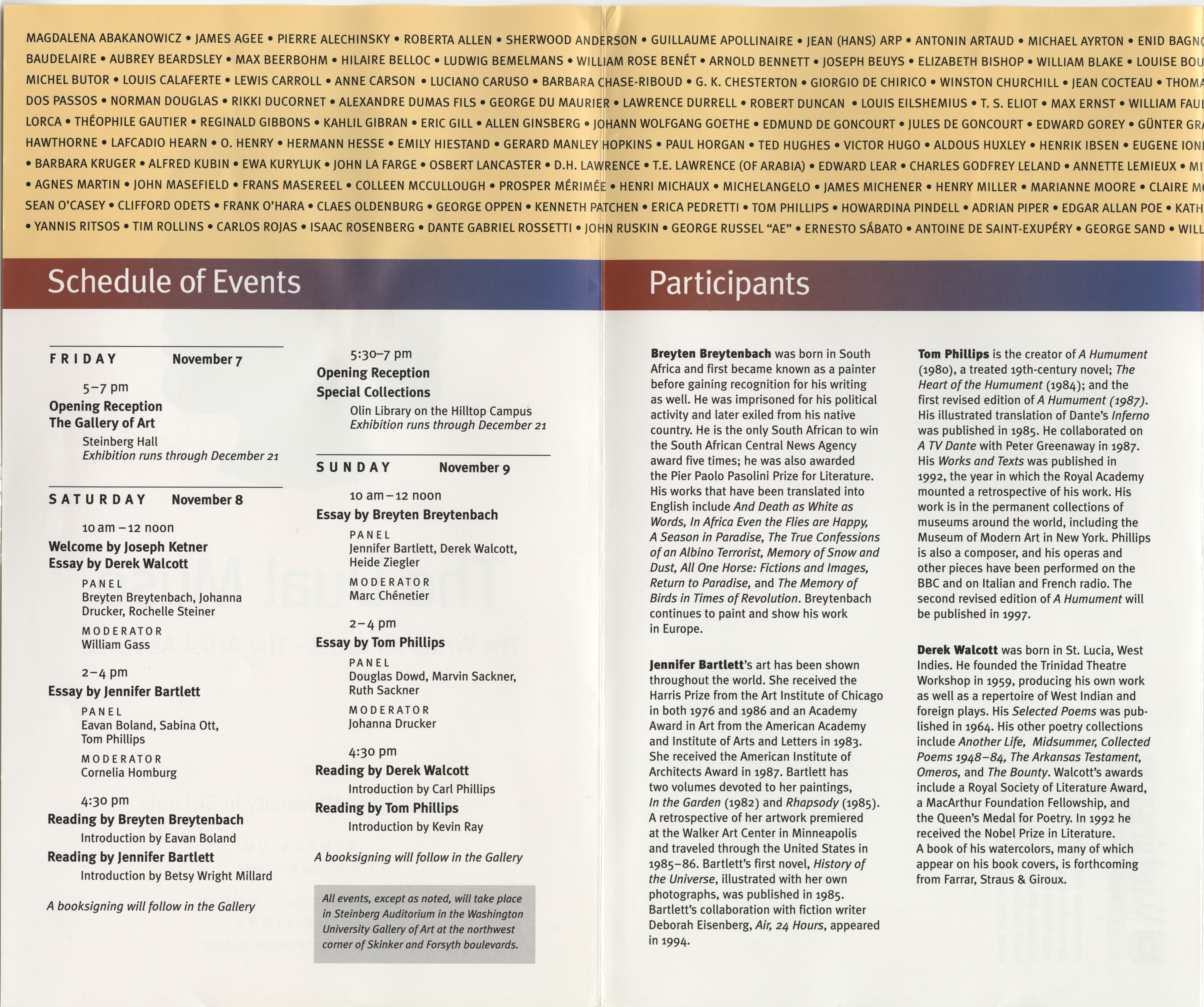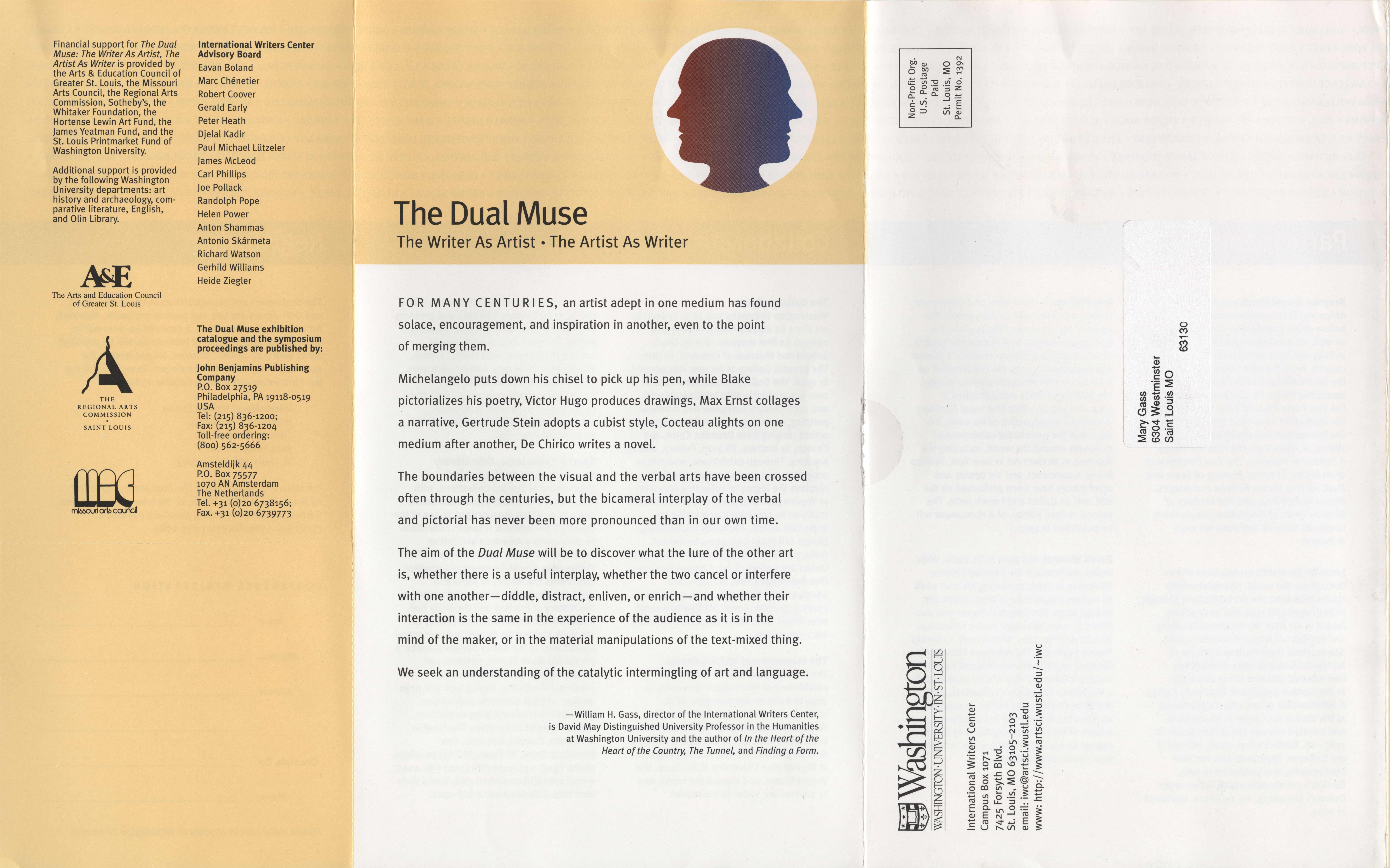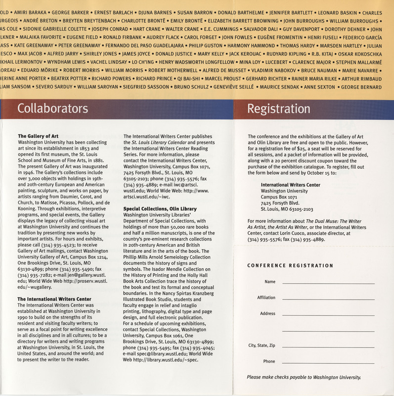 International Writers Center, Washington University Gallery of Art, Washington University Special Collections. 1997. “The Dual Muse: The Writer As Artist, The Artist As Writer Advertisement.”, William H. Gass: The Soul Inside the Sentence, accessed February 11, 2026, https://digitalexhibits.library.wustl.edu/s/gass/item/15810