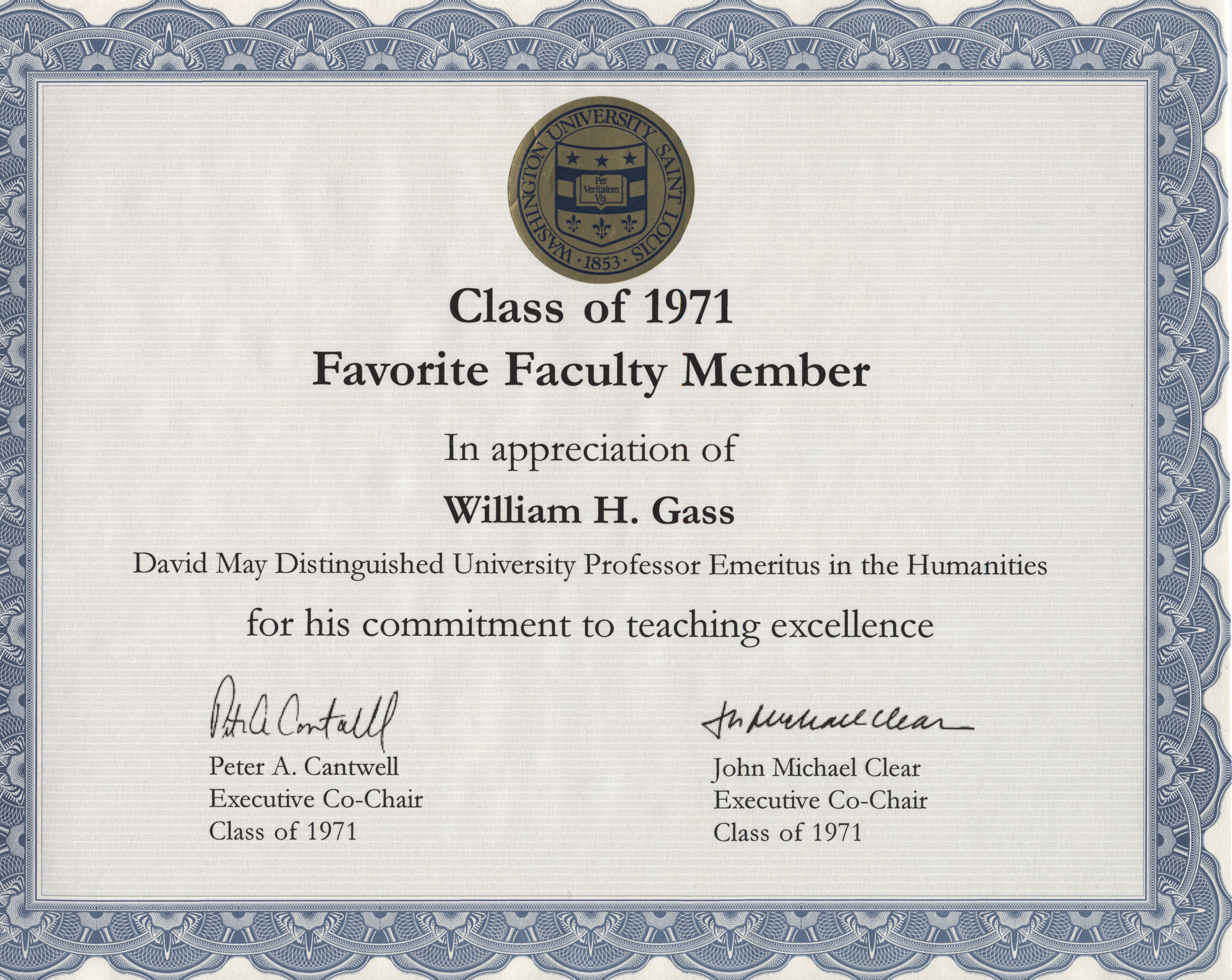Washington University Class of 1971. 1970. “Washington University Class of 1971 Favorite Faculty Member Award.”, William H. Gass: The Soul Inside the Sentence, accessed February 10, 2026, https://digitalexhibits.library.wustl.edu/s/gass/item/15820