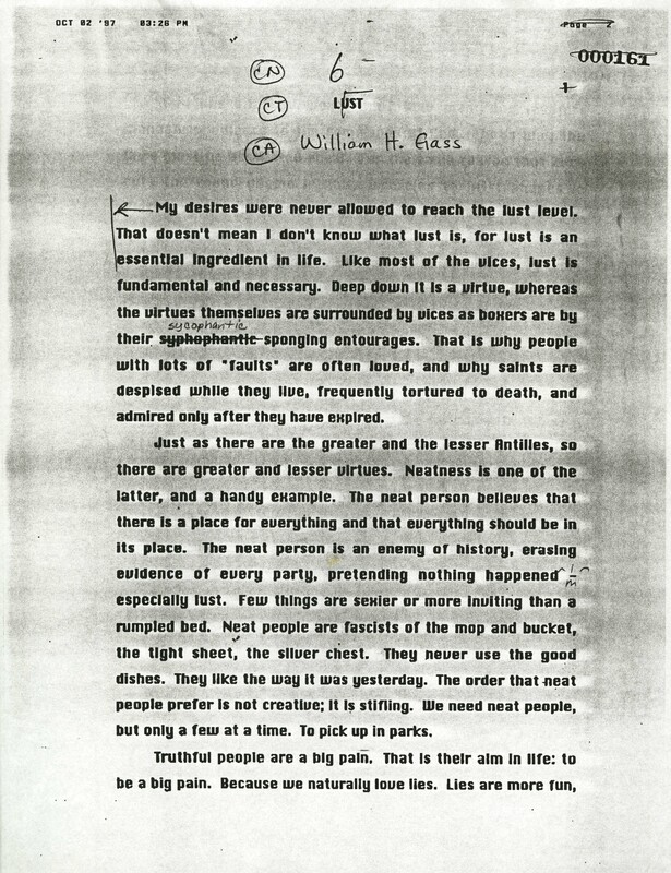 Gass, William H. 1997. “‘Lust’ - Faxed Draft Photocopy.”, William H. Gass: The Soul Inside the Sentence, accessed February 12, 2026, https://digitalexhibits.library.wustl.edu/s/gass/item/16343