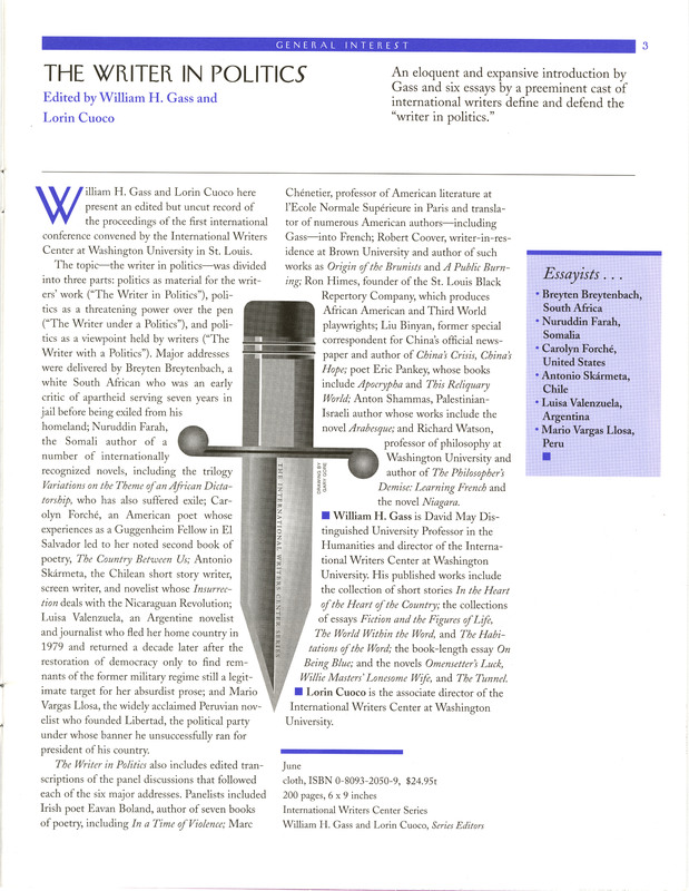 “Advertisement for The Writer in Politics Book”. 1995, William H. Gass: The Soul Inside the Sentence, accessed February 11, 2026, https://digitalexhibits.library.wustl.edu/s/gass/item/38739