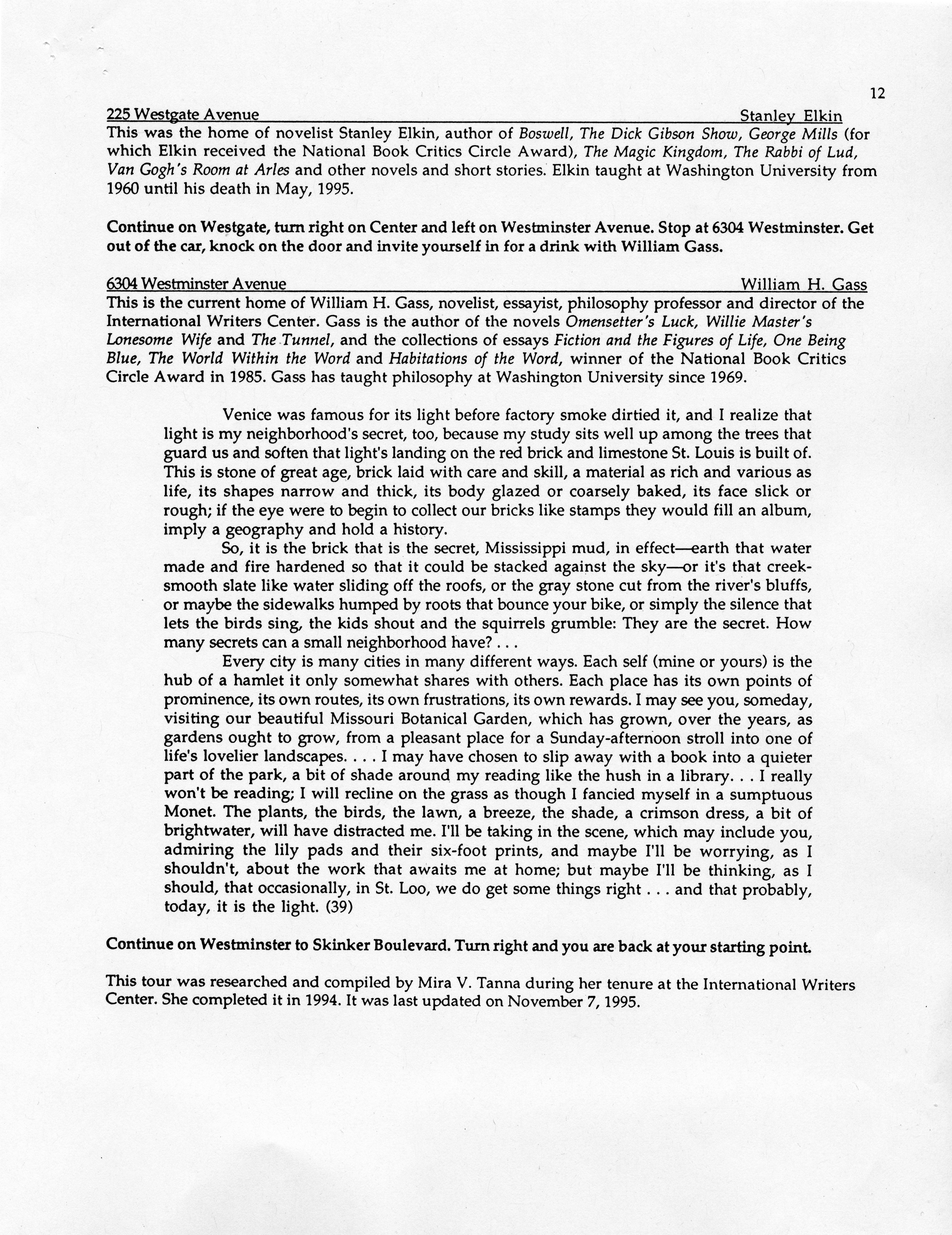 Tanna, Mira V. n.d. “Itinerary.”, William H. Gass: The Soul Inside the Sentence, accessed February 12, 2026, https://digitalexhibits.library.wustl.edu/s/gass/item/38742