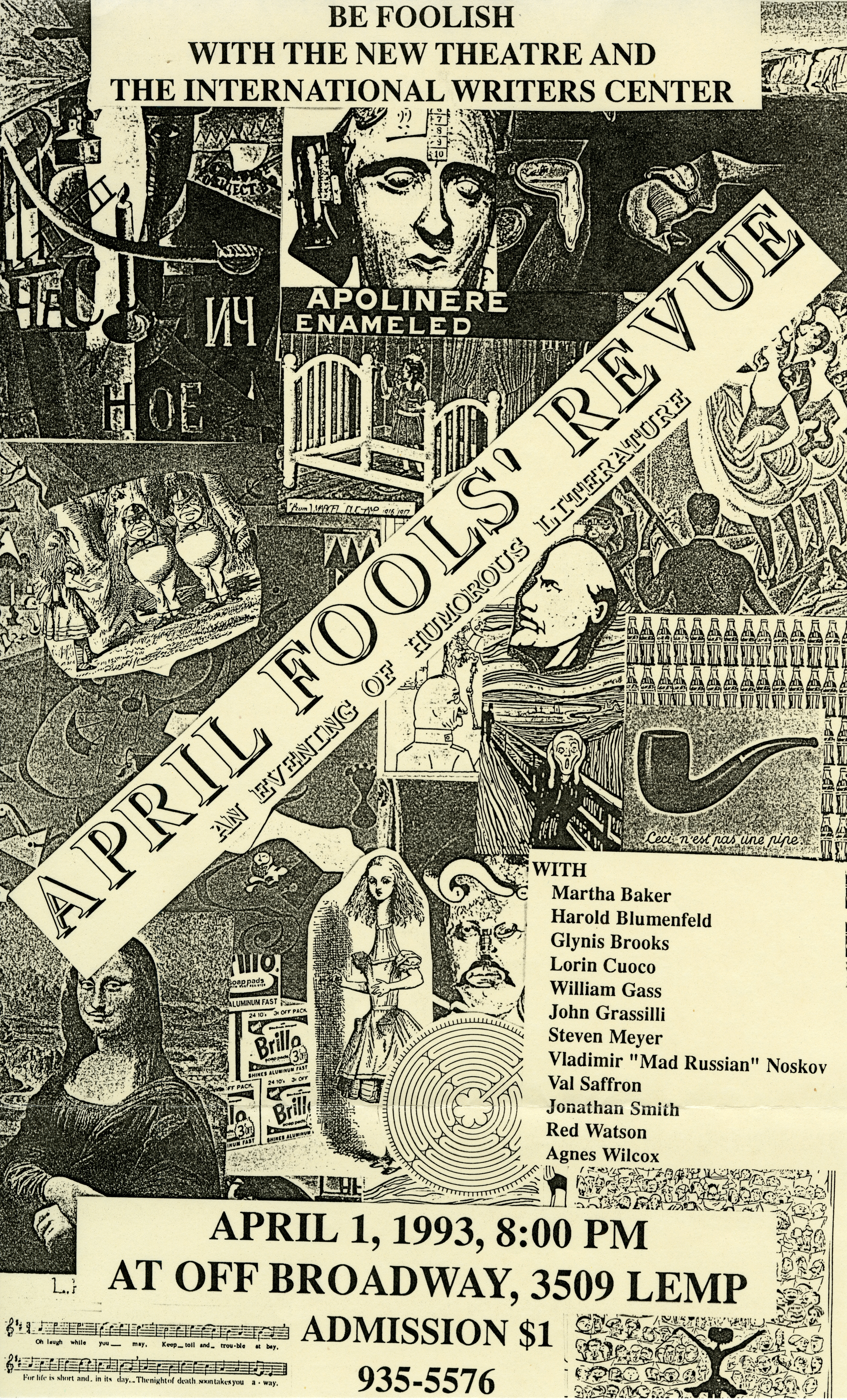 International Writers Center. 1992. “International Writers Center Event Poster for April Fool’s Revue.”, William H. Gass: The Soul Inside the Sentence, accessed February 10, 2026, https://digitalexhibits.library.wustl.edu/s/gass/item/38987