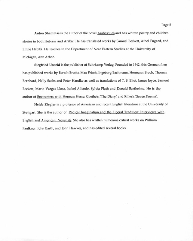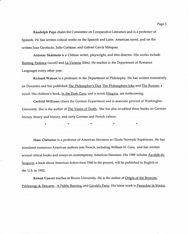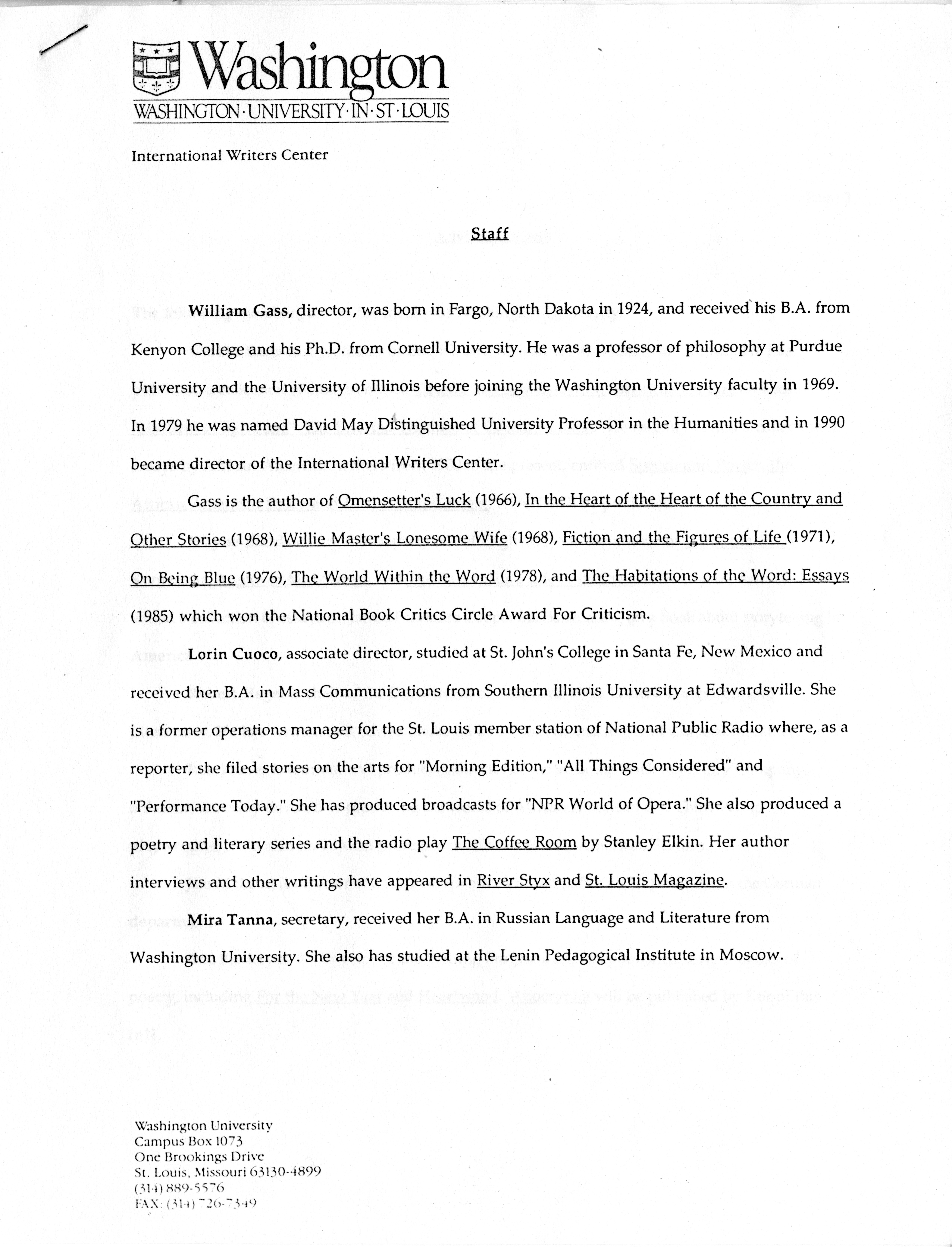 International Writers Center. n.d. “International Writers Center Staff and Advisory Board.”, William H. Gass: The Soul Inside the Sentence, accessed February 11, 2026, https://digitalexhibits.library.wustl.edu/s/gass/item/38993