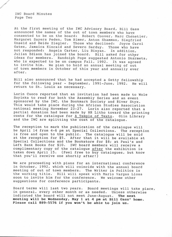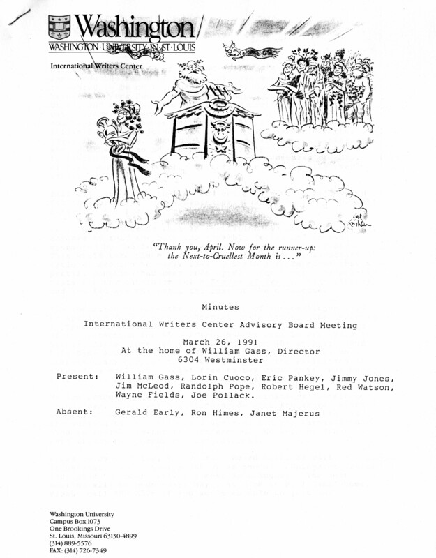 International Writers Center. 1991. “International Writers Center First Advisory Board Meeting Minutes.”, William H. Gass: The Soul Inside the Sentence, accessed February 11, 2026, https://digitalexhibits.library.wustl.edu/s/gass/item/38994