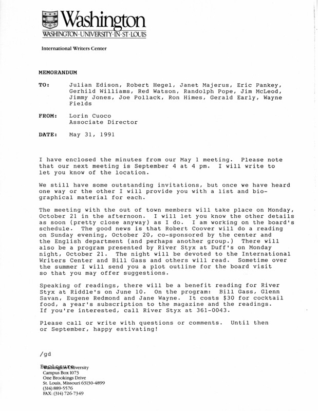 Lorin Cuoco. 1991. “International Writers Center Memorandum.”, William H. Gass: The Soul Inside the Sentence, accessed February 11, 2026, https://digitalexhibits.library.wustl.edu/s/gass/item/38996