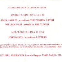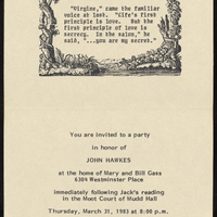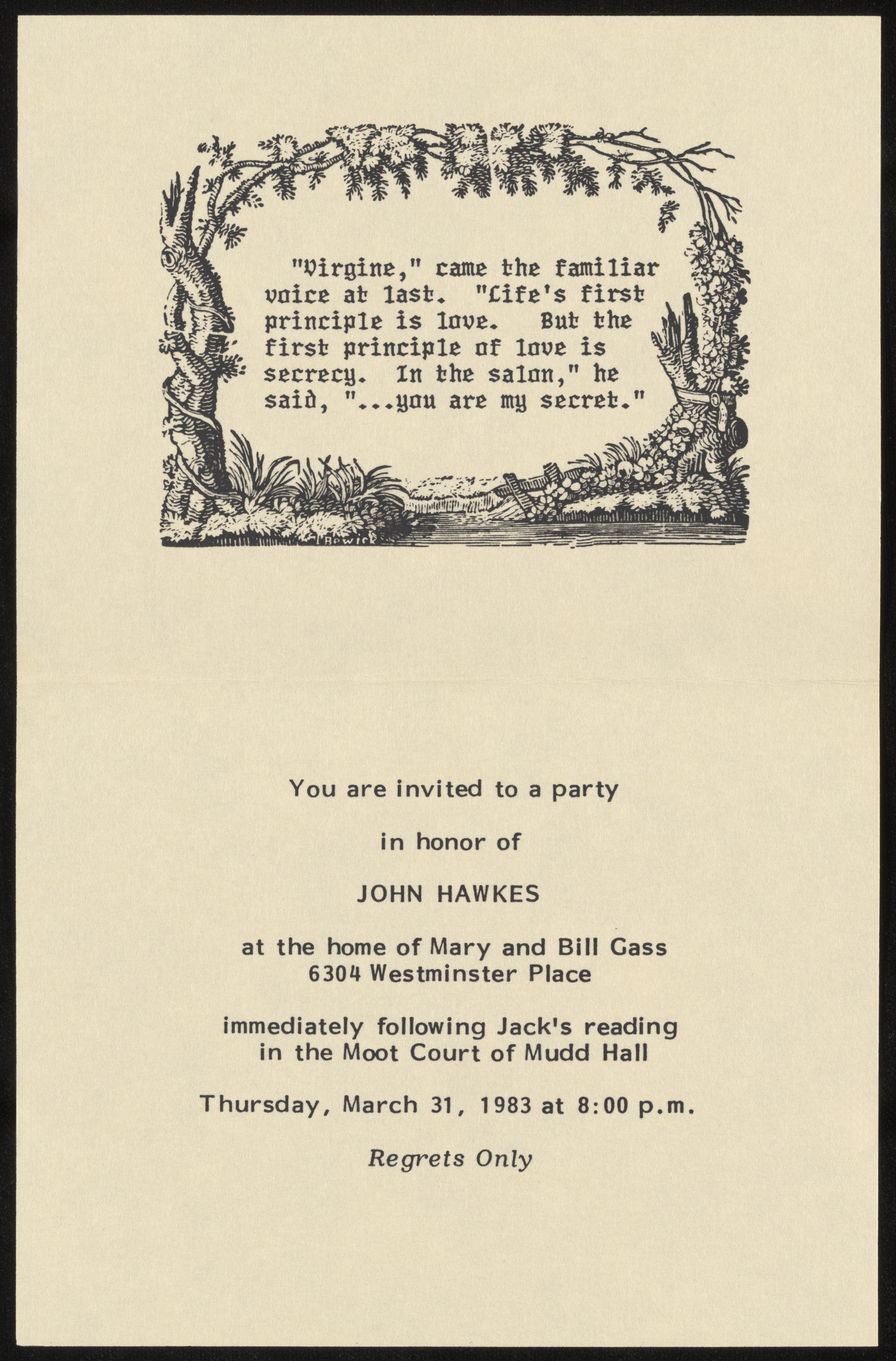 Gass, Mary. 1983. “Party Invitation in Honor of John Hawkes”. Party Invitation in Honor of John Hawkes. Presented at the, William H. Gass: The Soul Inside the Sentence, accessed February 11, 2026, https://digitalexhibits.library.wustl.edu/s/gass/item/57378