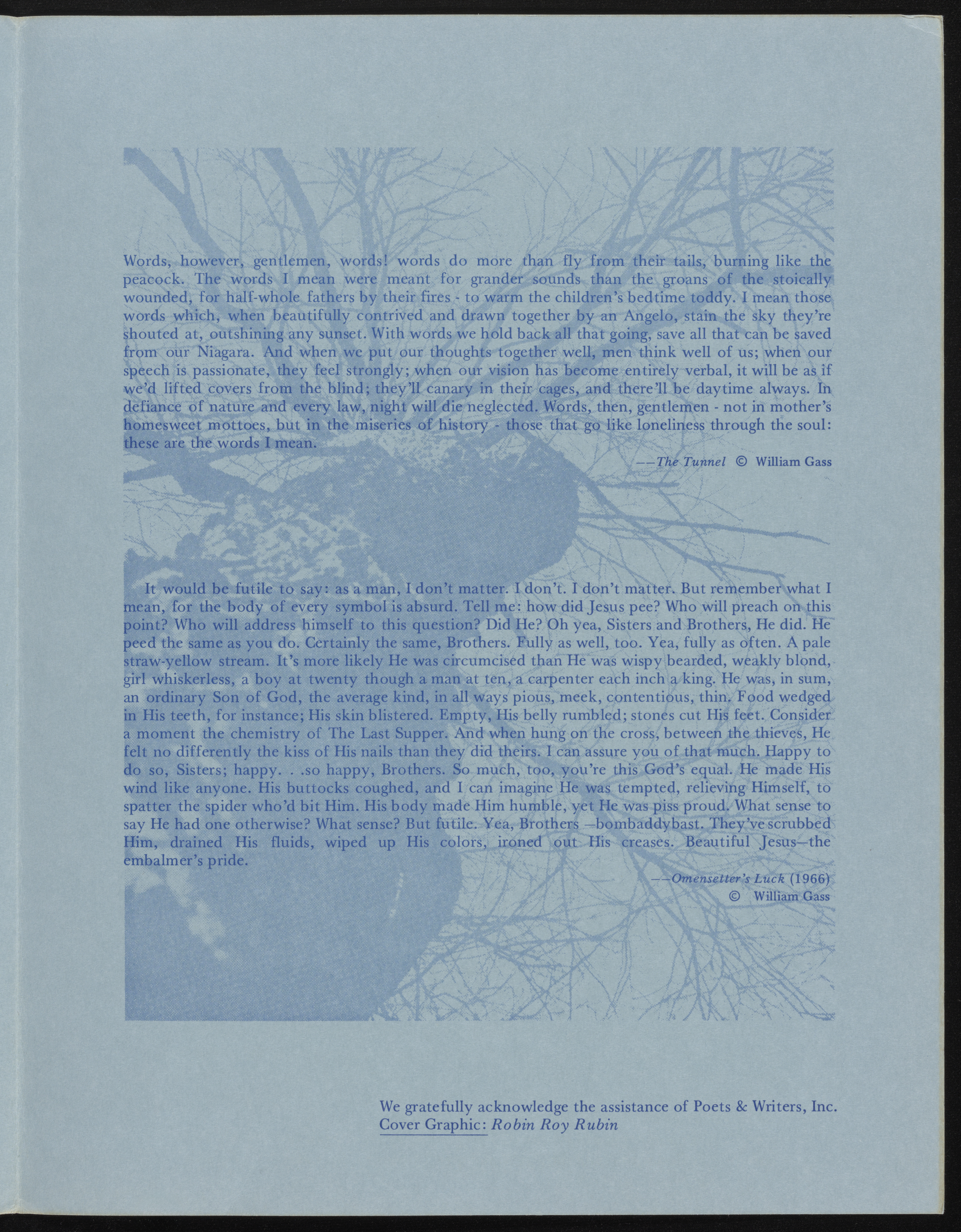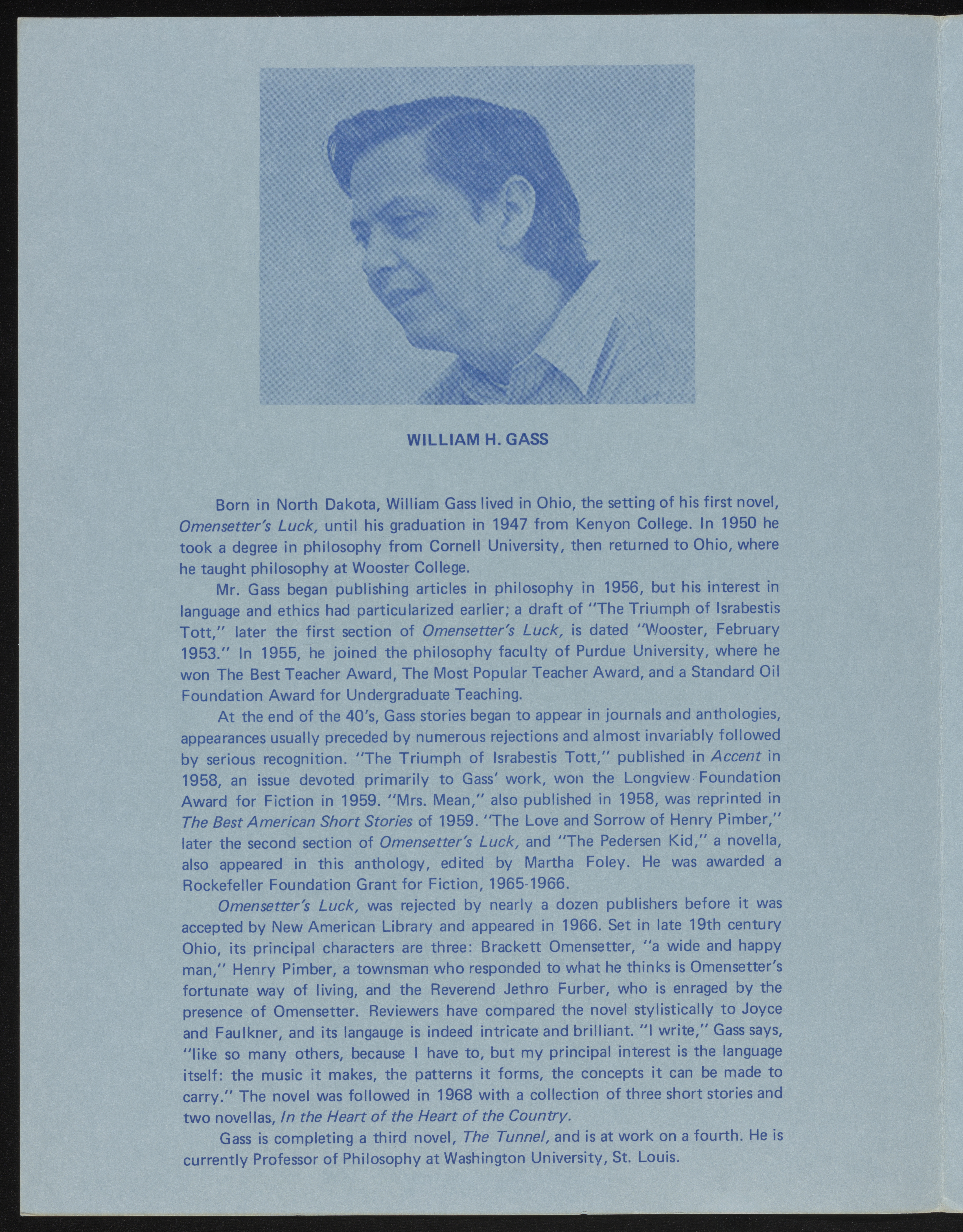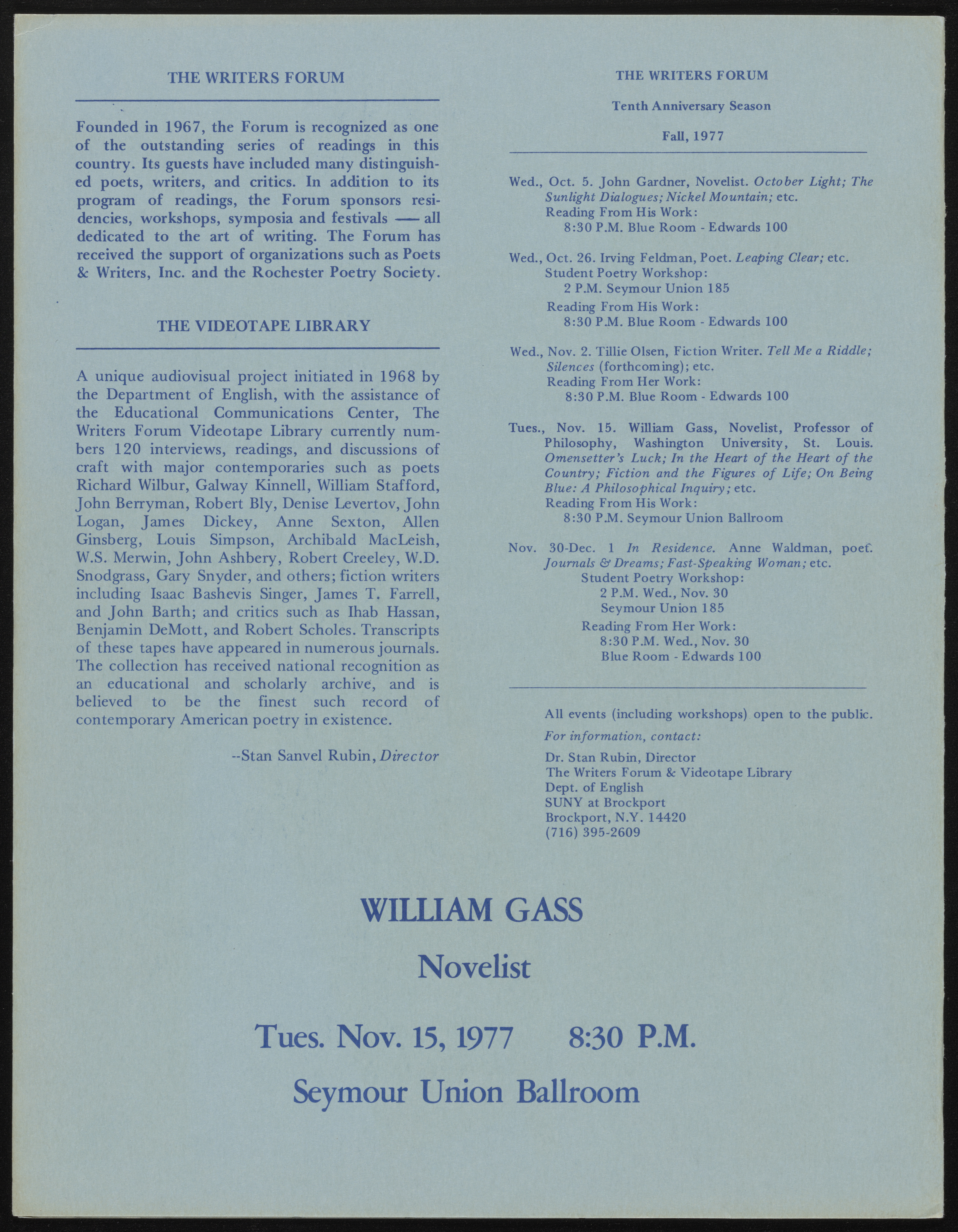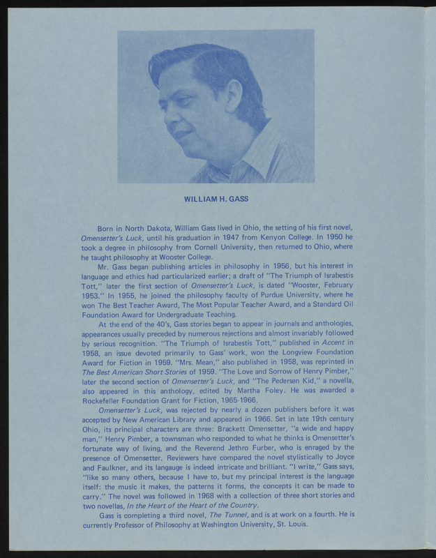 State University of New York College at Brockport. 1976. The Writer’s Forum, 10th Anniversary Season, Fall 1977. State University of New York College at Brockport, William H. Gass: The Soul Inside the Sentence, accessed February 11, 2026, https://digitalexhibits.library.wustl.edu/s/gass/item/57384