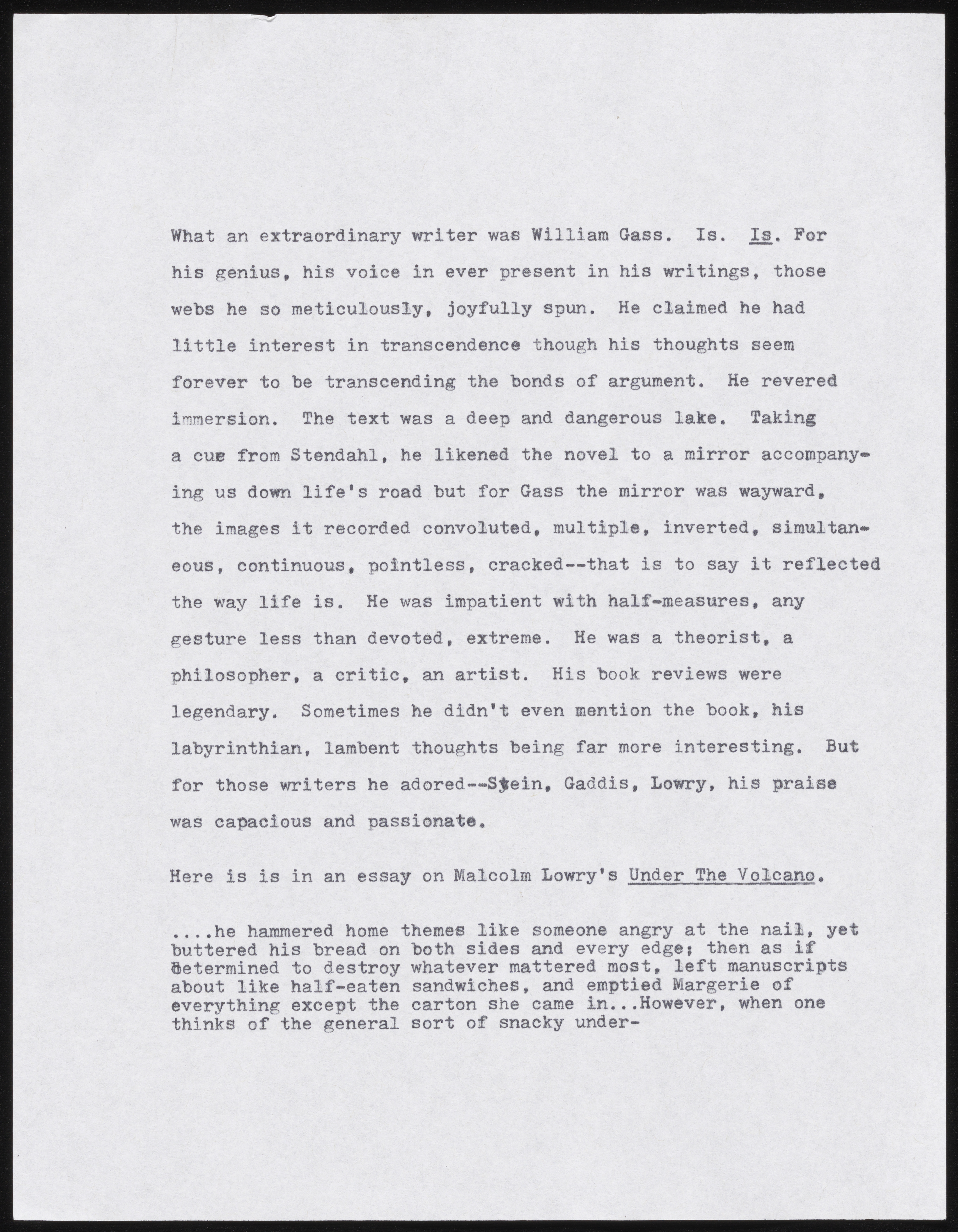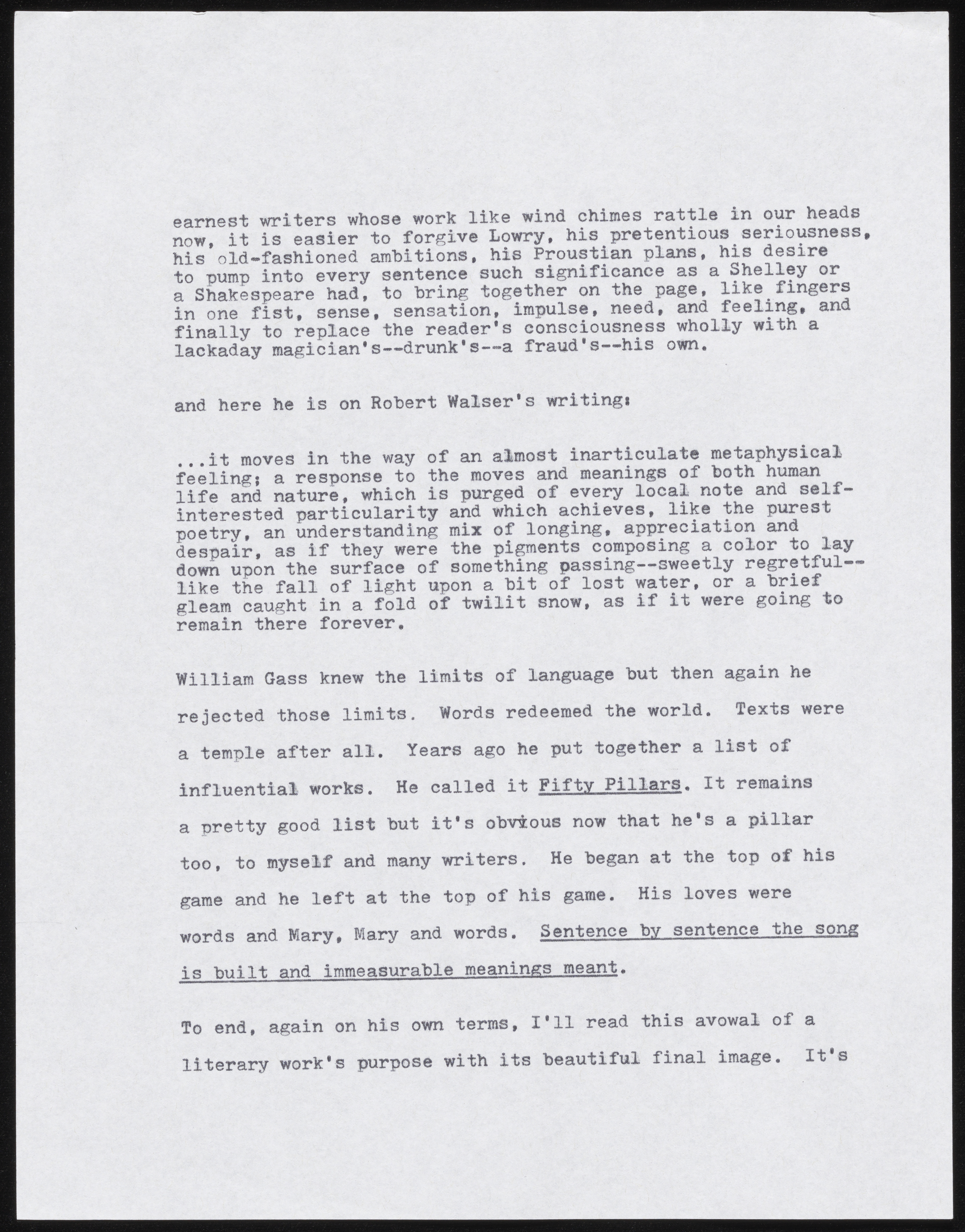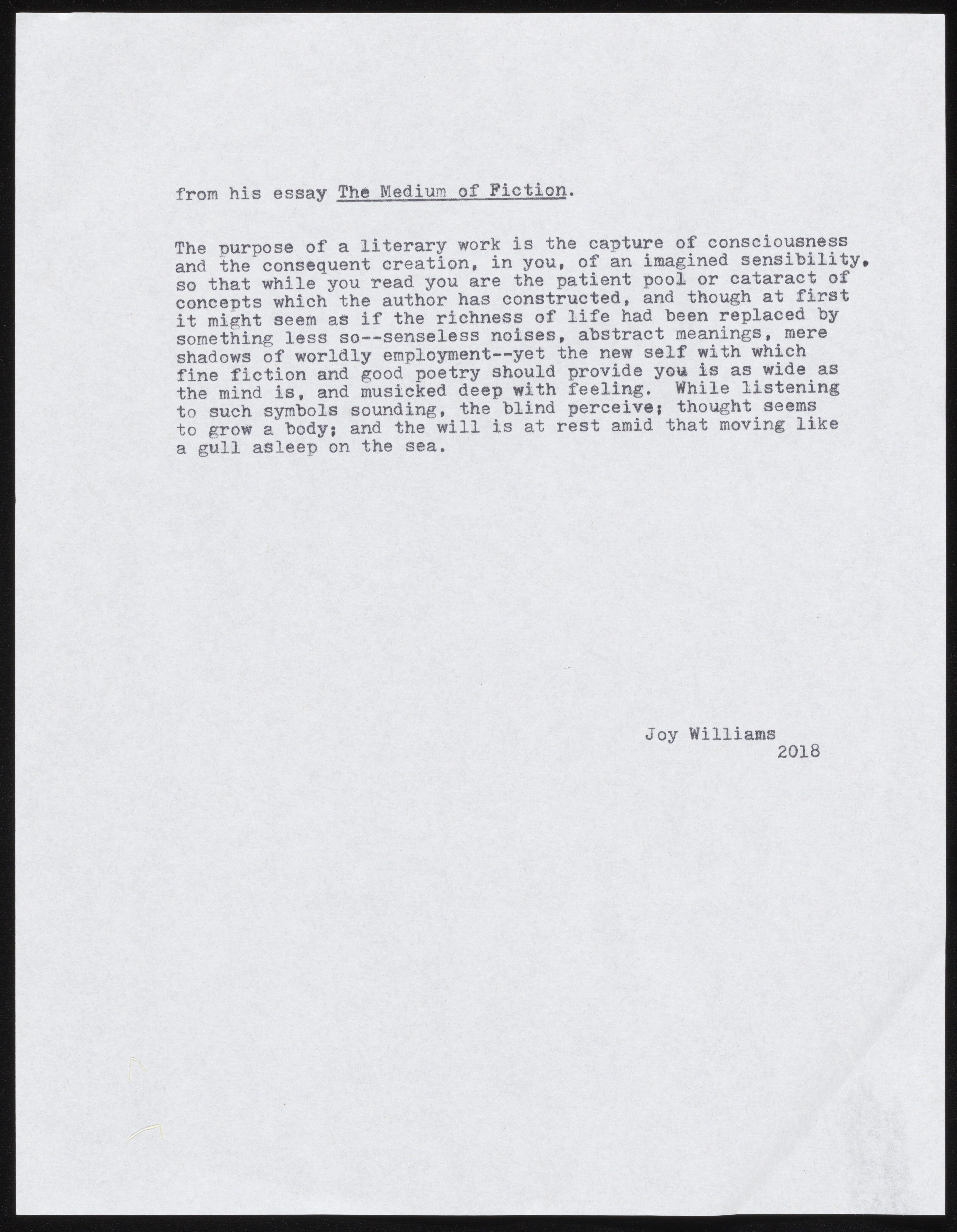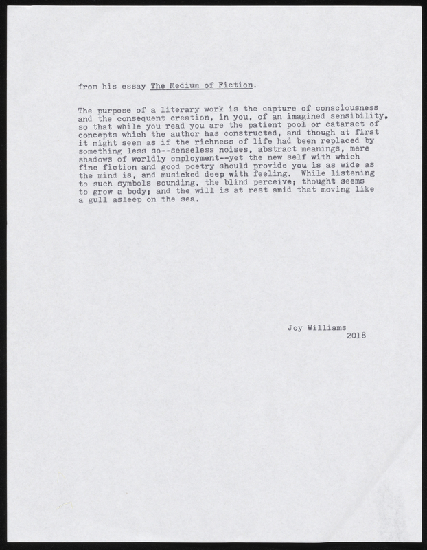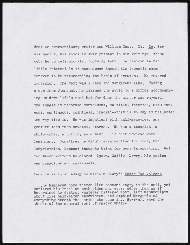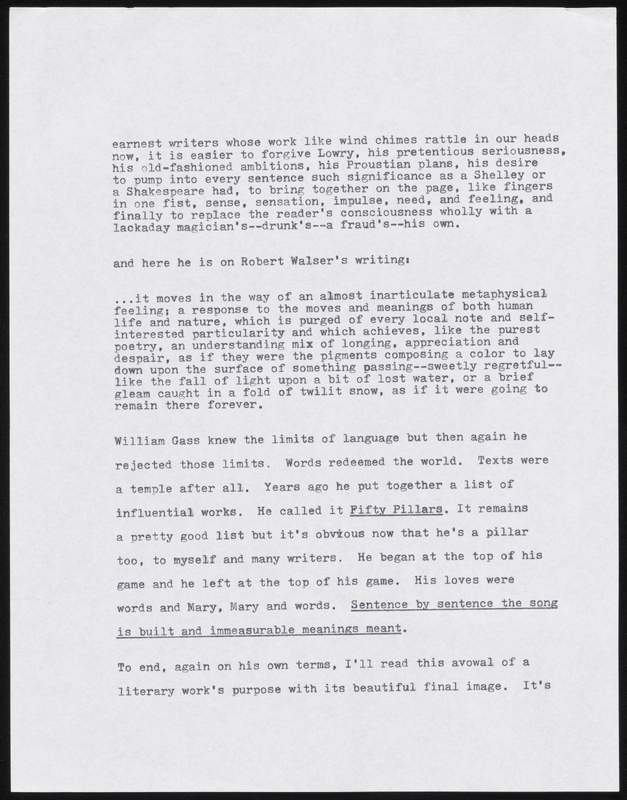 Joy Williams’ Untitled Gass Tribute Remarks. 2018. William H. Gass: His Life and Legacy Video Playlist, William H. Gass: The Soul Inside the Sentence, accessed February 11, 2026, https://digitalexhibits.library.wustl.edu/s/gass/item/57407
