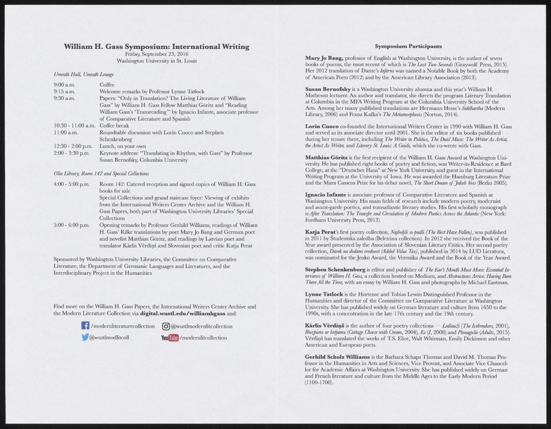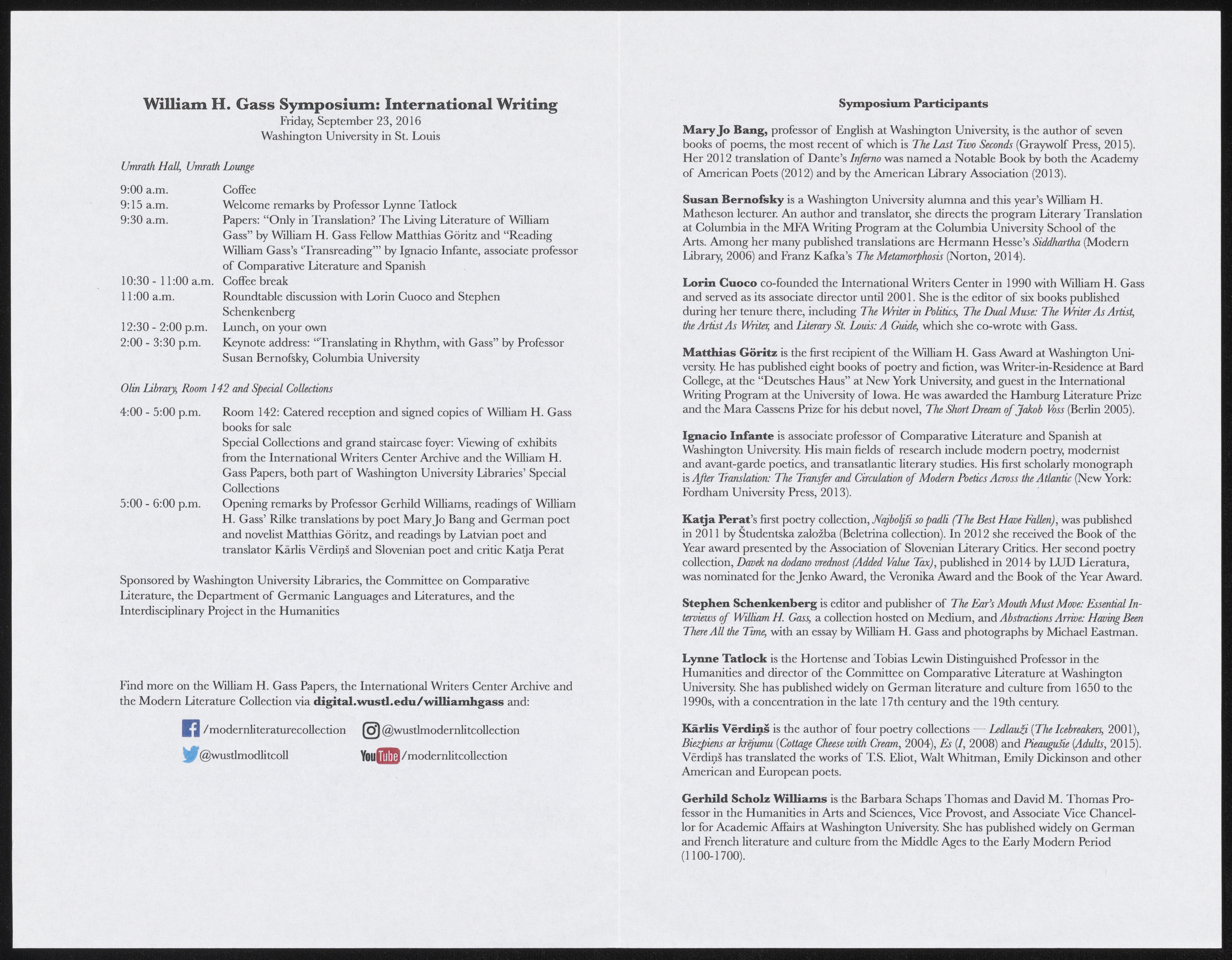 Washington University. 2016. William H. Gass Symposium: International Writing - Program, William H. Gass: The Soul Inside the Sentence, accessed February 11, 2026, https://digitalexhibits.library.wustl.edu/s/gass/item/57421
