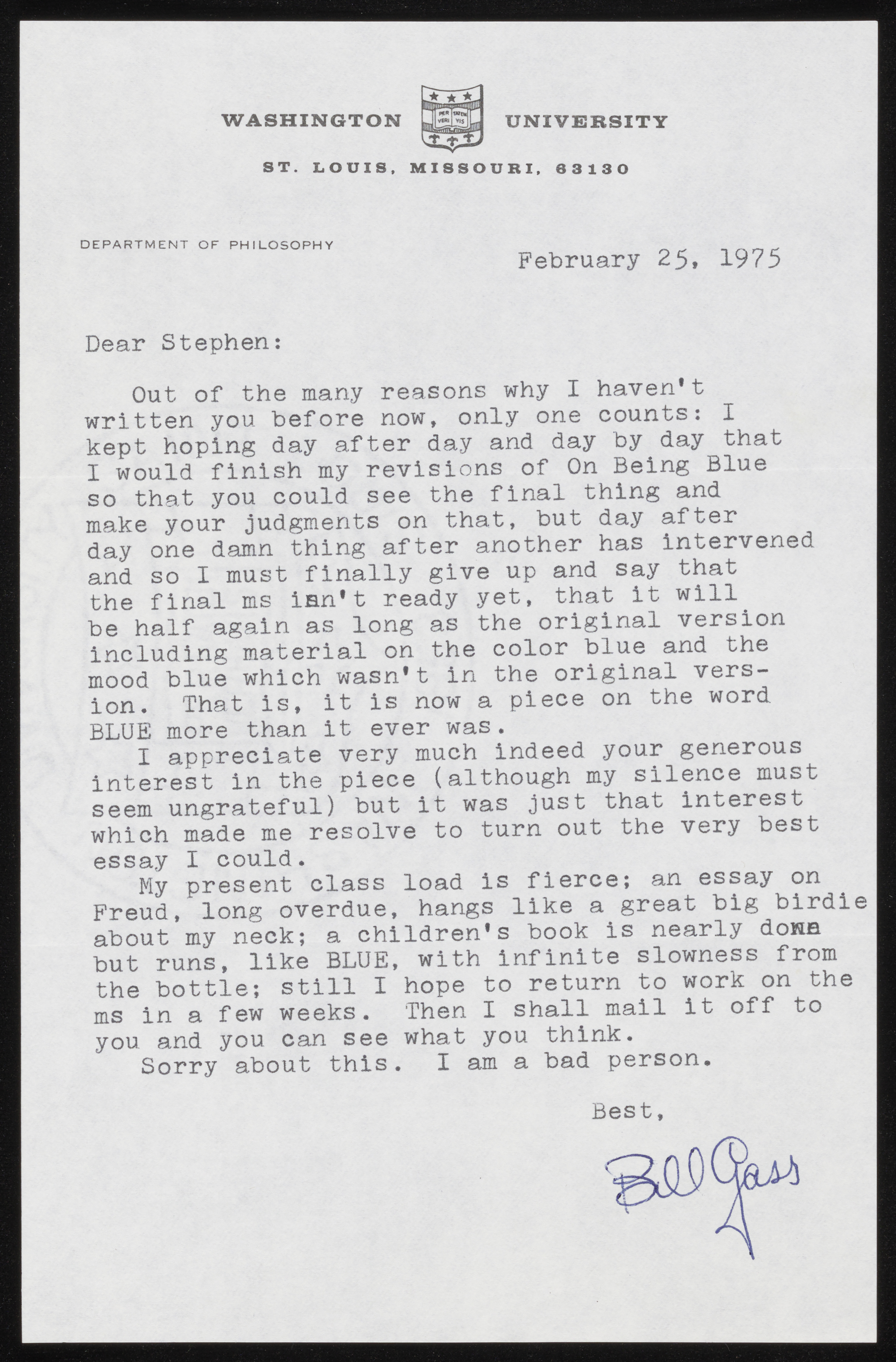 Gass, William H. 1975. William H. Gass to Stephen Brook. Nonfiction Books: On Being Blue, William H. Gass: The Soul Inside the Sentence, accessed February 10, 2026, https://digitalexhibits.library.wustl.edu/s/gass/item/57531