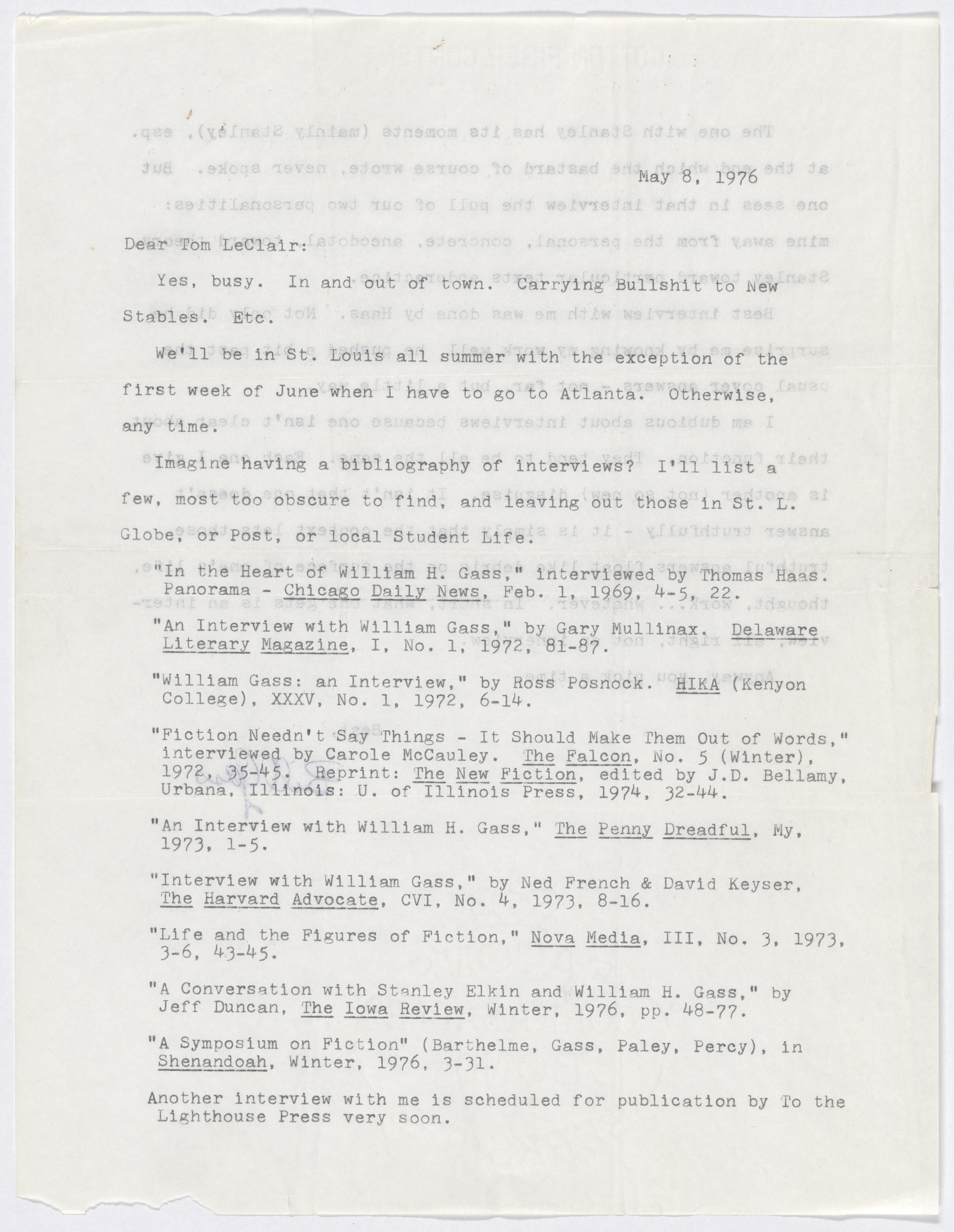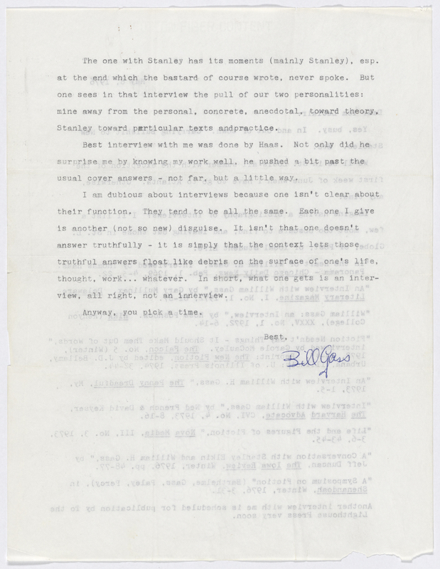 Gass, William H. 1976. William H, Gass to Tom LeClair. Interviews and Articles: Interviews, William H. Gass: The Soul Inside the Sentence, accessed February 11, 2026, https://digitalexhibits.library.wustl.edu/s/gass/item/57533