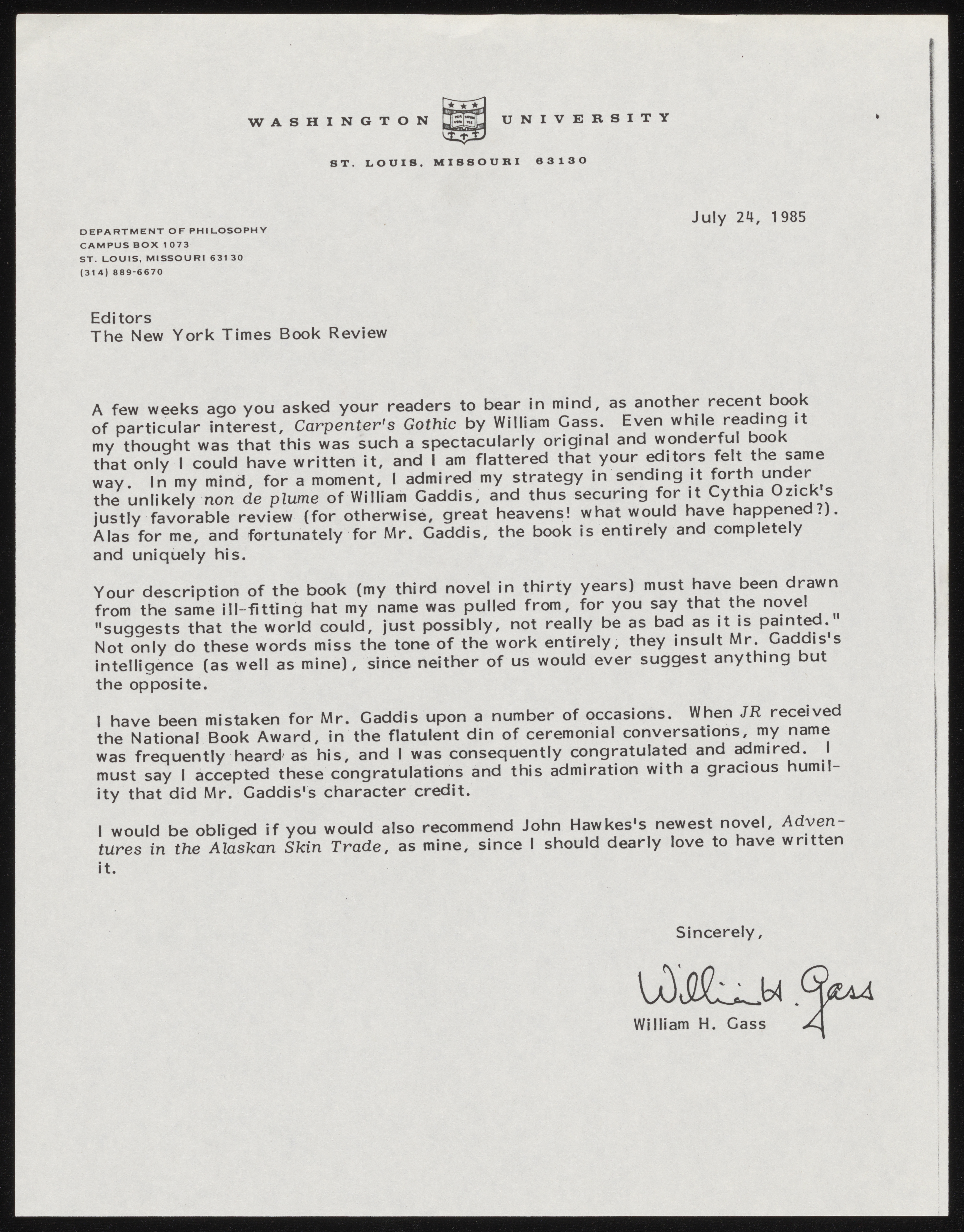 Gass, William H. 1985. William H. Gass to The New York Times Book Review. William Gaddis to William H. Gass, William H. Gass: The Soul Inside the Sentence, accessed February 10, 2026, https://digitalexhibits.library.wustl.edu/s/gass/item/57542