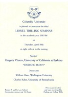 Columbia University Lionel Trilling Seminar, "Socratic Irony" Columbia University Lionel Trilling Seminar, "Socratic Irony," April 10, 1986. -